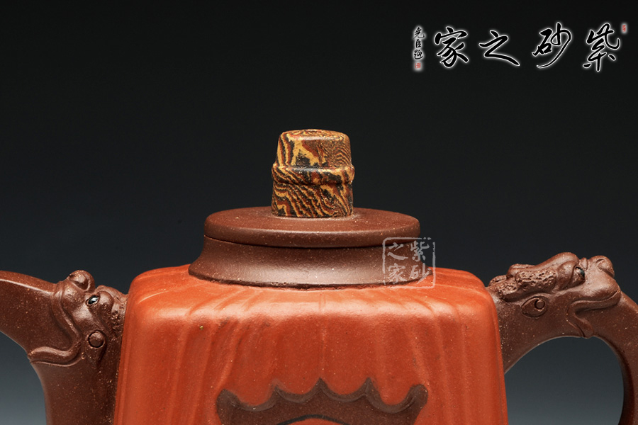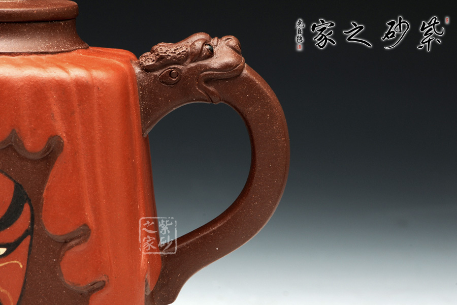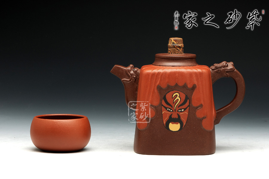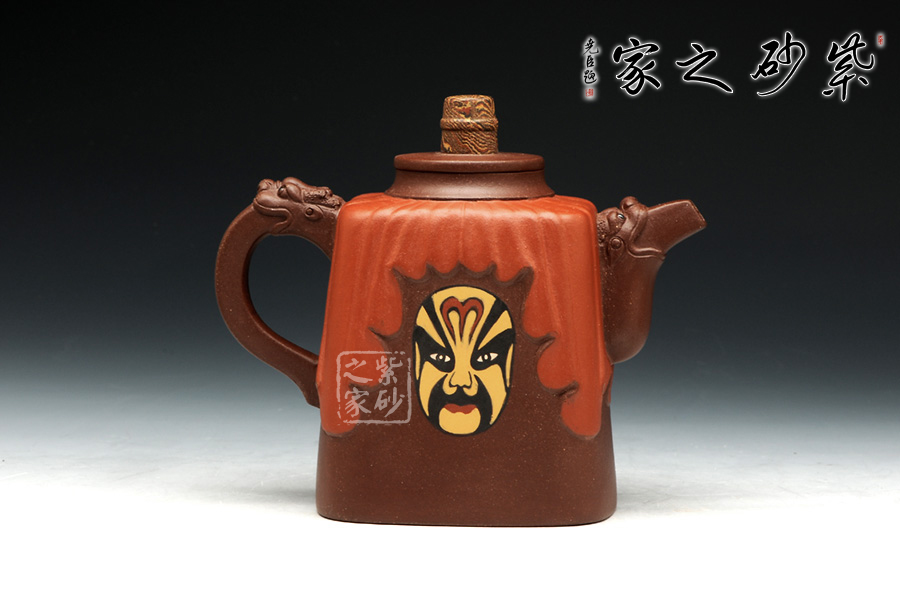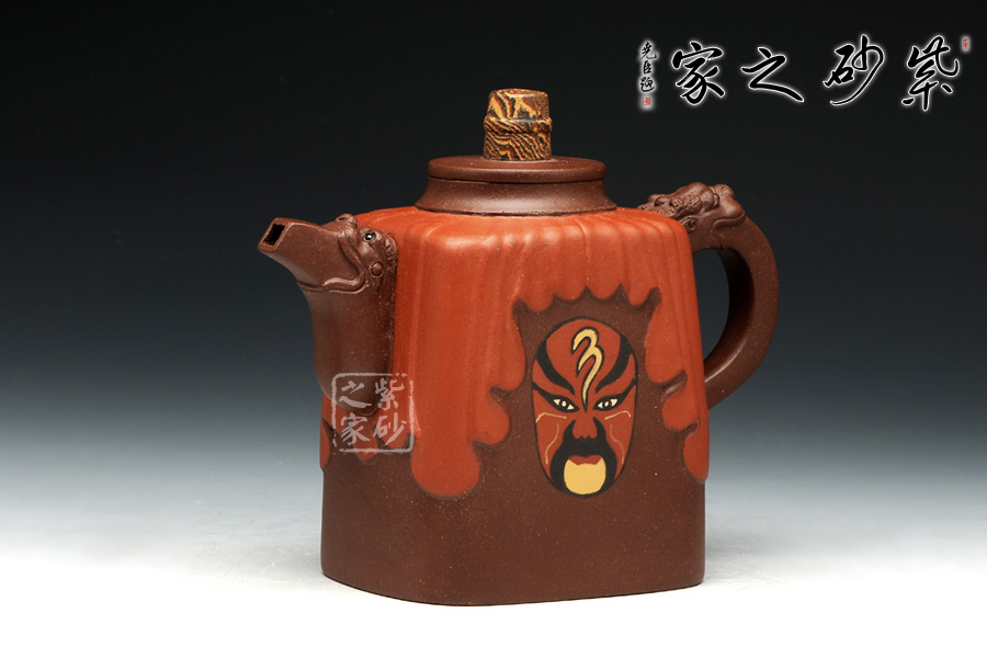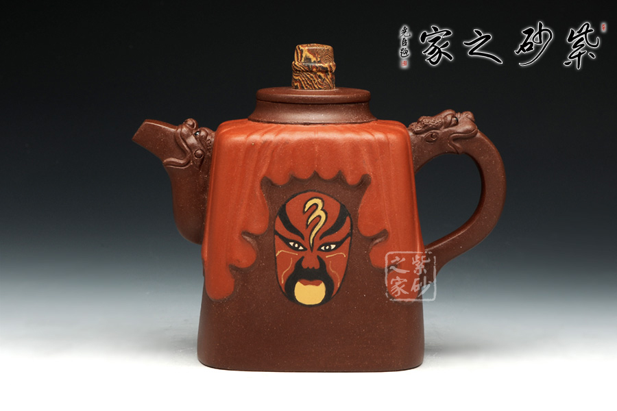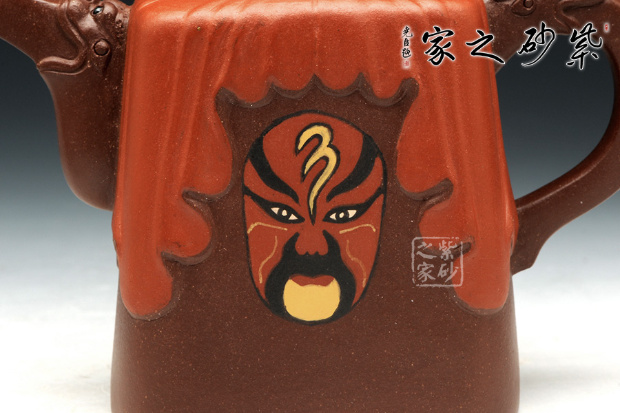 此壺壺身采用鑲泥手法,形如劇場,紅色帷幕下靈官臉譜,形象生動。壺整體造型藝美,工藝寓圓寓方,周身線條挺立不失柔和。壺把與壺嘴相互對應(yīng),以龍為韻,低調(diào)內(nèi)斂。壺鈕色彩斑斕,絞泥工藝,彰顯京劇藝術(shù)之多變,多彩。