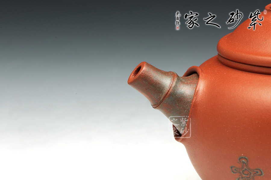 此壺為全手工制作,壺身光滑亮澤,圓潤(rùn)有致。此壺特殊之處,在于以竹為形,寓意竹的高風(fēng)亮節(jié)的高貴品質(zhì)。整個(gè)壺體是自然和生活的巧妙融合,壺嘴,壺鈕,壺把均是以一小節(jié)竹節(jié)塑造而成,尤其是壺把,彎曲幅度較大,顯出一種活潑調(diào)皮的韻味。此壺名為祝福,寓意吉祥安康之意,實(shí)為收藏之佳品。
