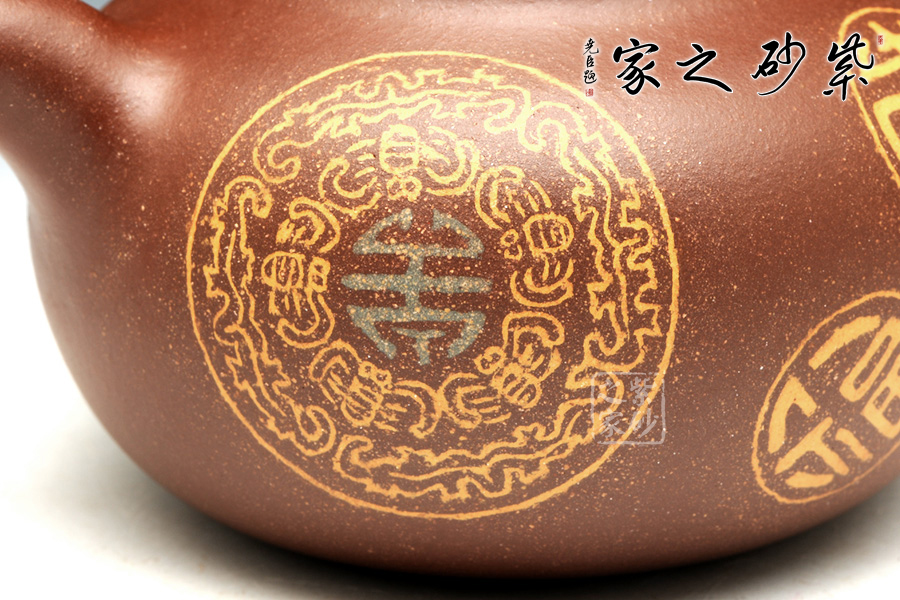 此壺作品,原礦紫泥制作而成,泥質(zhì)醇厚,色澤古穆。這款茄段的美妙之處在于似真似幻,在具體和抽象之間輪轉(zhuǎn)。以生活中常見的茄子為型,用圓潤的線條勾畫出茄子的動態(tài)之美,與常見的茄段不同。此款造型憨胖,敦實厚重,沉穩(wěn)有力,壺鈕為如茄蒂,逼真自如,流與把俊俏有力,舒暢自如,工藝精到。壺身有福字圖案,寓意吉祥如意,大富大貴之意。