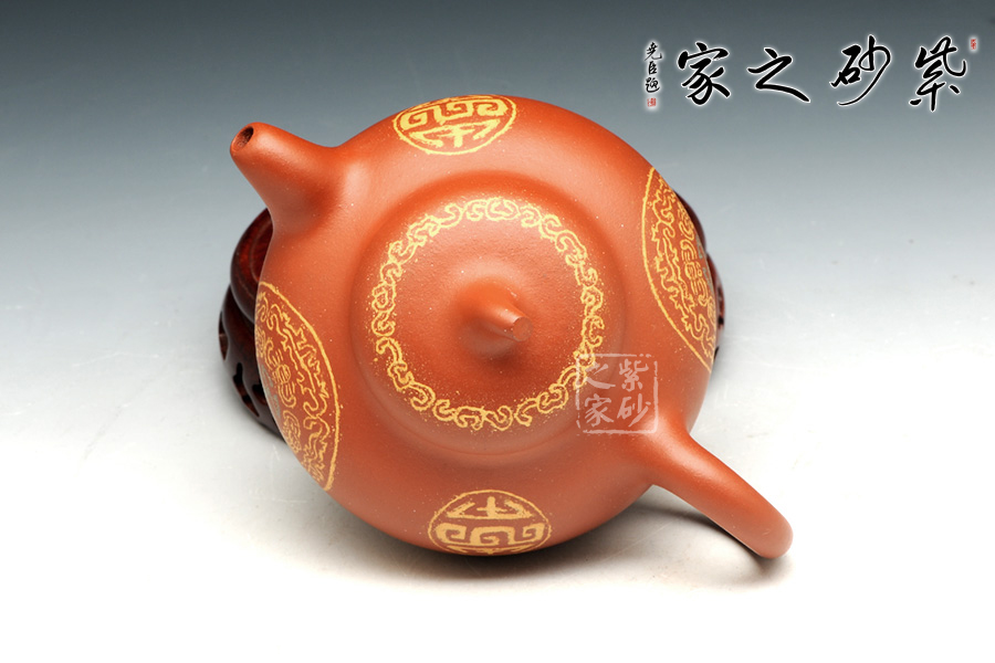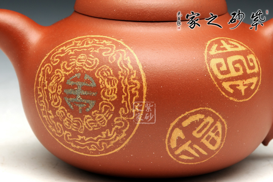 此款作品,原礦紅泥制作而成,色澤光潤,泥質細膩。這款茄段的美妙之處在于似真似幻,在具體和抽象之間輪轉。以生活中常見的茄子為型,用圓潤的線條勾畫出茄子的動態(tài)之美,與常見的茄段不同。此款造型憨胖,敦實厚重,沉穩(wěn)有力,壺鈕為如茄蒂,逼真自如,流與把俊俏有力,舒暢自如,工藝精到。壺身繪有福字圖案,寓意吉祥如意,大富大貴之意。