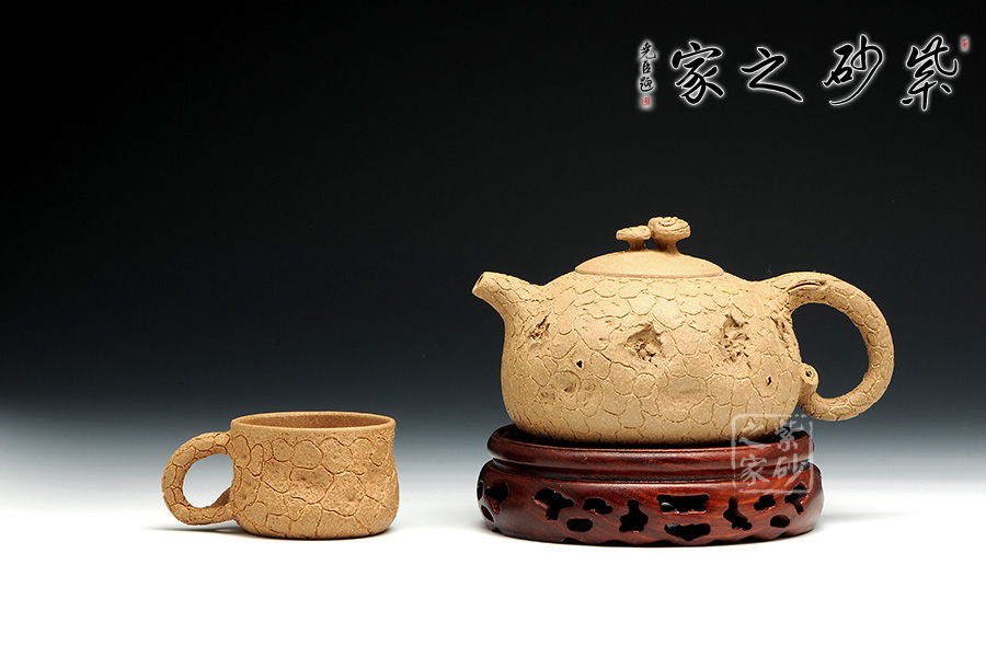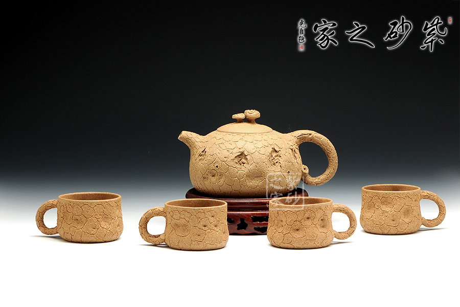 此套靈芝供春壺與傳統(tǒng)的供春壺實(shí)有異曲同工之妙,壺身皆有如老樹(shù)疙瘩般,盡顯得老成,壺把與壺嘴纖細(xì)對(duì)稱(chēng),以靈芝為壺鈕不但突出主題,亦區(qū)分出與其他供春壺的不同,可見(jiàn)老師創(chuàng)意之新穎,整體造型渾圓敦厚,古樸雅拙,器身仿樹(shù)皮褶皺。相輔相成的配以四杯,更是品茗養(yǎng)用首選。
