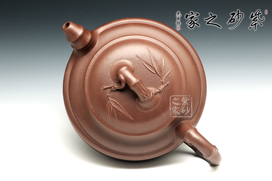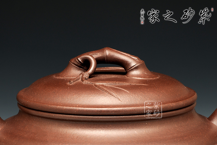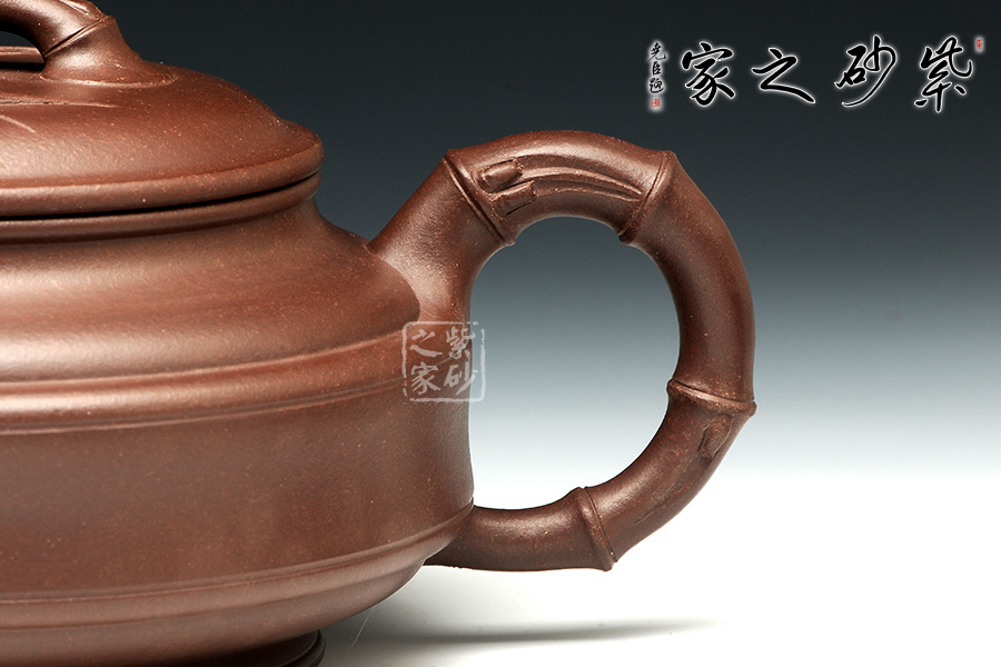 雙線竹鼓壺,為傳統(tǒng)壺型,傳承經(jīng)典,端莊雅致,不失渾厚樸實(shí),質(zhì)拙中顯高意。的流把竹節(jié)造型,一變嘴三節(jié)竹節(jié)裝飾而成,弧鈕散開在略微鼓起的壺蓋之上,蓋沿明顯厚于口沿,形成強(qiáng)勁的壓蓋之勢(shì),耳形端把竹節(jié)裝飾,兩條清晰的線條從壺腹中間穿過,似是一條寬闊的腰帶橫亙其中。加底,與壺口口徑一致,整款壺竹韻清疏,竹葉自壺鈕清淺胥出,貼于壺蓋之上,再也無其他裝飾,韻味不失,毫無矯飾。