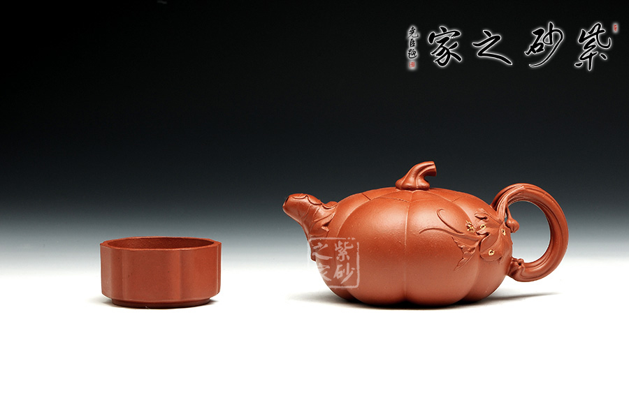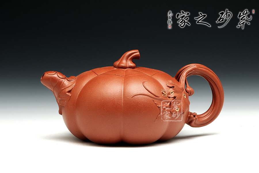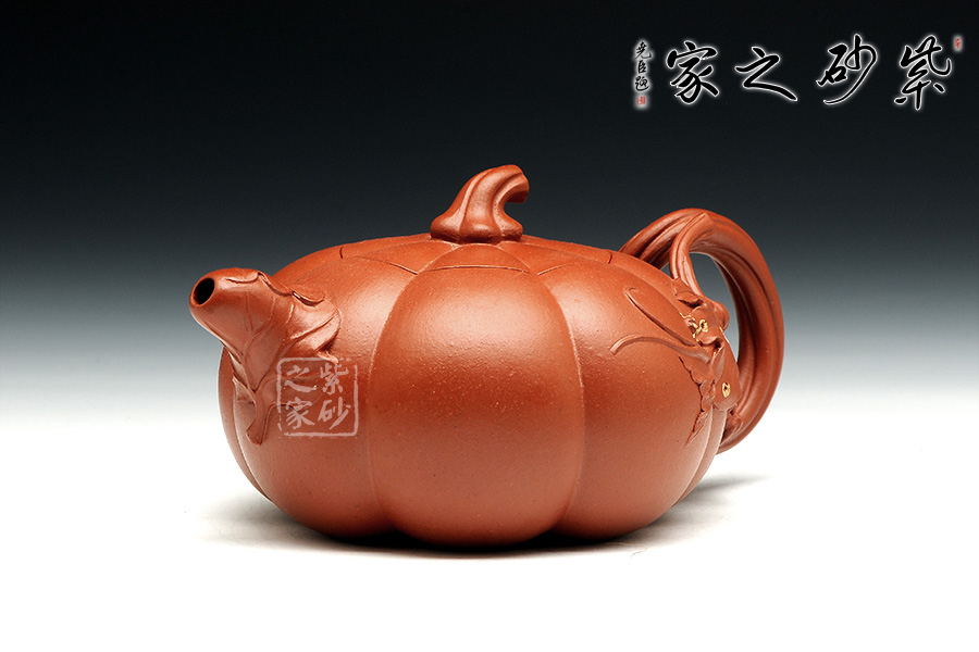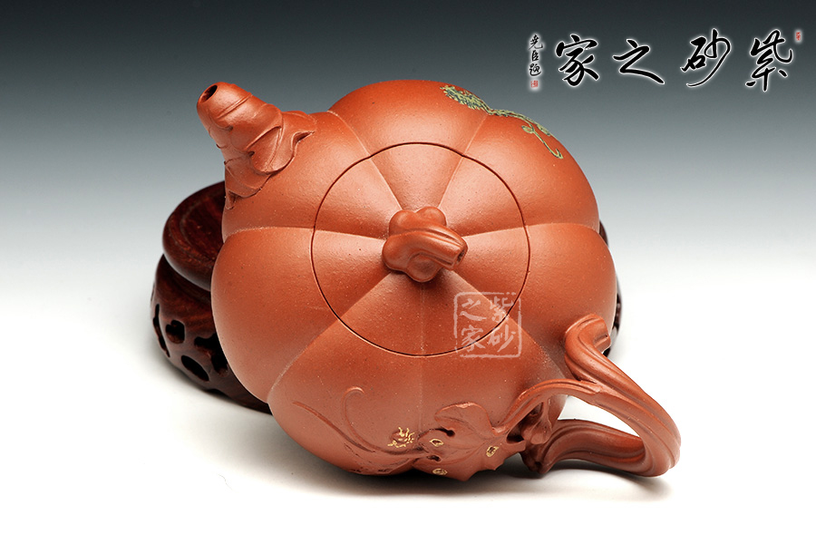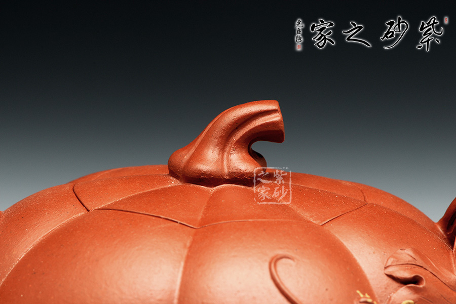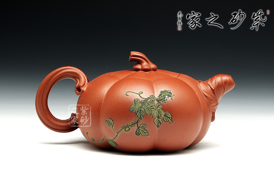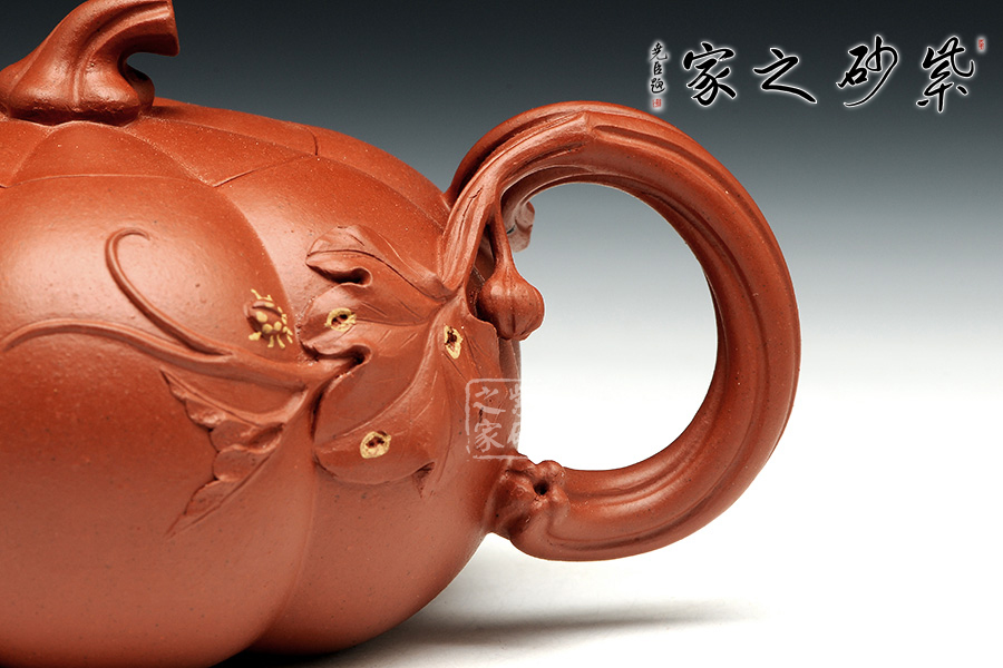 南瓜壺是紫砂壺中很常見的一種款型。此南瓜不僅外形酷似南瓜,更是集聚了南瓜的神韻,猶若瓜熟即將待落。壺鈕、壺把嫉皆以南瓜藤為原型,形象逼真。壺嘴則若南瓜葉包裹而成,精巧別致,創(chuàng)意極新。壺把處一南瓜葉子胥出,蒼老卻不失神氣。而南瓜壺身,紅色斑駁,極似熟透了的南瓜,讓人有快速采摘拿去熬湯的沖動(dòng)。此南瓜壺,顯然活矣!