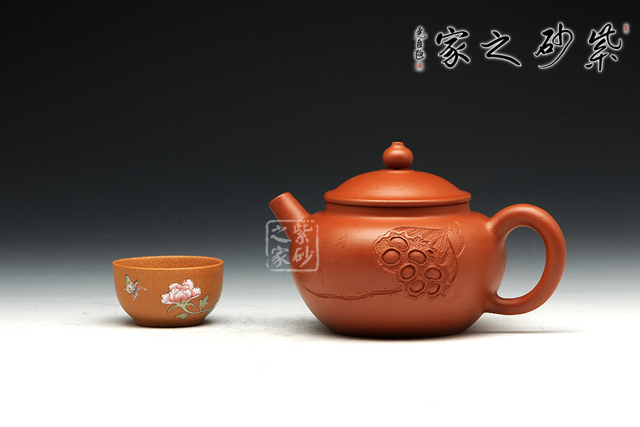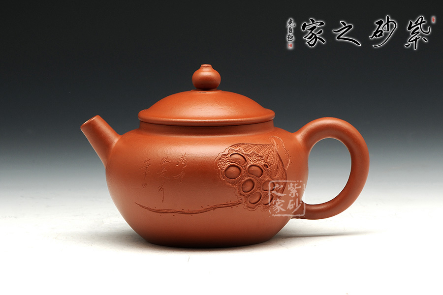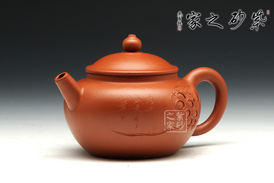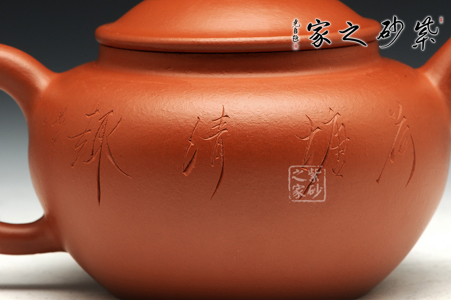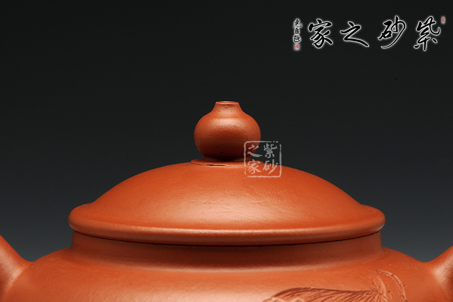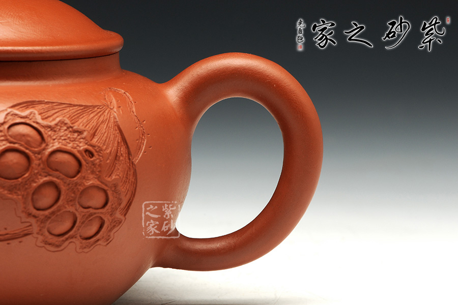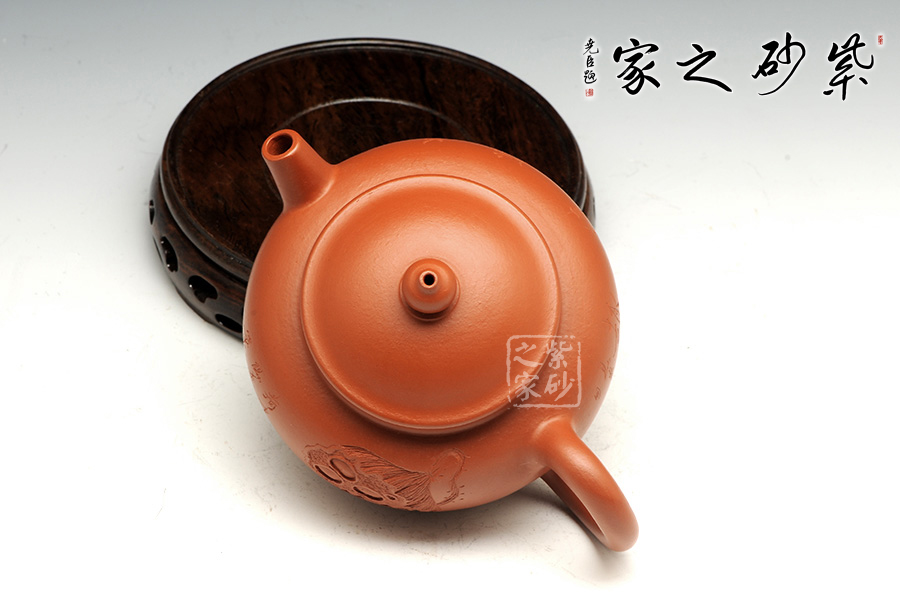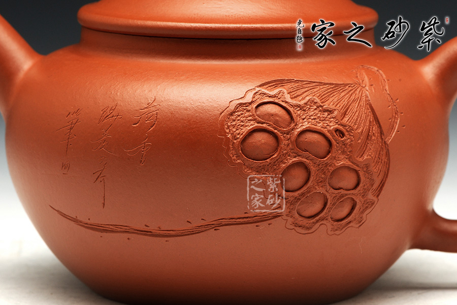 此壺采用原礦朱泥制成,質(zhì)感細膩柔嫩,色澤紅潤,泥外表質(zhì)地細膩平滑,紫砂色澤和緩,予人沉靜淡雅之感。此壺為宮燈式,壺身十分飽滿,與水平壺相類似,壺底收斂。壓蓋式,子母線嚴(yán)絲合縫,蓋面略鼓,圓潤的壺鈕續(xù)出,古雅質(zhì)樸。直流嘴暗接精湛,挺合有力,嘴型經(jīng)典傳統(tǒng)。耳形端把,弧度流暢緩和,端握舒適。此壺最為出彩之處莫過于壺身上的裝飾,荷花逸趣,曼妙生姿。壺身反面則刻繪詩詞“荷塘清趣”,相輔相成。