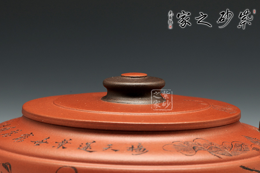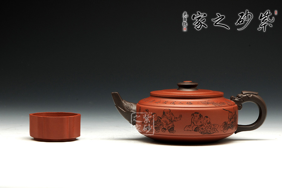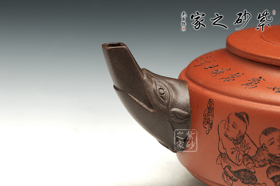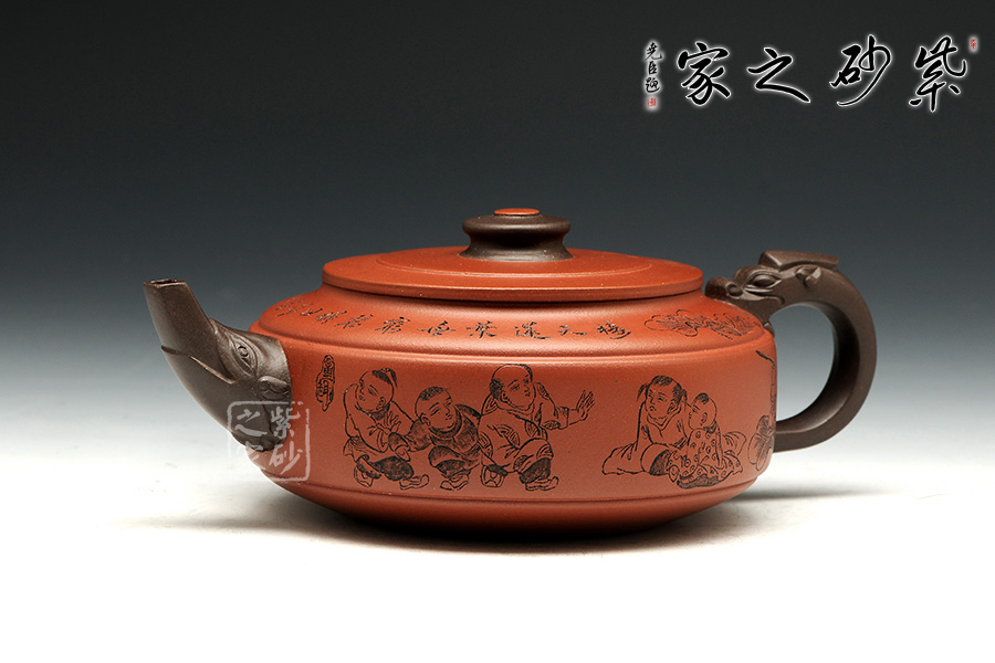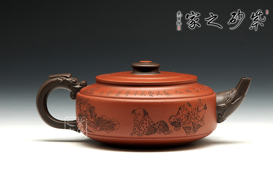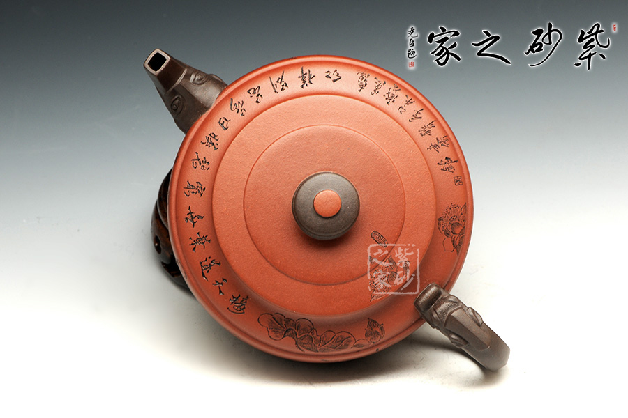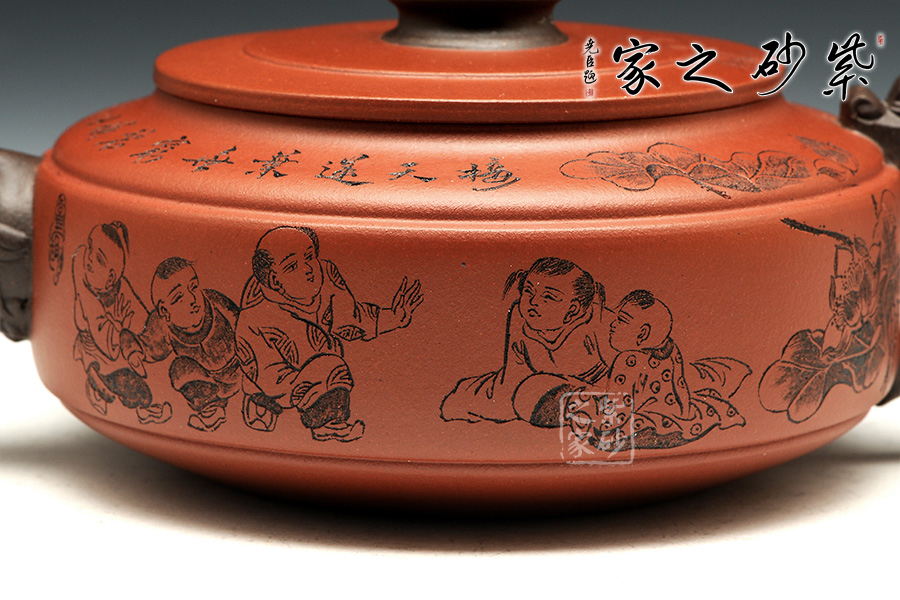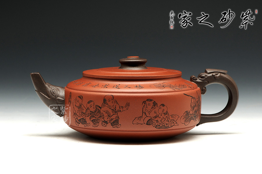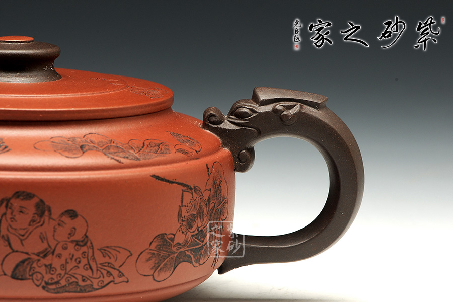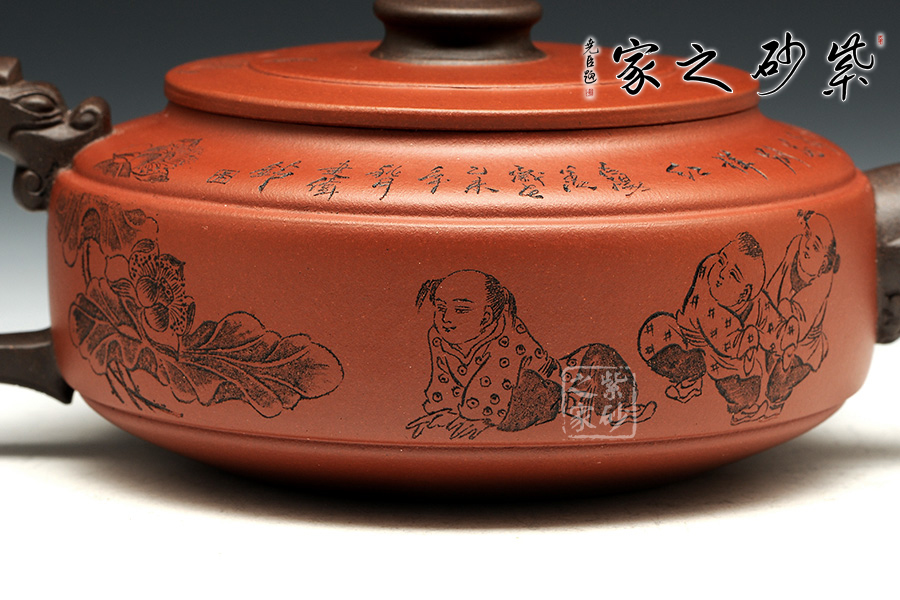 此壺老師選用雙色泥料制作,顯得相互諧和,別有一種風格??v觀此壺,壺把與壺嘴自然胥出,皆以龍為形,與壺為身銜接自然。壺身呈圓柱狀,到壺底內收變?yōu)榈?,穩(wěn)重而平實。壺身刻繪的百子百福吉祥有趣,壺蓋上刻繪詩詞“接天蓮葉無窮碧,映日荷花別樣紅。”也別有一番雅韻。觀之整器,整體過度的非常自然、漂亮,使整個器形看起來簡潔明快,典雅大方。