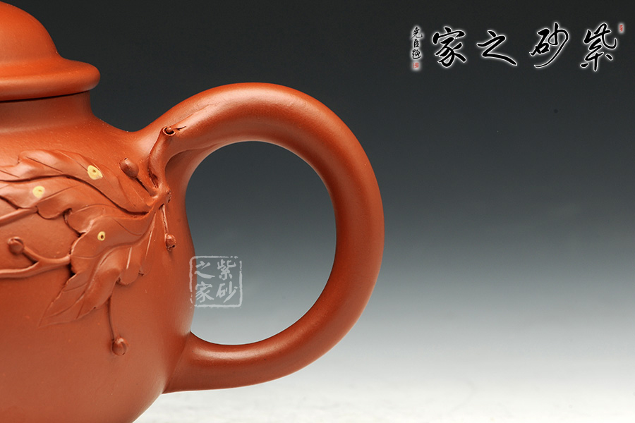 “春色滿園關(guān)不住,一枝紅杏出墻來(lái)”,此壺典雅逸美,田園之態(tài),給人遐想。這款紫砂壺造型傳統(tǒng),突出了一種古樸的內(nèi)在美感。壺把之處的貼花藤枝形象生動(dòng),栩栩如生,壺身與壺雕的巧妙結(jié)合,彷如一枝含苞待放的花枝隨著茶香緩緩盛開(kāi)。在色澤上更是繼承了傳統(tǒng)紫砂壺沉著、古感的特點(diǎn),給人一種雅俗共賞的感覺(jué)。