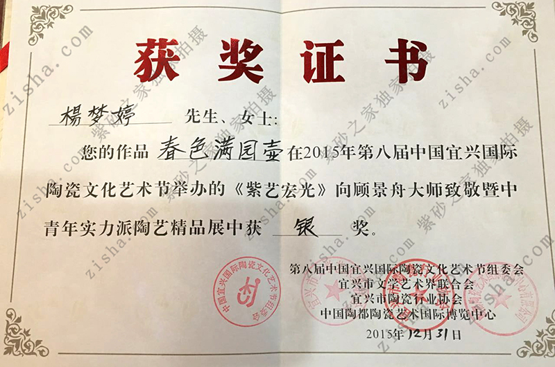 ▼ 2015年第八屆中國(guó)宜興國(guó)際陶瓷文化藝術(shù)節(jié)舉辦的《紫藝宏光》中青年實(shí)力派陶藝精品展銀獎(jiǎng)!