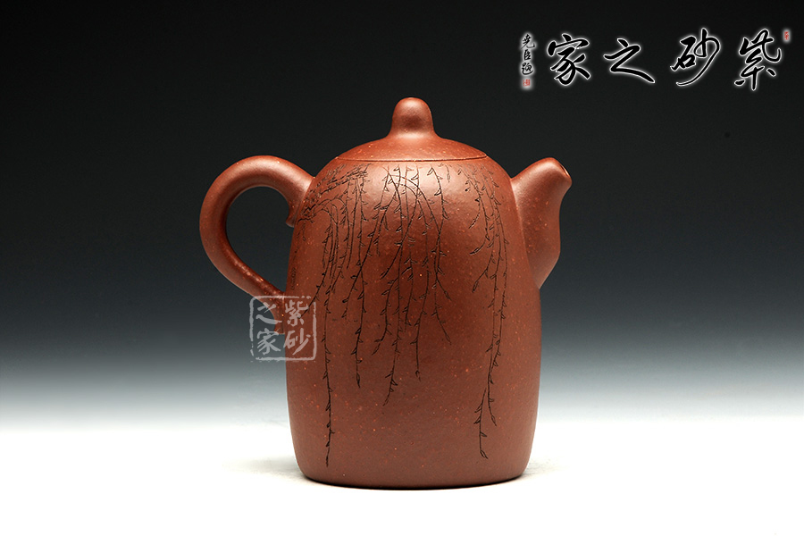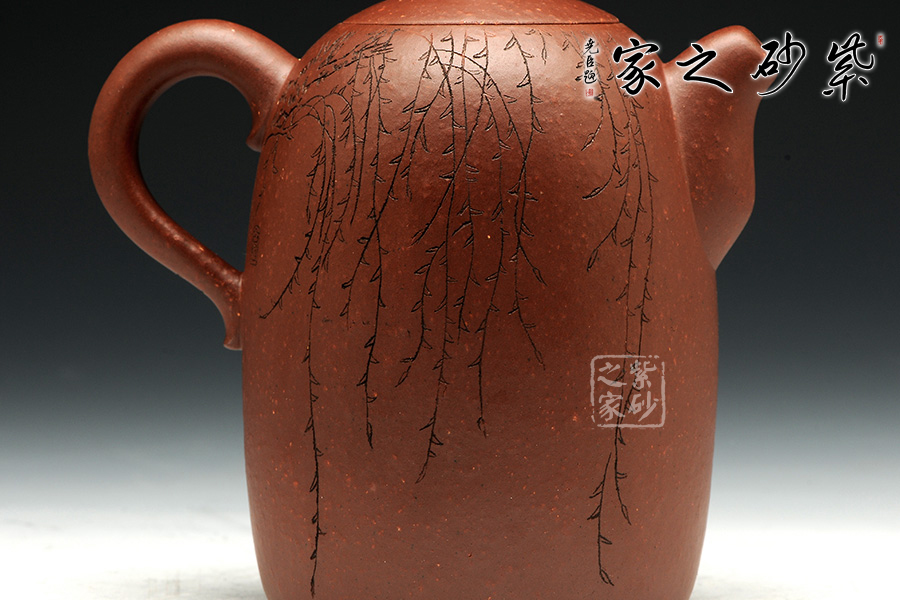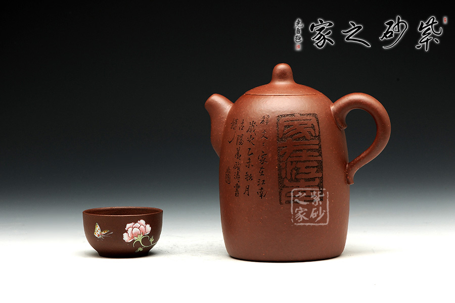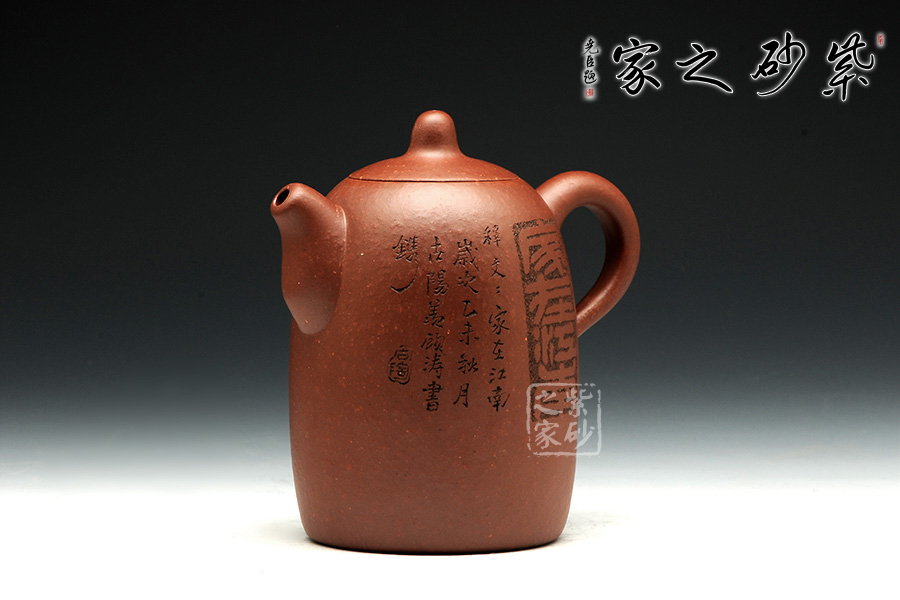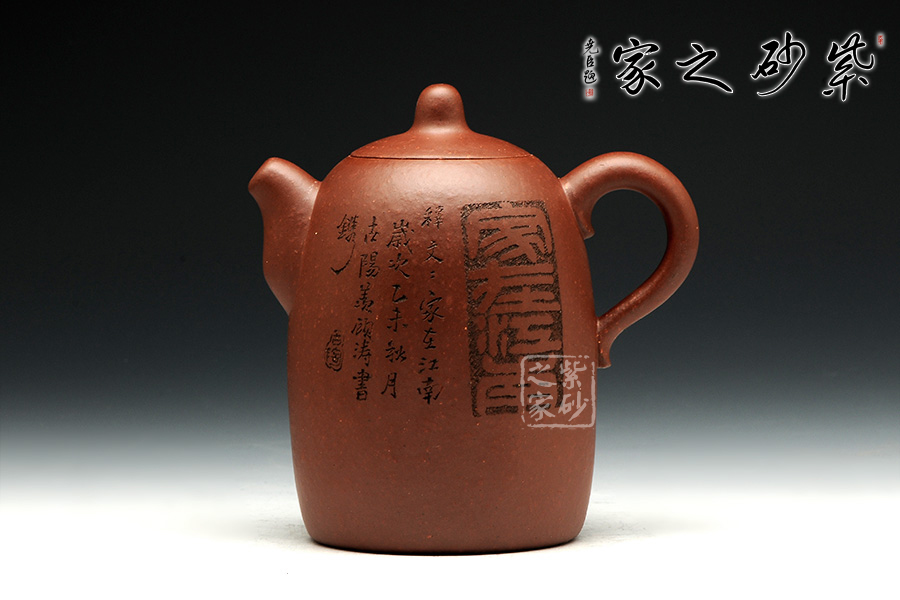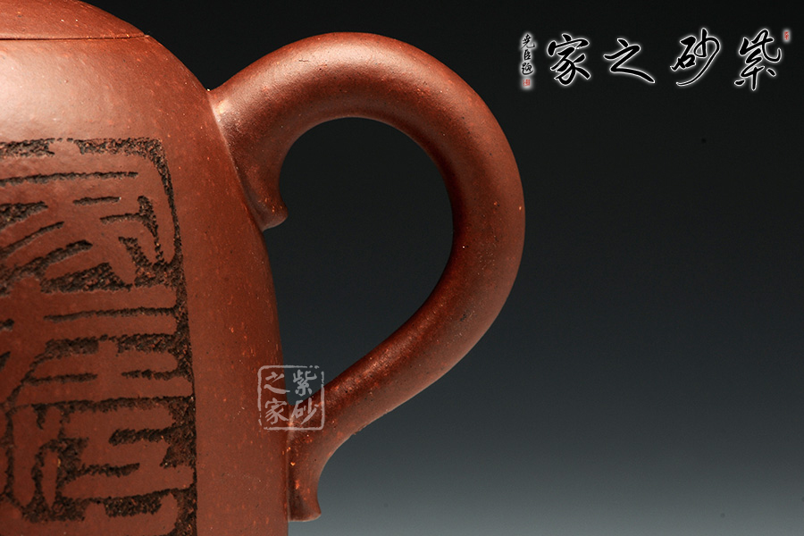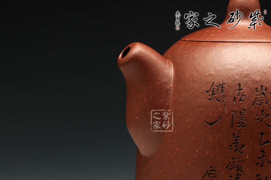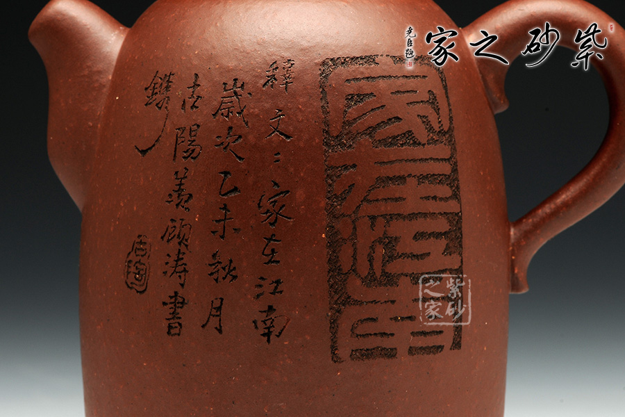 此壺壺身高聳由下至上收斂,自然流暢,流短有勁,環(huán)耳形把手,不矯不揚;嵌蓋微鼓,亦另為截蓋制,沿與蓋品渾然一體;乳鈕宛若天成,壺形整體簡練、古樸、大方。壺身刻繪唱和,有古穆沉靜之感,更添了藝術(shù)的內(nèi)涵,整款作品大氣和美、線形流暢自然、力到十足。