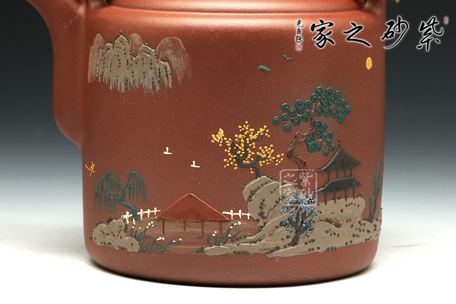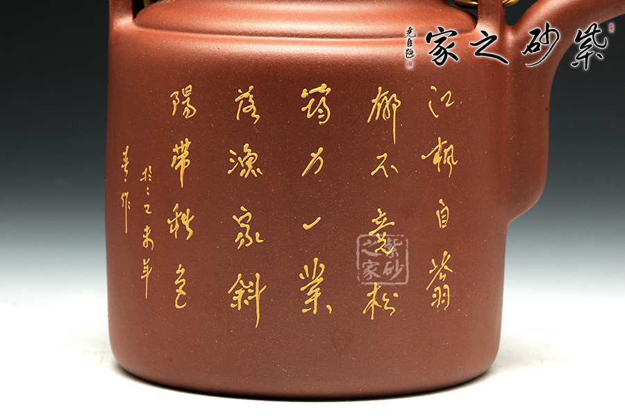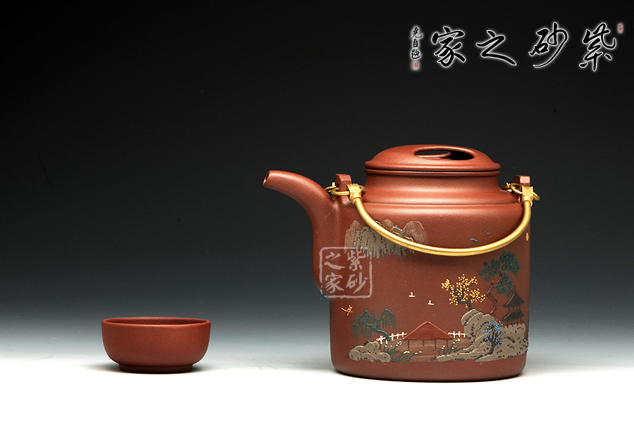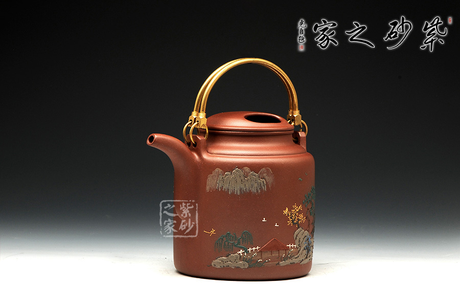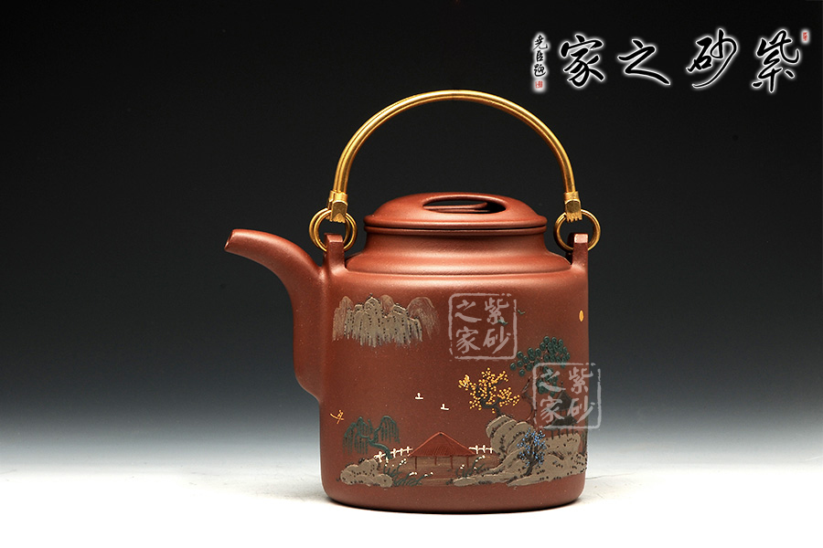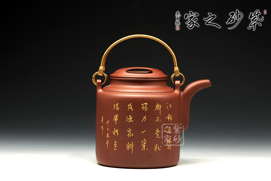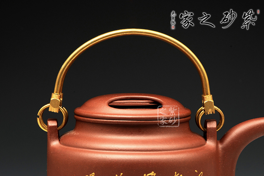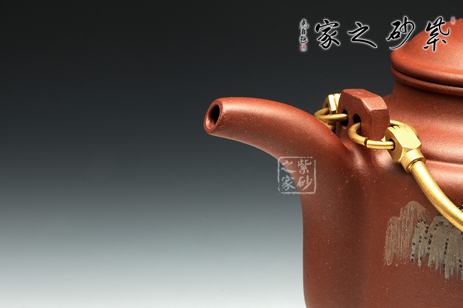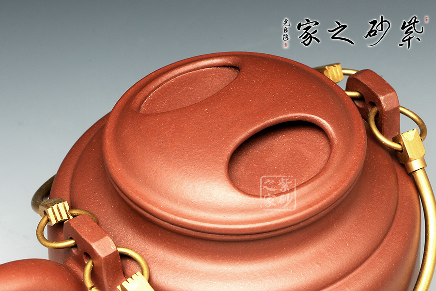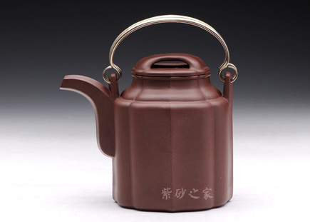 精選原礦紫泥泥料制成的此壺,泥質(zhì)醇厚,色澤古穆。該壺壺身挺拔高俊,酷似洋桶。細(xì)觀此壺,亮點(diǎn)引人入勝。銅質(zhì)提梁,耀眼奪目,和壺身泥質(zhì)形成鮮明的對(duì)比,營造了一種良好的視覺效果。壺蓋采用牛蓋式設(shè)計(jì),美觀精巧。壺嘴不同于普通的三彎流,獨(dú)特的設(shè)計(jì),憨厚質(zhì)樸,和壺身相應(yīng)成趣。