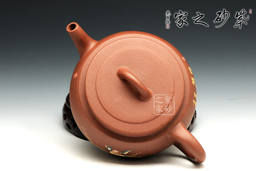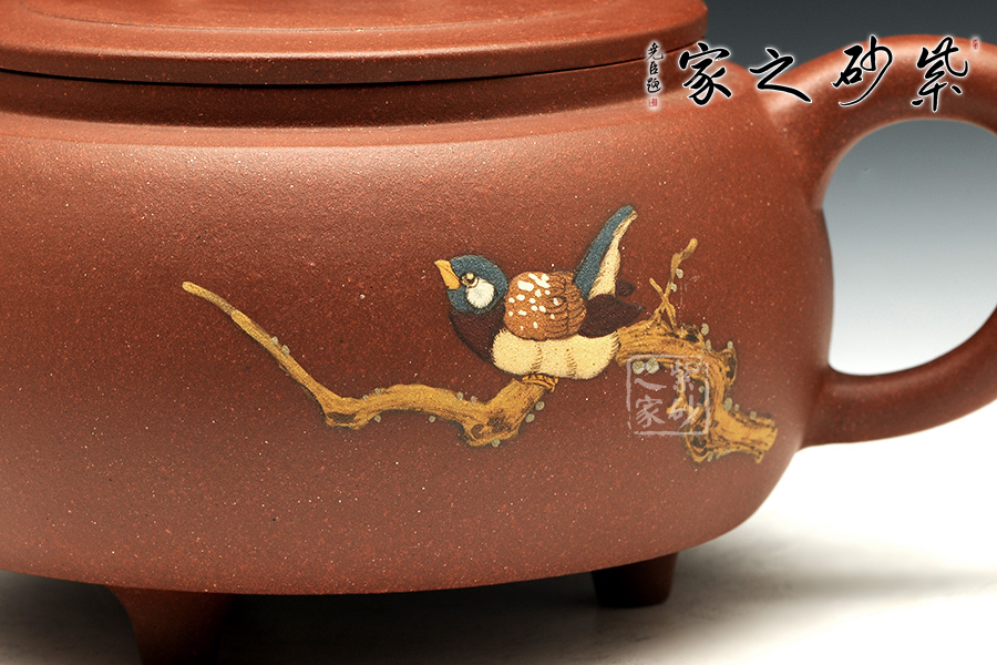 此壺造型如同一鼎,選用原礦紫泥全手工制作,扁圓鼎型,三足支撐穩(wěn)重有力。壺嘴向前,似直似曲,與壺身相融。流把與整器呼應(yīng),剛健有力,和諧有度。壺蓋配以橋鈕,口與嵌蓋密不透風(fēng),整器散發(fā)出一種霸氣而優(yōu)雅的氣質(zhì)。
