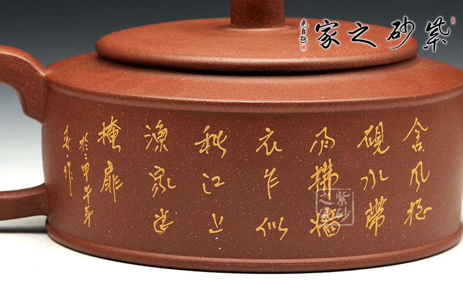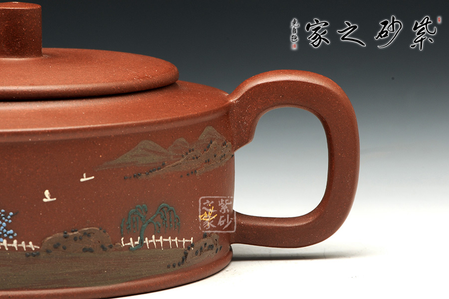 此壺壺身扁圓細(xì)膩,如美玉一塊,讓人忍不住細(xì)細(xì)撫摸,心生喜歡。圈足底和環(huán)形壺頸上下對應(yīng),既托起不凡的氣質(zhì),又富有工藝美感。壺蓋壓在壺頸上,平滑蓋板似一塊玉盤,流光溫潤而柔和,足見做工細(xì)膩。柱型壺鈕利落簡單,挺立而為。直流壺嘴與同樣是方型的壺把,左右相對,粗細(xì)相對,與壺鈕一起,與壺身的圓滑相對,韻味尤其美妙綿長。