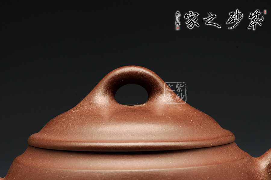 此壺選用原礦紫泥泥料制作,色澤內(nèi)斂。作品以簡潔的線條構成淳樸凝重的形體,深厚且具神韻,設計上空間明快,虛實和諧,提諧舒適,有端莊古樸之意境。這款壺器型端莊、敦實,壺身為短柱形,渾厚有余,大口蓋壓口,平整有力,弧形橋鈕搭接在壺蓋上,完流嘴長短適中,耳形壺把圓中略見扁。