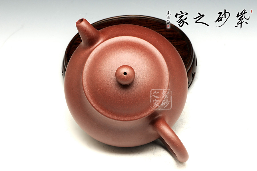 此壺器形典雅,壺腹飽滿,壺底與壺口口徑一致,形成上下應(yīng)和之勢(shì),一變嘴斜出,耳形壺把隨身勢(shì)而動(dòng),顯得柔韌有余。飽滿的珠鈕置于壺頂,協(xié)調(diào)有致,整器更顯雅致。