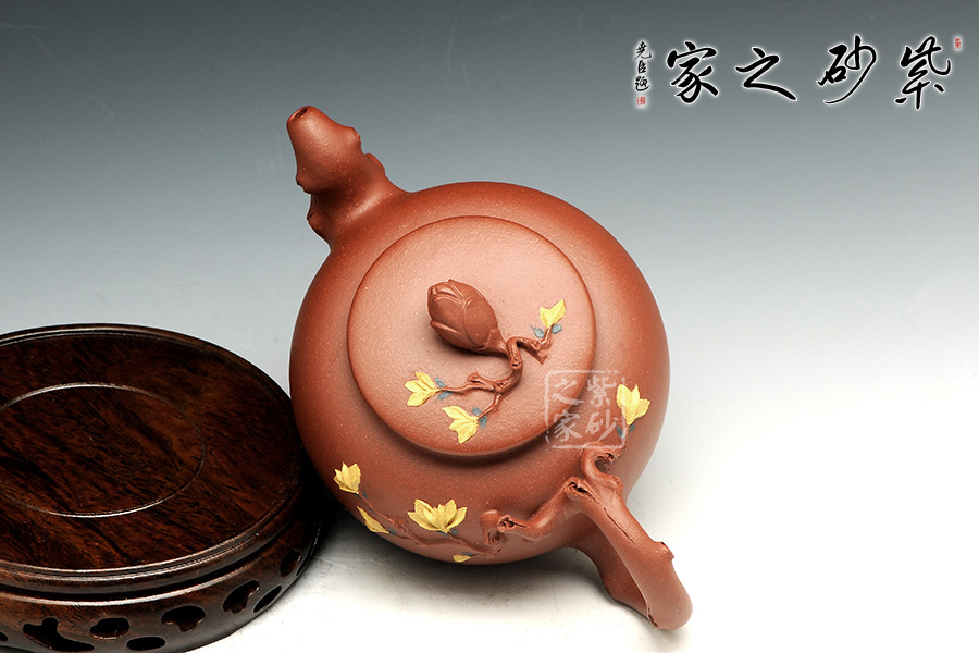 空谷幽蘭,香氣宜人,壺融蘭香,蘭添壺韻,質(zhì)樸大氣的壺型點(diǎn)綴玉蘭骨朵,此番韻味,不可言說(shuō)。此壺壺鈕如同一個(gè)含苞待放的花骨朵,匍匐在壺蓋上,花苞朝天,形成了提捏方便的壺鈕。在壺鈕與壺蓋銜接的地方,裝飾的玉蘭花怒放,美麗動(dòng)人。同時(shí),壺嘴與壺把都是花枝造型,二彎流出水流暢,嘴頭鼓起,形成了細(xì)膩柔美的嘴口。壺身上的貼花玉蘭色彩鮮明,也為此壺增色許多。