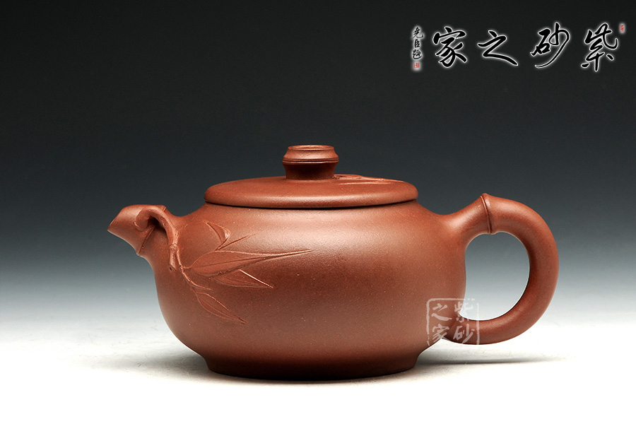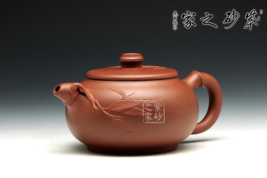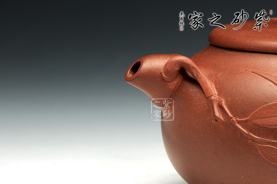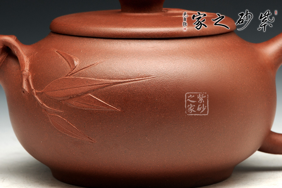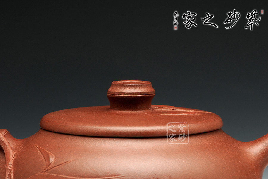 在中國(guó)文化中,竹寓意吉祥,竹有節(jié),即節(jié)節(jié)高升,又有竹報(bào)平安,竹又諧音“祝”,有美好祝福的習(xí)俗意蘊(yùn),在許多藝術(shù)創(chuàng)作中也會(huì)融入竹元素。此壺即是以竹為主題的紫砂作品,寄托了作者濃濃的祝福之意。扁圓渾厚的壺身配以古樸的壺嘴和壺把,造型統(tǒng)一,以竹節(jié)為型。壺身上竹葉貼花鏈接到壺嘴。壺壓蓋自然如玉,壺鈕與竹相應(yīng),淡雅自然。整體生機(jī)盎然,造型立體,裝飾逼真富有生趣。