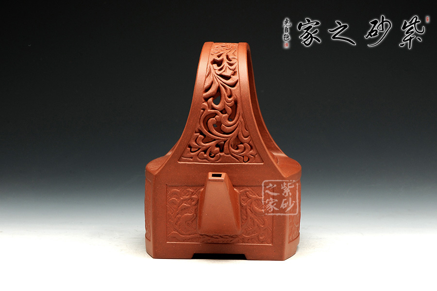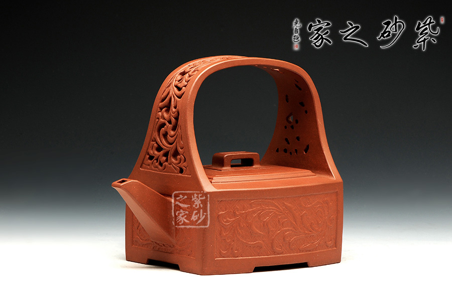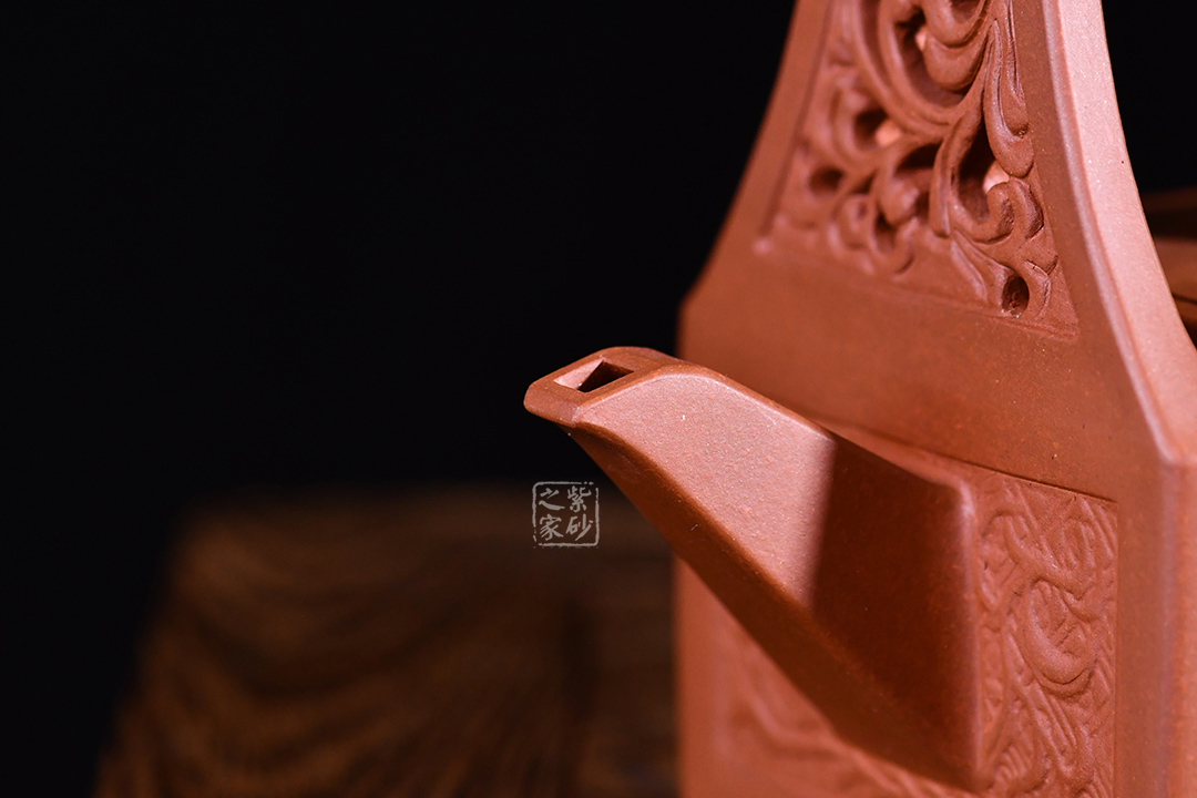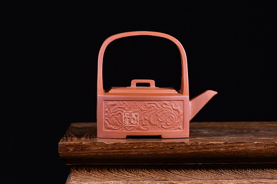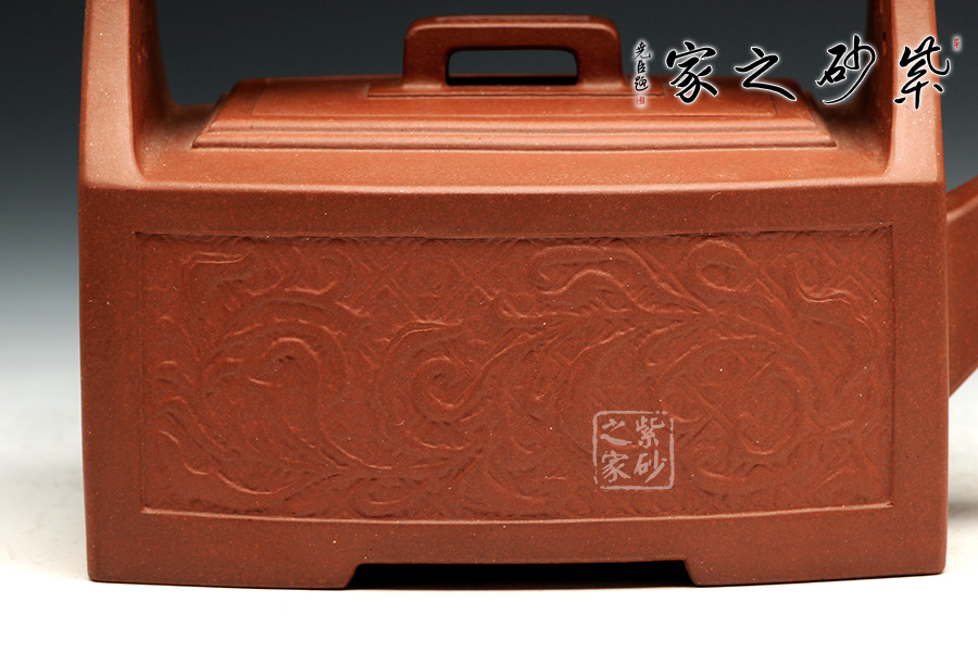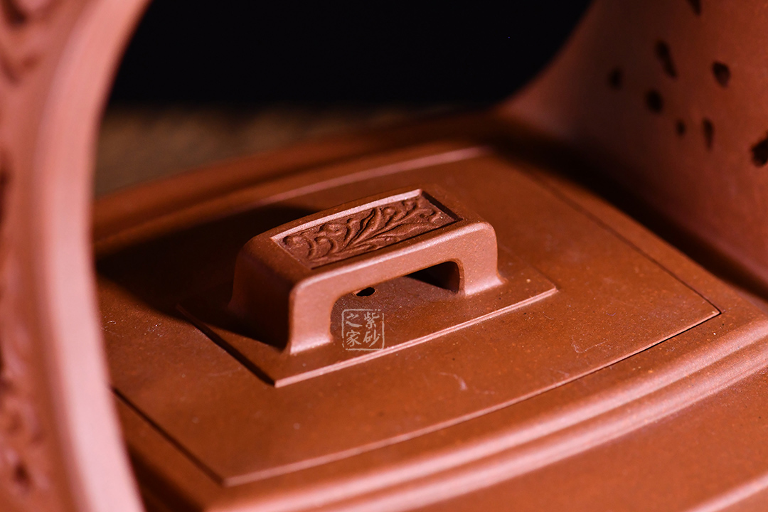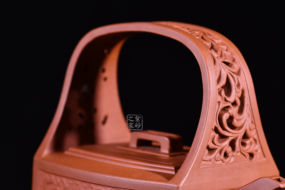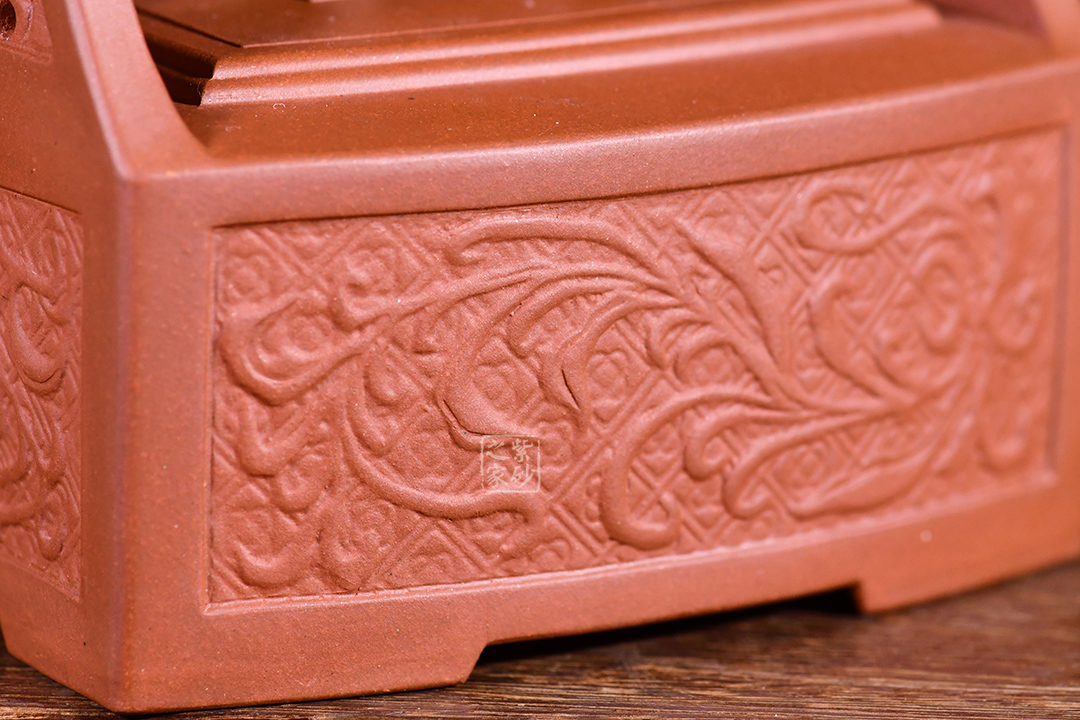 孔家壺一貫以絞泥工藝聞名,而此款唐草提梁卻更顯內(nèi)秀古樸,壺身四方,面面俱到,下延伸四方腳,沉穩(wěn)內(nèi)斂。全壺集鏤空貼塑工藝于一身,制作難度大,具備一定的防偽功能。采用唐代盛行的裝飾紋樣蔓草,取名唐草提梁,喻意吉祥與長壽。