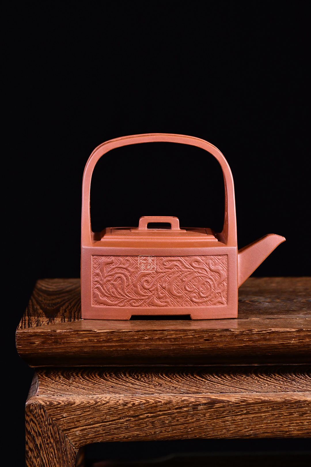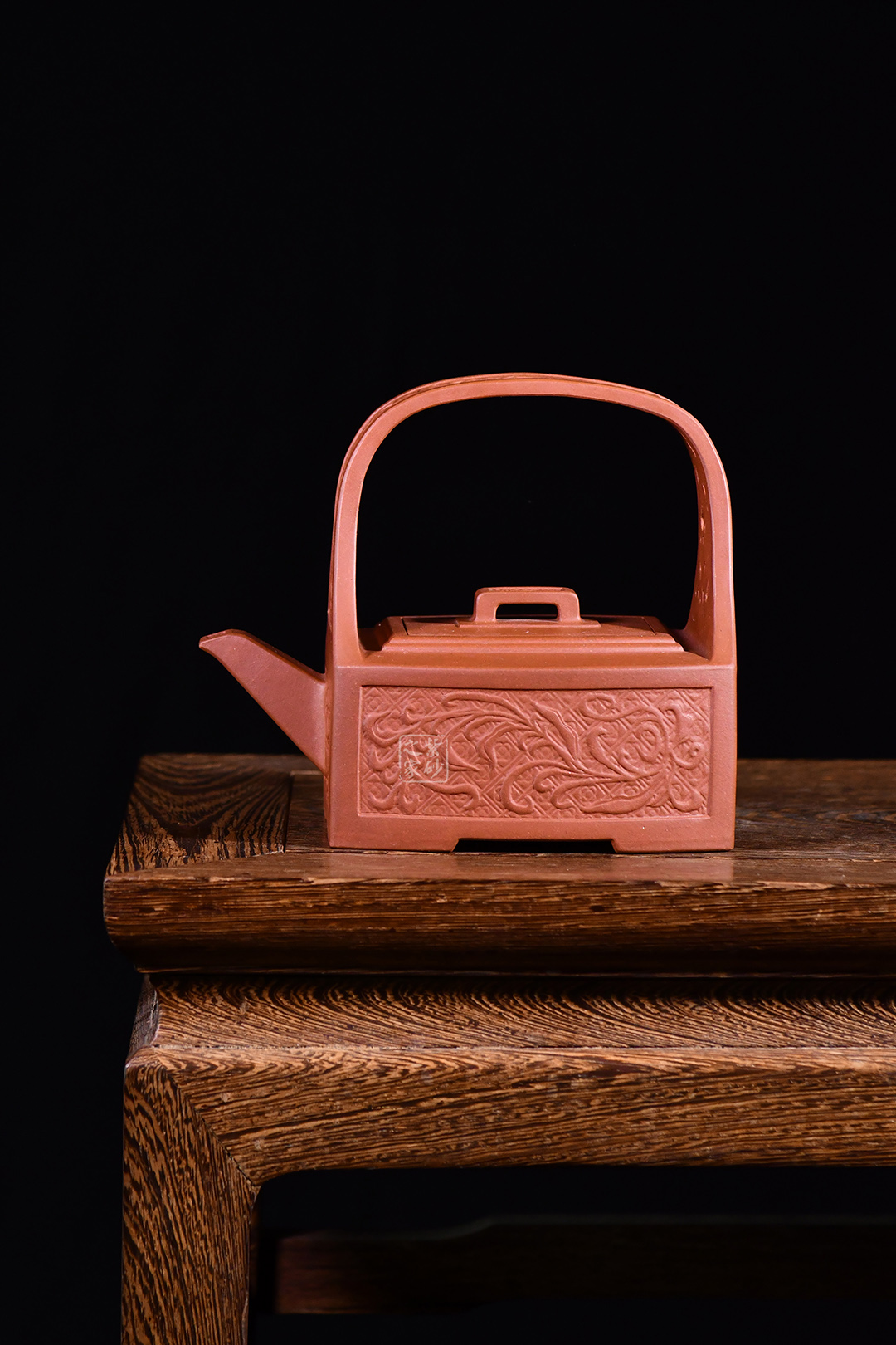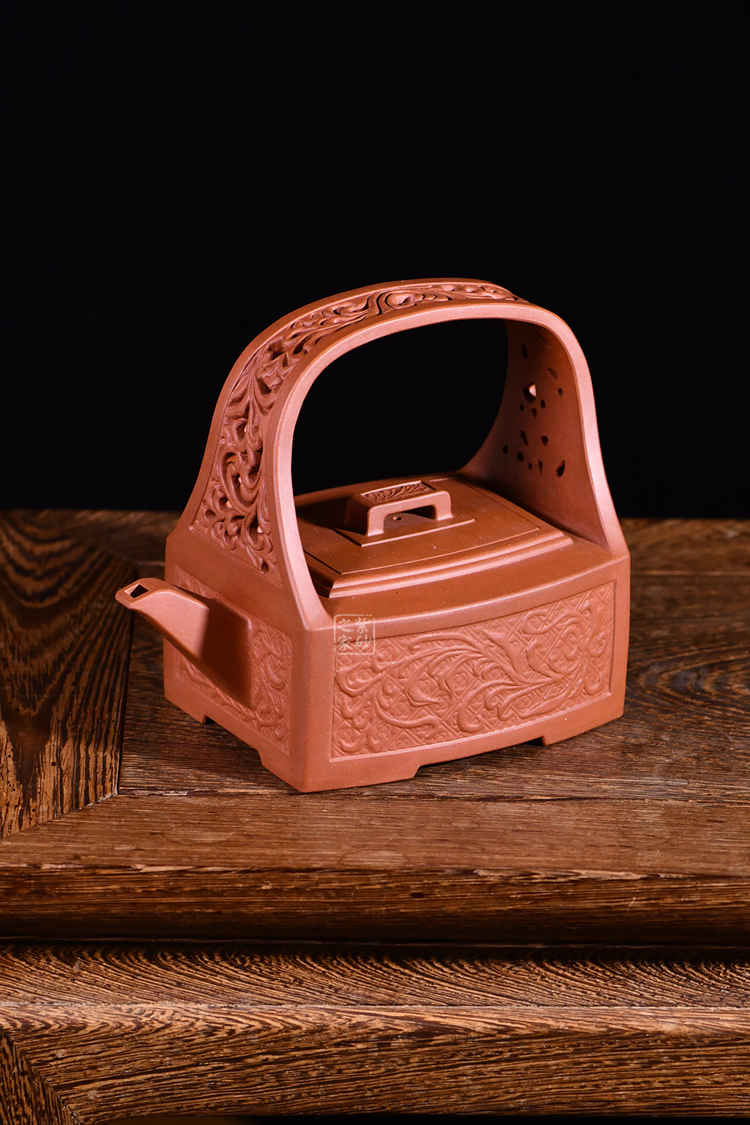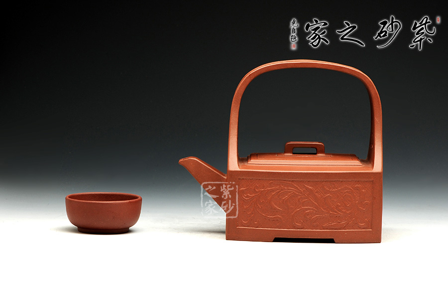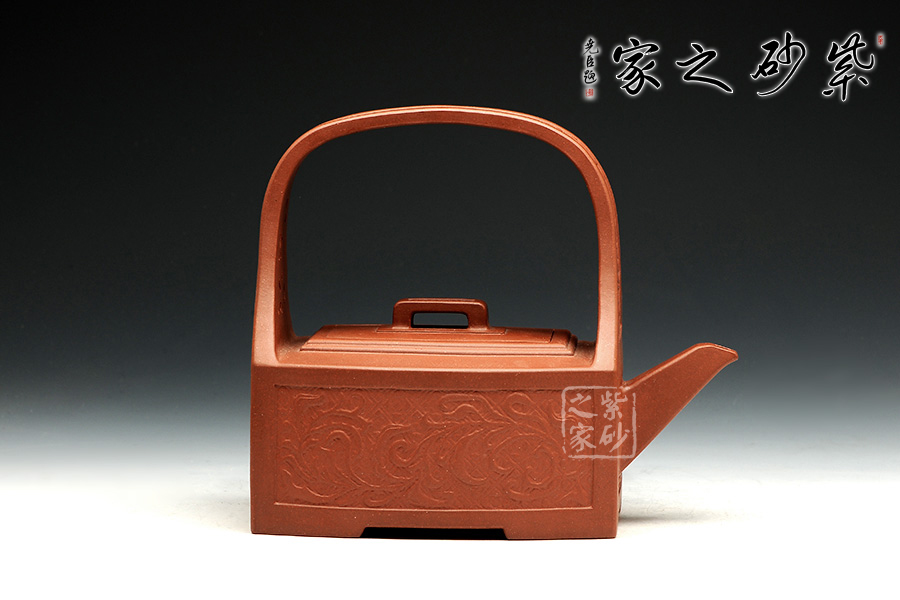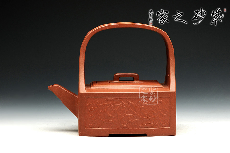孔家壺一貫以絞泥工藝聞名,而此款唐草提梁卻更顯內(nèi)秀古樸,壺身四方,面面俱到,下延伸四方腳,沉穩(wěn)內(nèi)斂。全壺集鏤空貼塑工藝于一身,制作難度大,具備一定的防偽功能。采用唐代盛行的裝飾紋樣蔓草,取名唐草提梁,喻意吉祥與長壽。