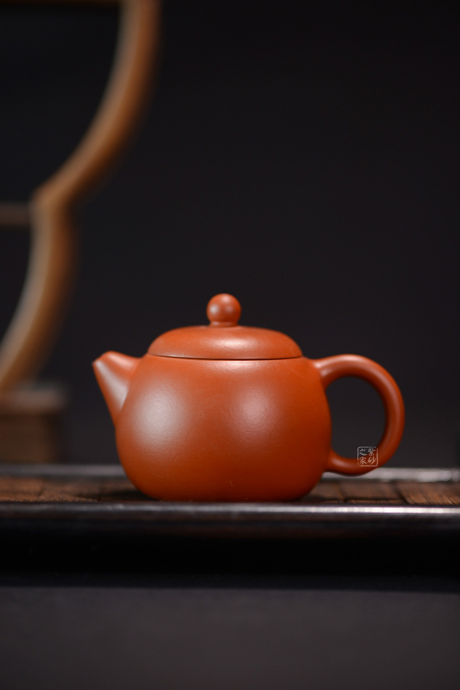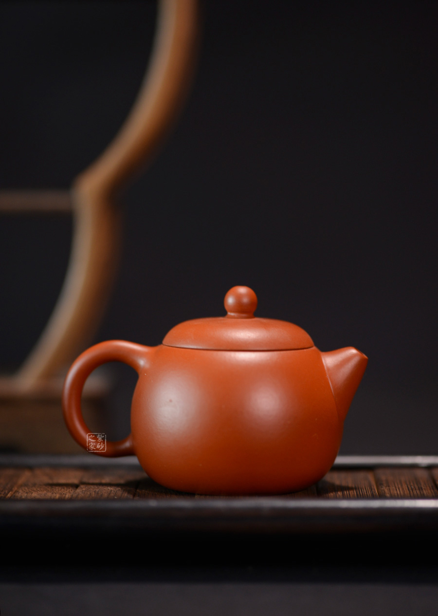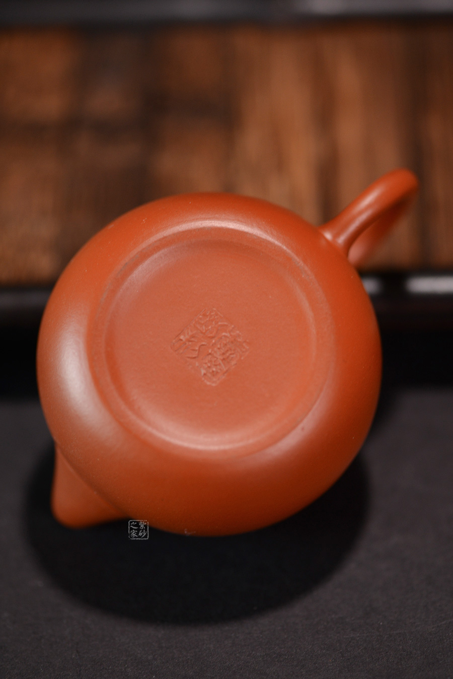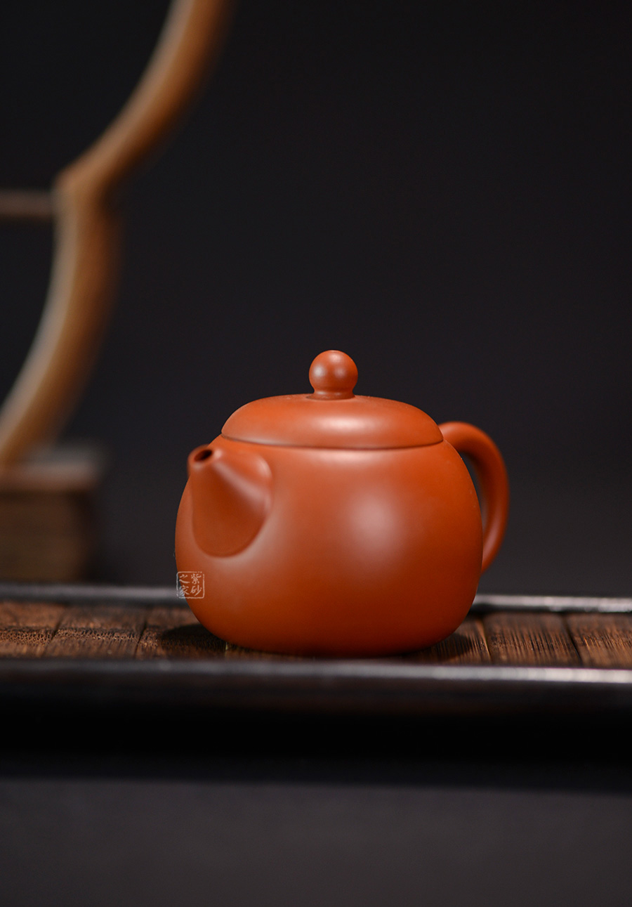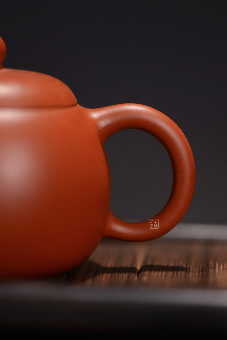文旦“果之美味,江浦之橘,云夢之柚”,此壺雖用朱泥制作而成,泥色卻溫潤亮麗。觀之此壺,不失女性溫柔優(yōu)雅,和西施、貴妃那般嬌美玲瓏不同,整器樸拙之中自有嬌憨之美。寶珠鈕為截蓋之勢,短嘴頭上翹,如同女子嬌嗔撅起的小嘴,倒把下垂,與嘴頭上揚之勢相呼應(yīng)。飽滿的壺腹,似乎讓人看到西施壺那樣的女子自然之美,更猶如一顆青澀的柚子,味盡在口而意無窮。