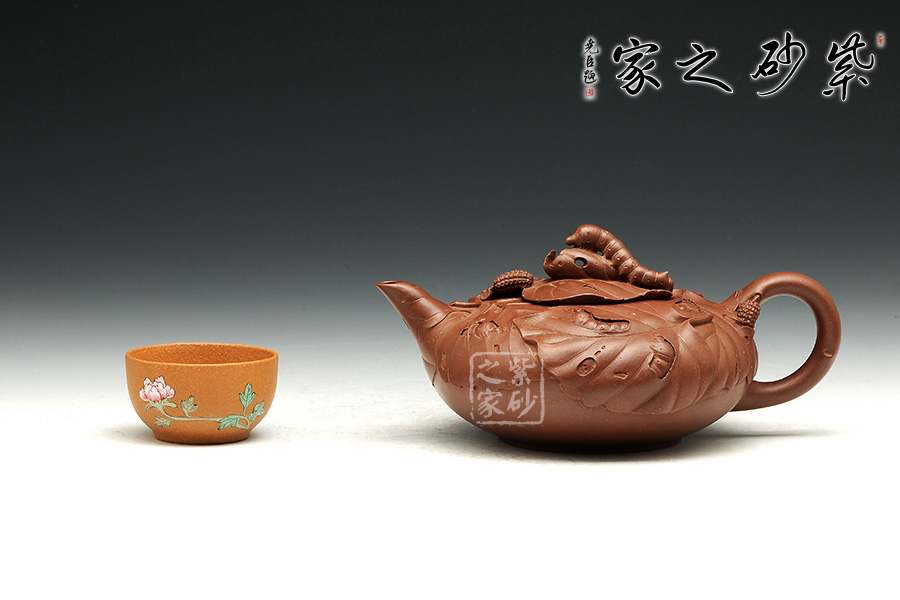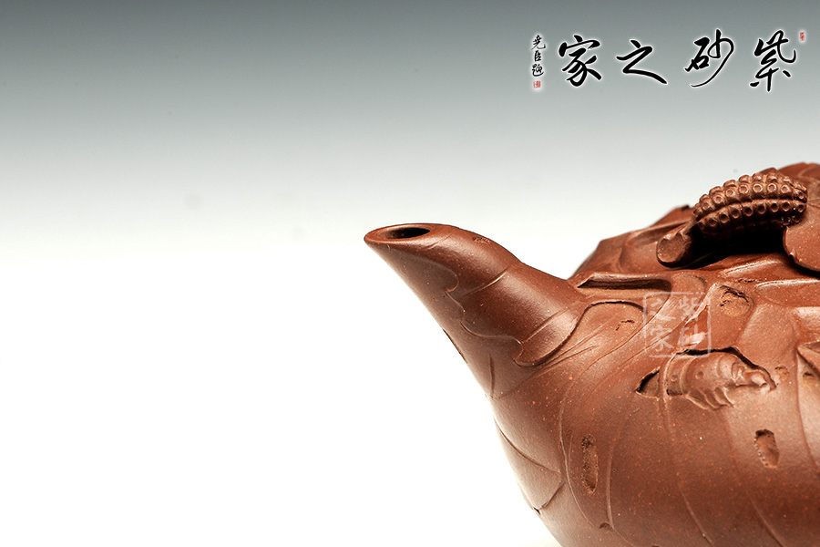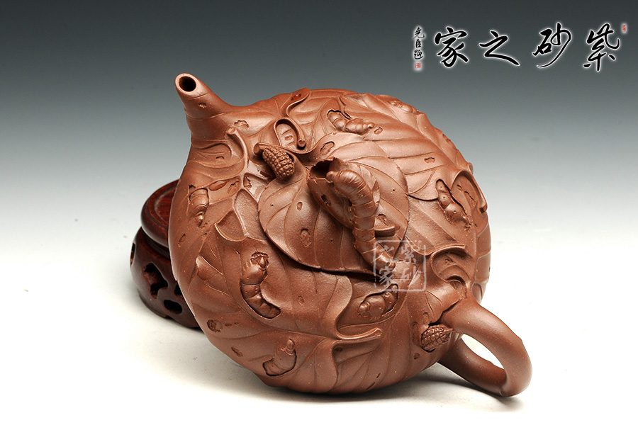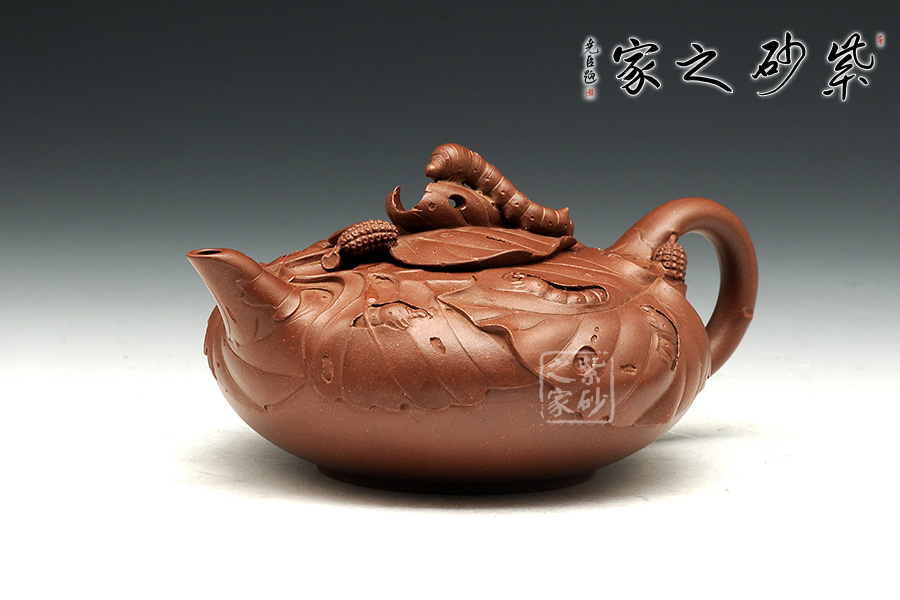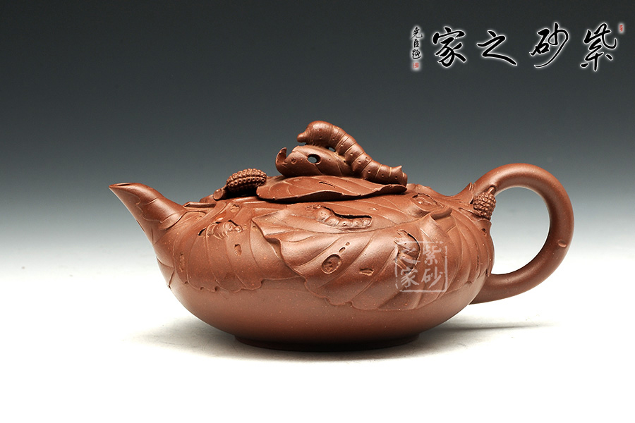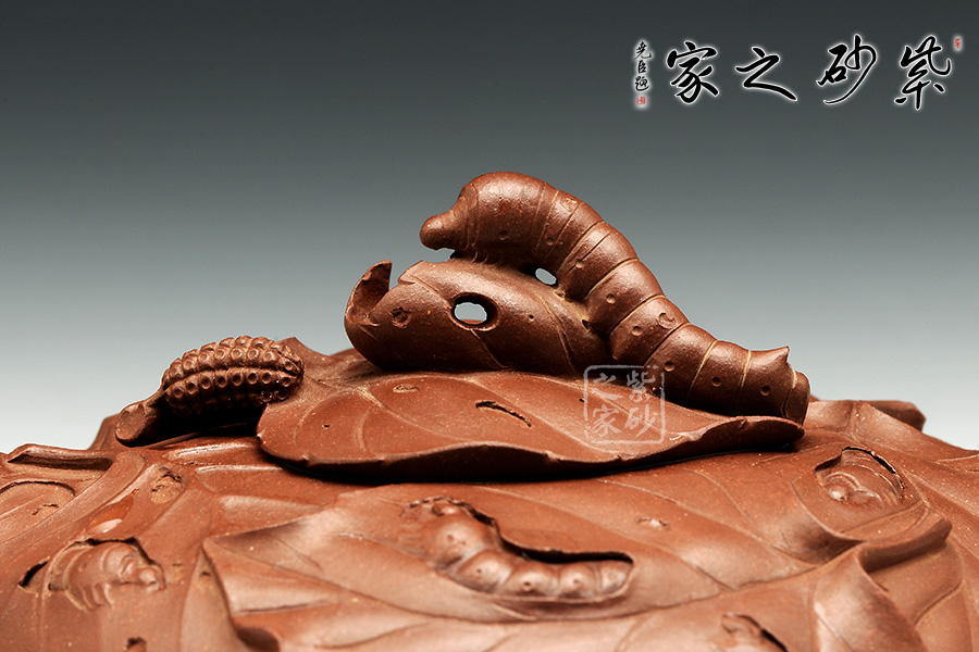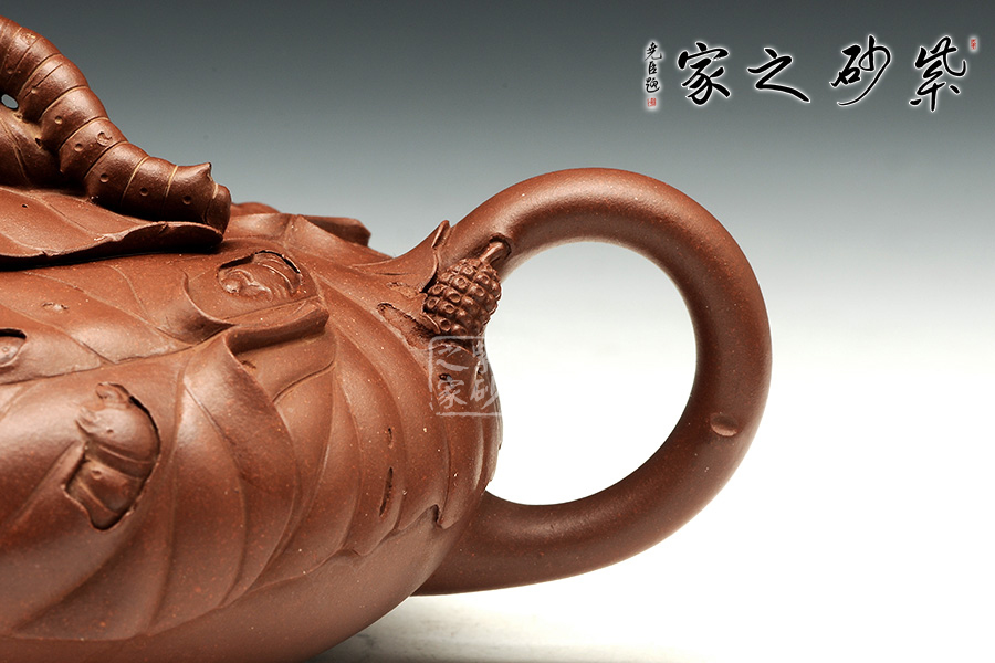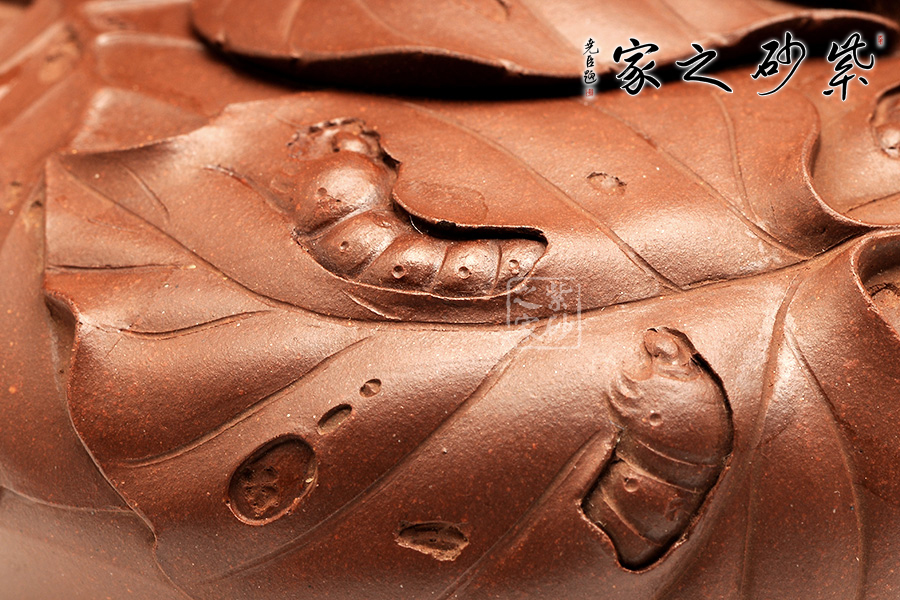 此壺壺身好似桑葉構(gòu)成,以桑葉卷裹成壺身,一片桑葉鋪成壺肩,一片桑葉與蠶寶組成壺蓋、壺鈕,葉片脈絡(luò)清晰,走向自然,起伏微妙,渾然天成矣。壺柄,構(gòu)筑倒把樣式,上端一截融于壺肩。壺嘴由壺腹自然伸出,又像是桑葉的葉柄,唯“自然”二字可述其神。壺肩、壺蓋臥伏兩只蠶寶,昂首向上,似在嗅聞桑葉清香,腹部之足描畫清晰,令人嘖嘖稱奇。壺口亦為桑葉之形,處處點題。壺身之葉與壺肩之葉自然鑲接,可見老師心思細(xì)膩。