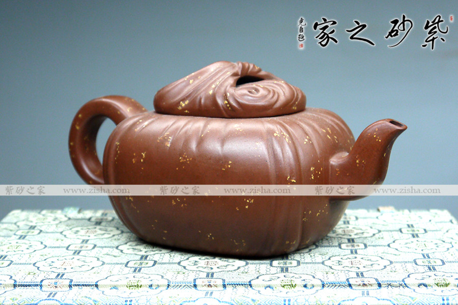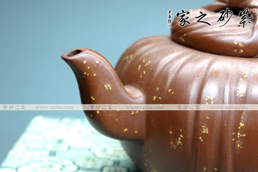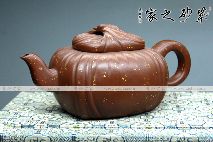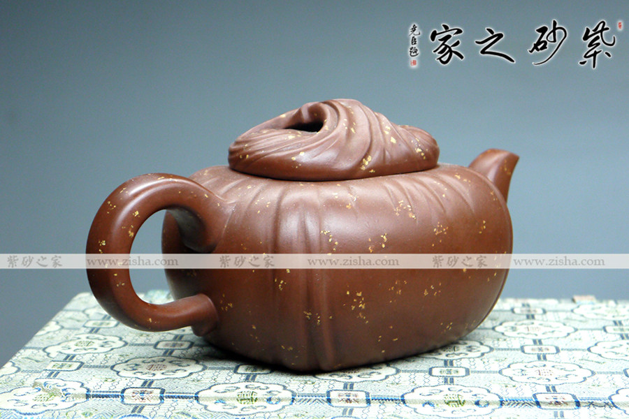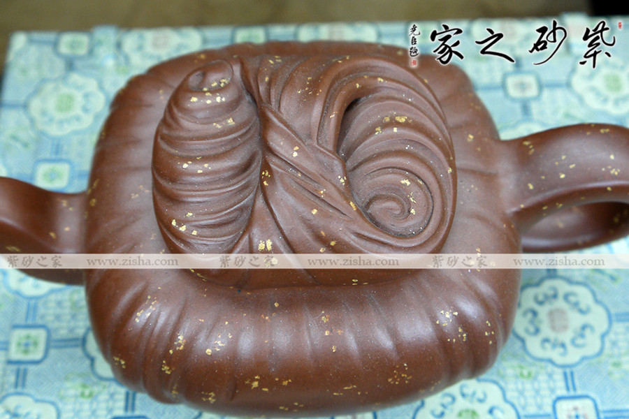 此壺壺身四方,內(nèi)斂踏實,奠定了壺的基調(diào)。壺身為包袱狀,條理清楚,紋路分明,做工無可挑剔。壺鈕為包袱結(jié)與壺蓋為一整體,經(jīng)典造型,玩味無窮。壺流嘴彎曲有致,不用繁瑣雕飾,僅用幾筆勾勒,便明其意,實用至簡。同時,壺把圓潤有感,簡明大方,把玩方便。加之整器鋪砂點點,給人在傳統(tǒng)中有一絲清亮。