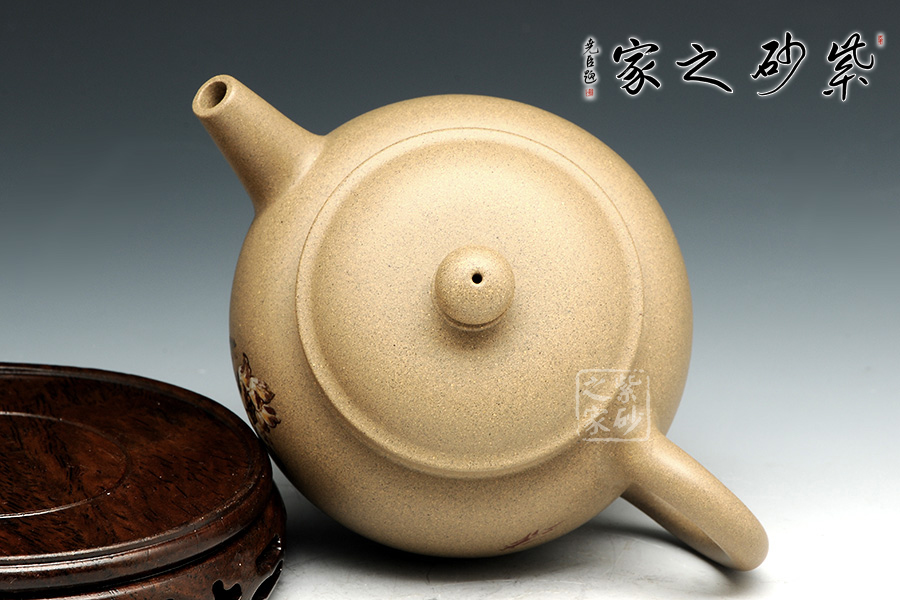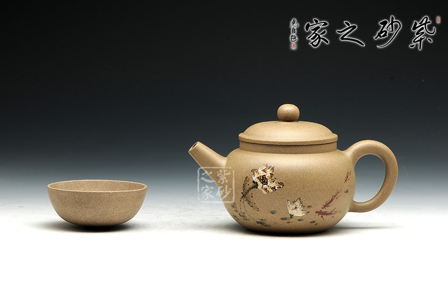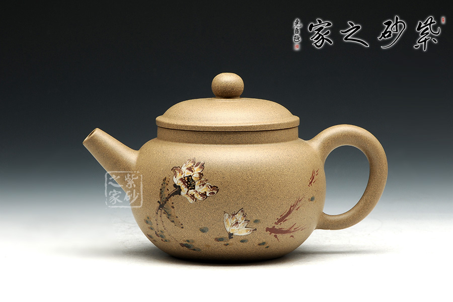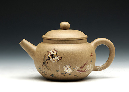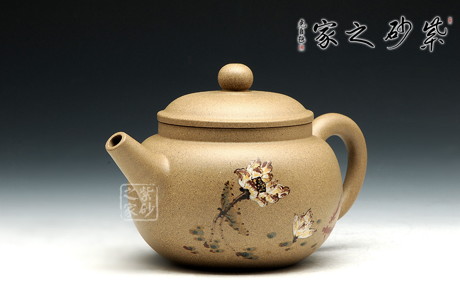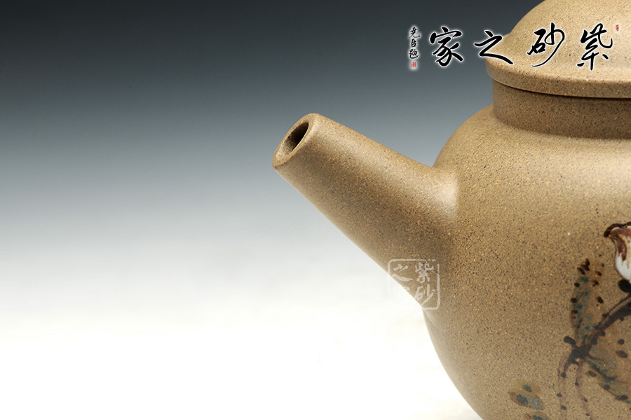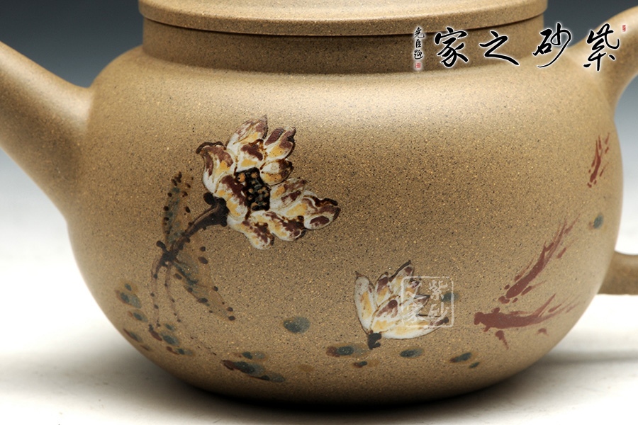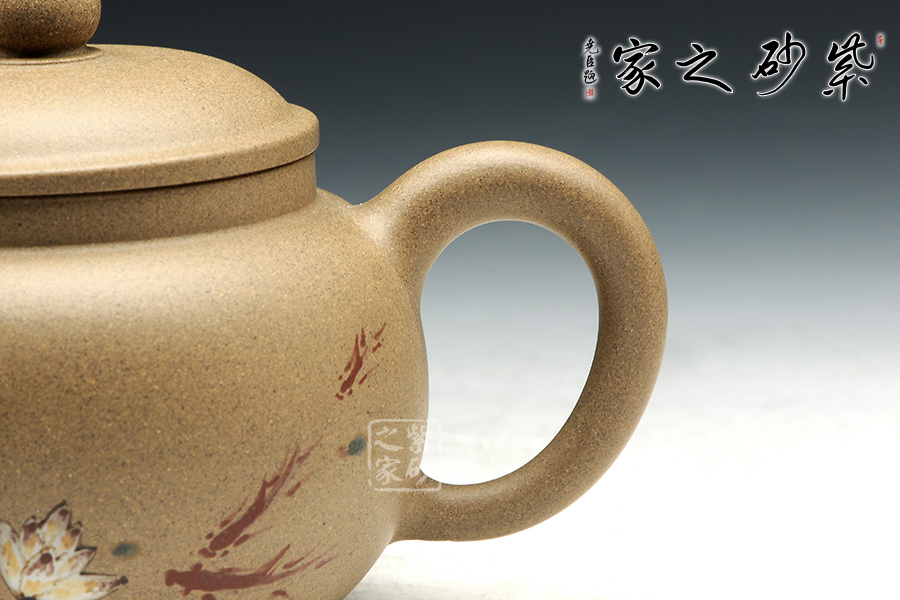 此壺通身飽滿圓和,線條簡潔,又不失雅致,壺蓋微微隆起,形如帽子,壺鈕珠圓,與壺身相呼應(yīng),壺把、壺嘴與壺口三點(diǎn)成線,平衡感強(qiáng),器形優(yōu)美雅致, 頗得古代文人之精神韻味,作品做工精美絕倫,造型獨(dú)特,清新優(yōu)雅,氣韻生動。壺身采用的是特別的泥繪裝飾工藝,壺身前繪制荷蓮自然嬌羞,似有清香徐來。