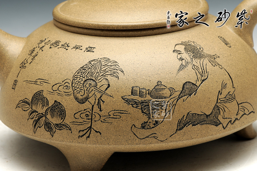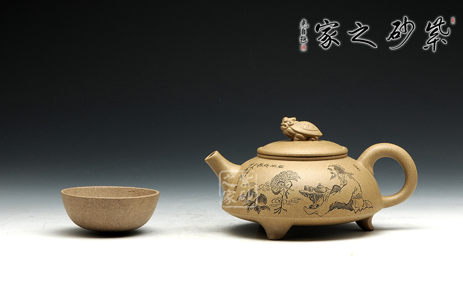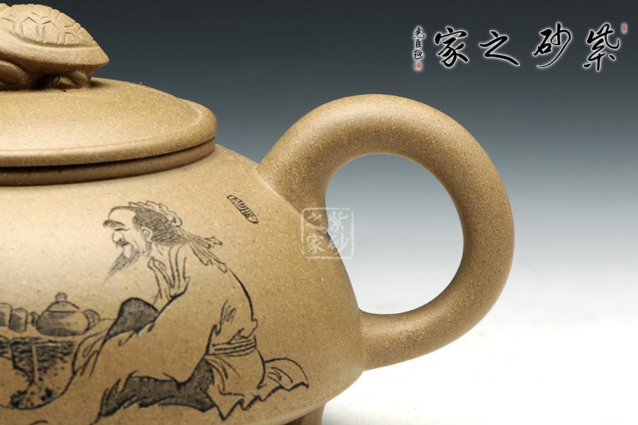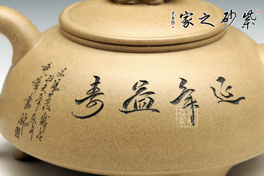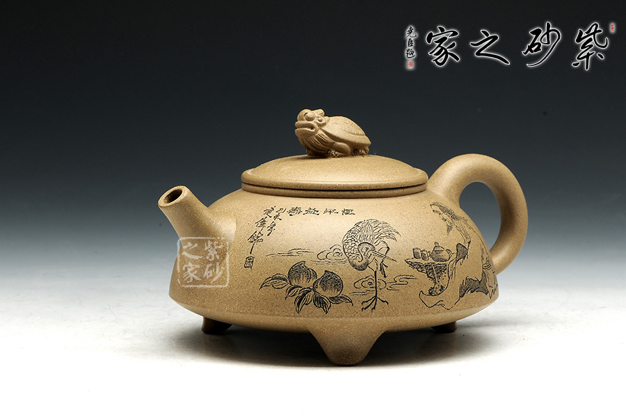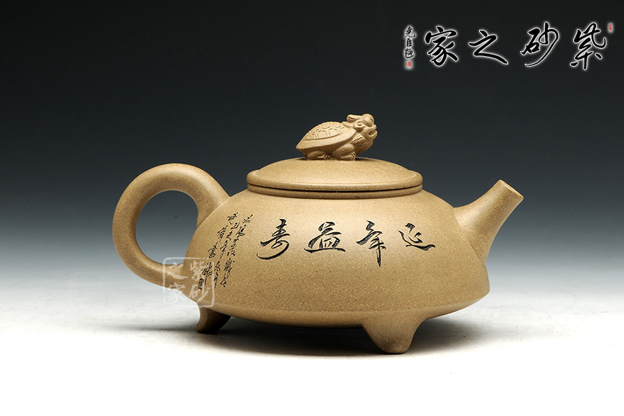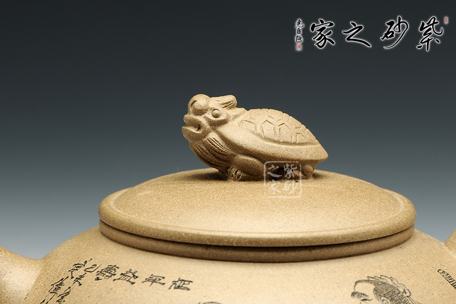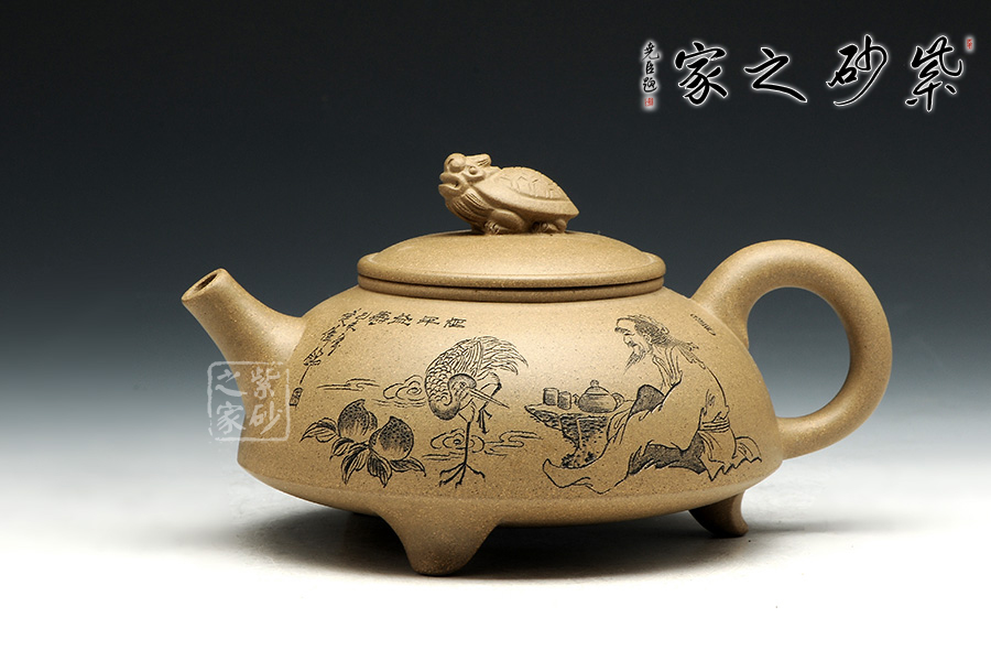 此壺造型典雅內(nèi)斂,線條大方得體,線面弧度自然,三足外撇鼎力,顯得沉穩(wěn)。整器上斂下豐,細(xì)膩有感,壺嘴與壺把明接與壺身,實(shí)用適手。壓蓋微鼓,上以龍龜裝飾作為壺鈕,造型制作精細(xì),代表長(zhǎng)壽祝福,寓意延年益壽。
