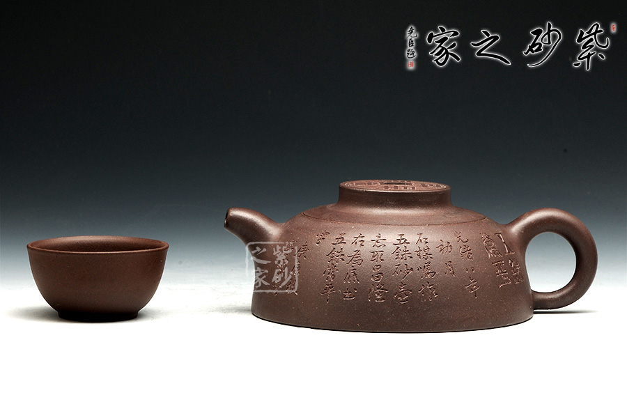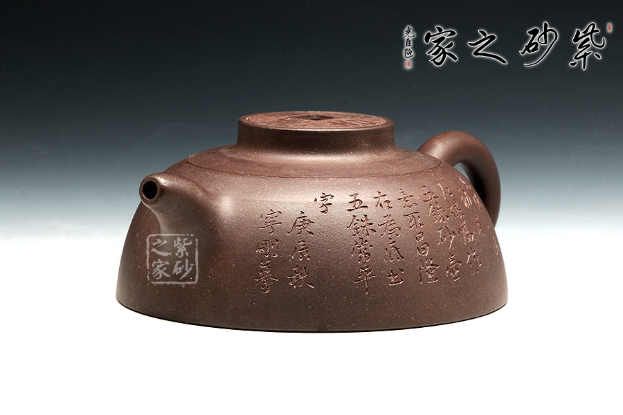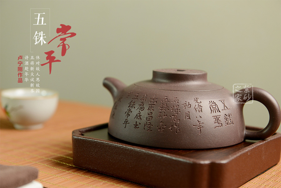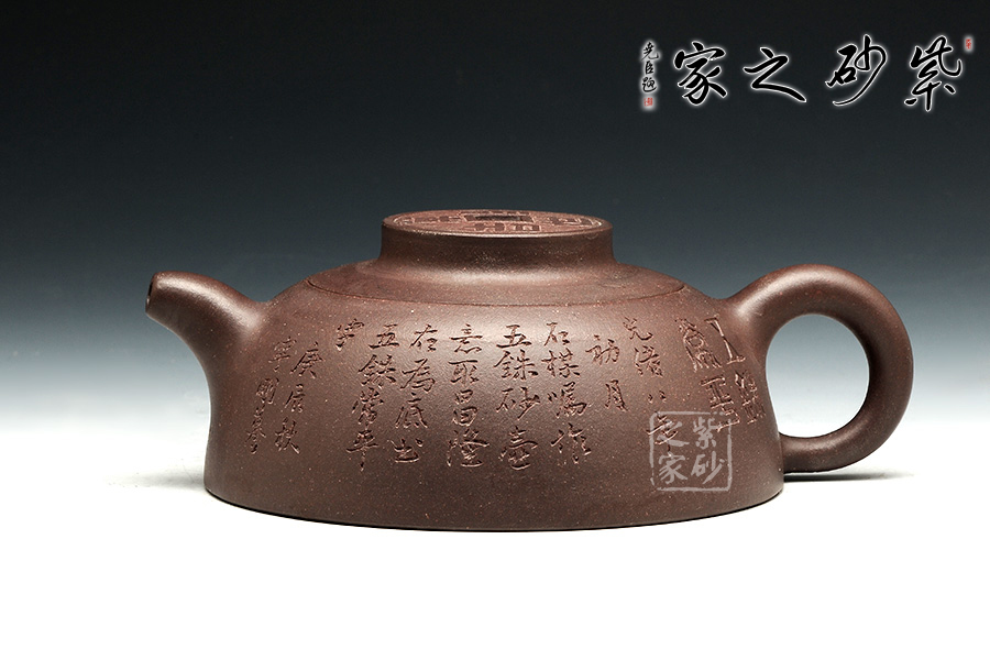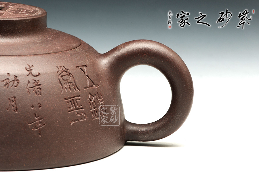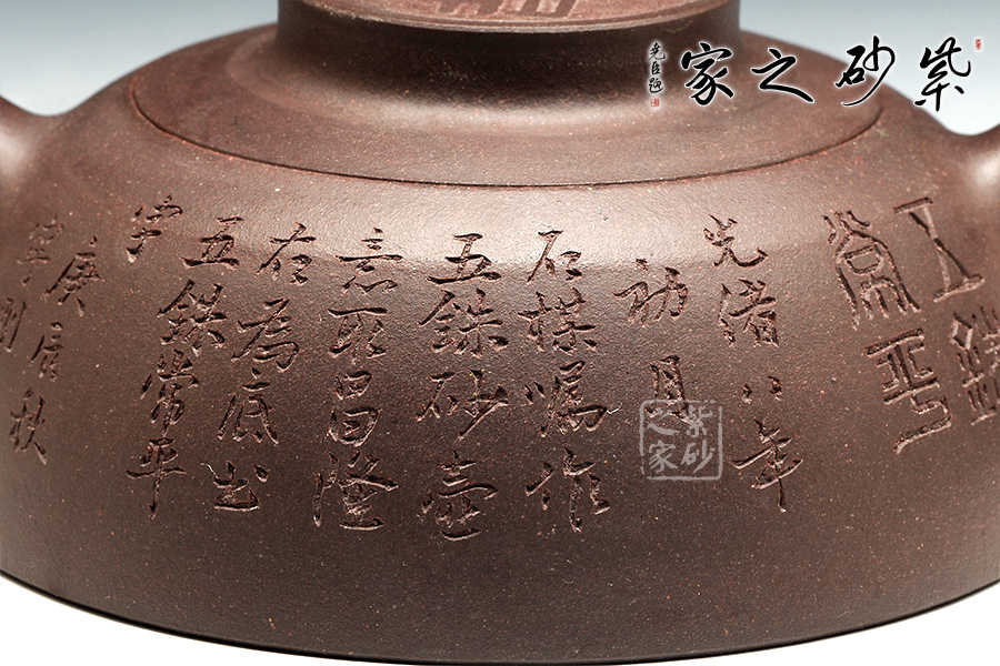 通體裝飾: 裝飾: 詩(shī)詞 裝飾者:盧寧剛 裝飾內(nèi)容: “光緒八年冬月,石楳囑作五銖砂壺,意取昌隆”