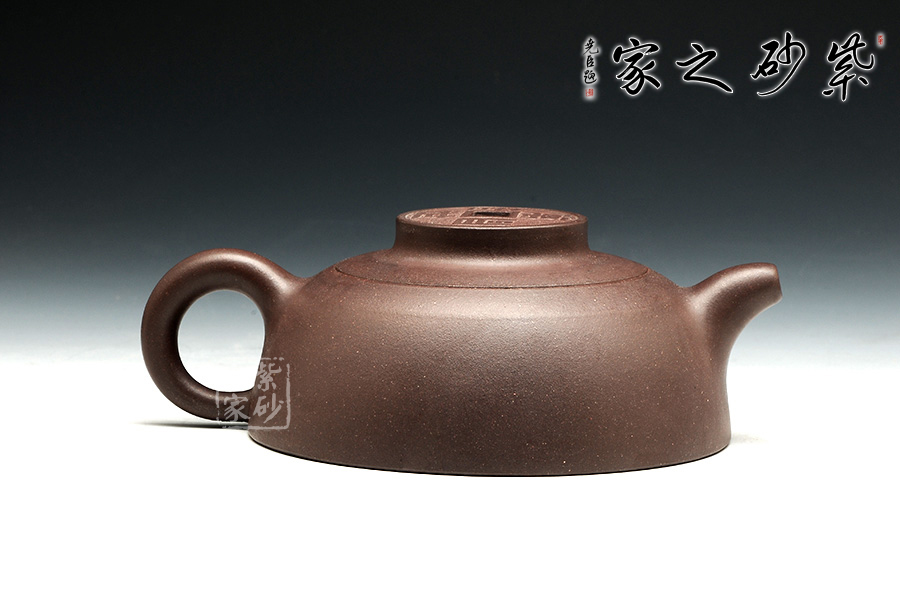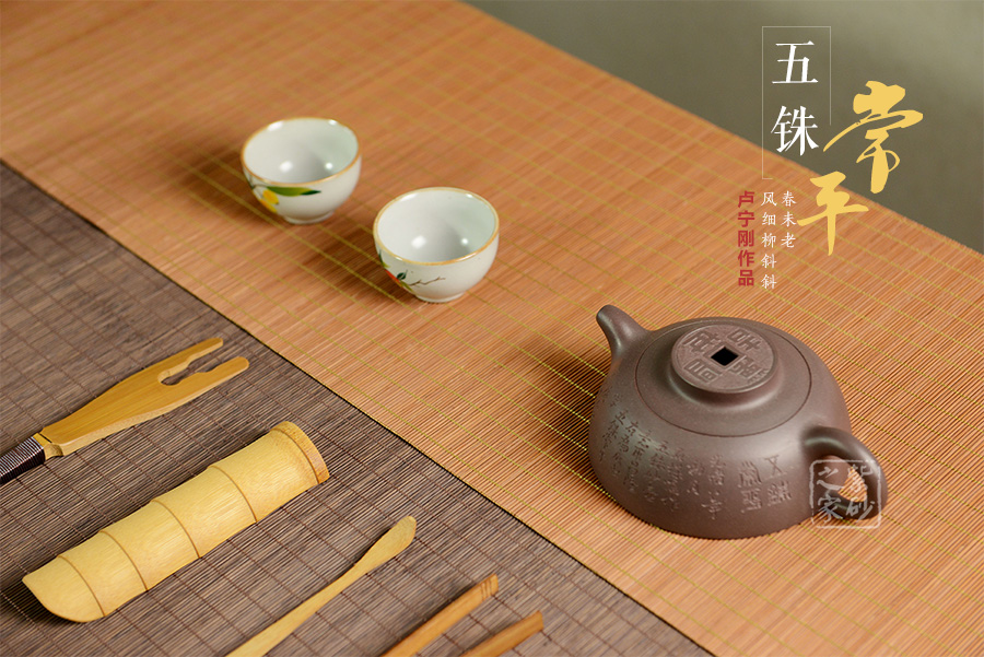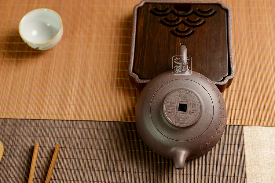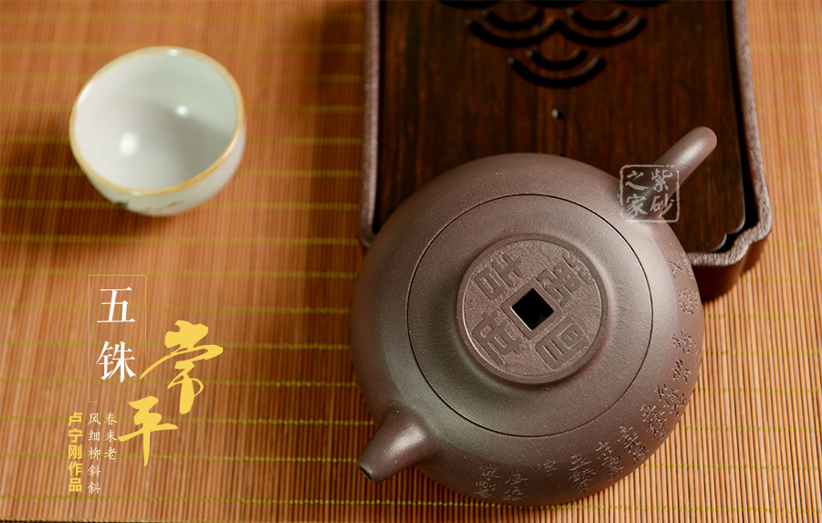 盧寧剛老師這把五銖常平壺,器型設(shè)計(jì)巧妙,穩(wěn)重大氣。壺身為半圓,嵌蓋吻合,蓋上塑錢(qián)幣壺鈕,玄妙非常。流把纖細(xì)精巧,線條流暢。此器創(chuàng)自清末,以北齊宣帝高洋天保年間所鑄“常平五銖”錢(qián)為創(chuàng)意原型。壺身銘刻已經(jīng)完全說(shuō)明了此器出處“光緒八年冬月,石楳囑作五銖砂壺,意取昌隆 ”。盧寧剛老師加字“右為底銘,五銖常平字,癸巳年 寧剛書(shū)”。