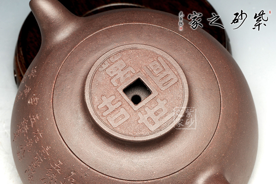 又因“常平五銖”錢(qián)名為“常平”,有“平安常在”之意,很多收藏愛(ài)好者取其吉祥寓意,常常攜帶在身邊作為護(hù)身符使用。而此壺亦然,取用此壺自有平安常在之寄望。此壺塑造基本摹古為主,蓋鈕成五銖樣,上刻陽(yáng)文“萬(wàn)世吉昌”,壺底刻“常平五銖”錢(qián)紋,整器大俗大雅,古意盎然。盧寧剛老師陶刻字體俊秀有力,運(yùn)刀老辣自如,值得收藏!