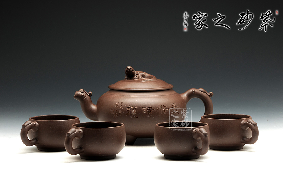 此壺壺嘴采用龍頭裝飾,雕刻精致,壺把對稱呼應(yīng),別致而精美。壺身飽滿圓潤,壺底處三足而立,內(nèi)斂沉穩(wěn)。壺蓋微鼓,子母線壓合,氣密性良好,上壺鈕為螭龍,好似彎茄形、又似卷云形的刻紋,線條流暢,使整個螭龍顯得活潑有趣。整個作品泥質(zhì)上乘,色澤紅而不嫣,表現(xiàn)出細膩圓潤,輔以四杯,相輔相成,實用與賞玩皆宜。
