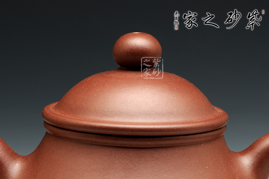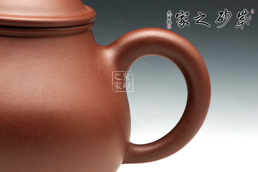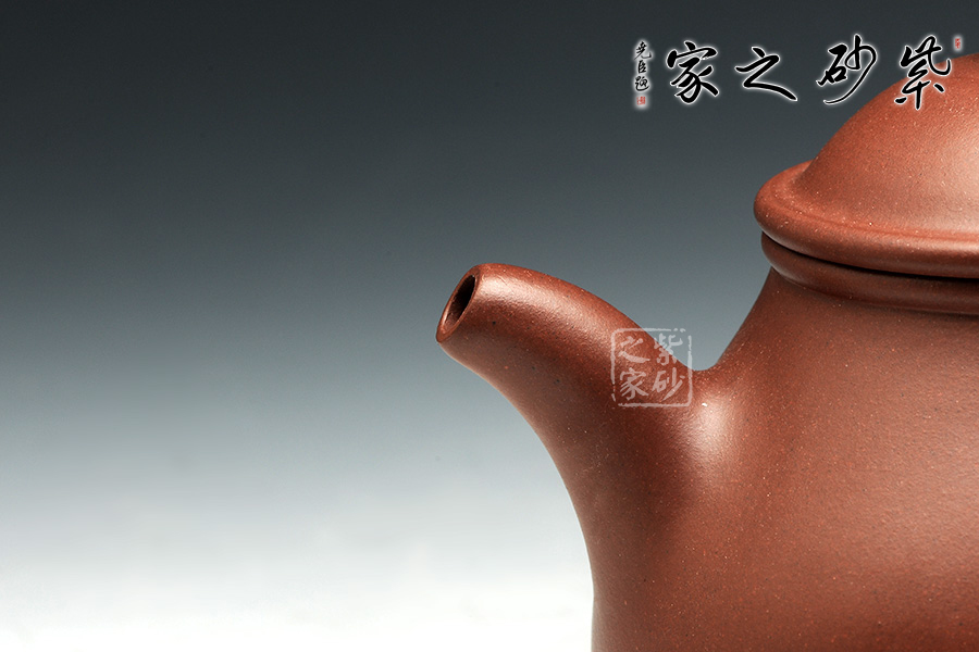 此款潘造型經(jīng)典,原礦底槽青泥料的使用使壺色澤溫潤,質(zhì)感細(xì)膩。壺腹如鼓向下緩緩收成底,壺肩之處略微收縮成短小壺頸。壺體整體氣質(zhì)豐腴而飽滿,又不失典雅。壺蓋微微隆起,壺鈕型制與壺身一致,相互呼應(yīng)。彎流壺嘴與壺身暗接相連,明針處理到位。