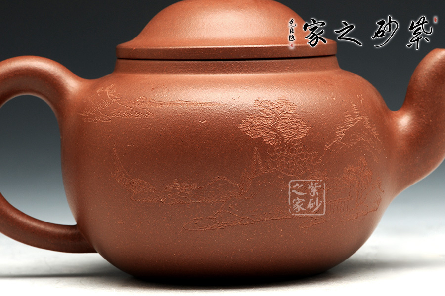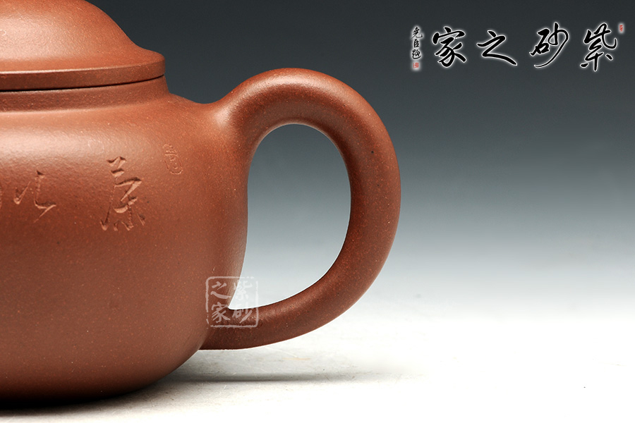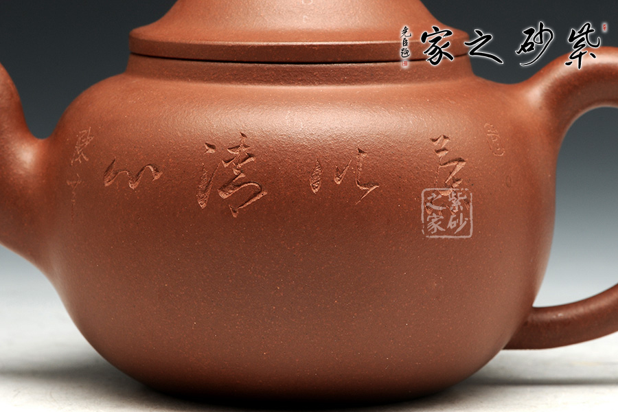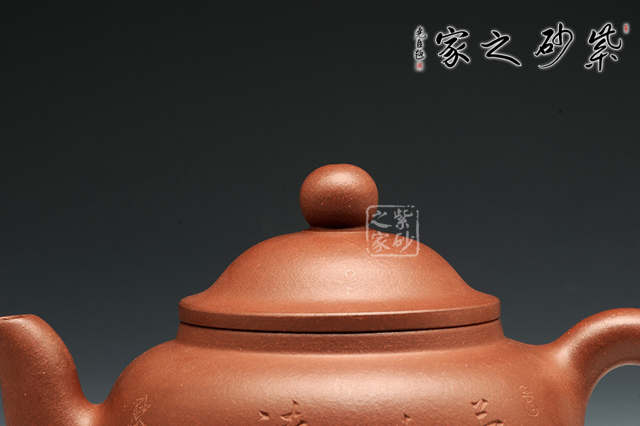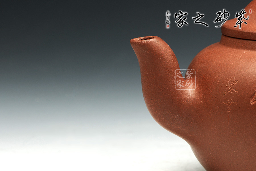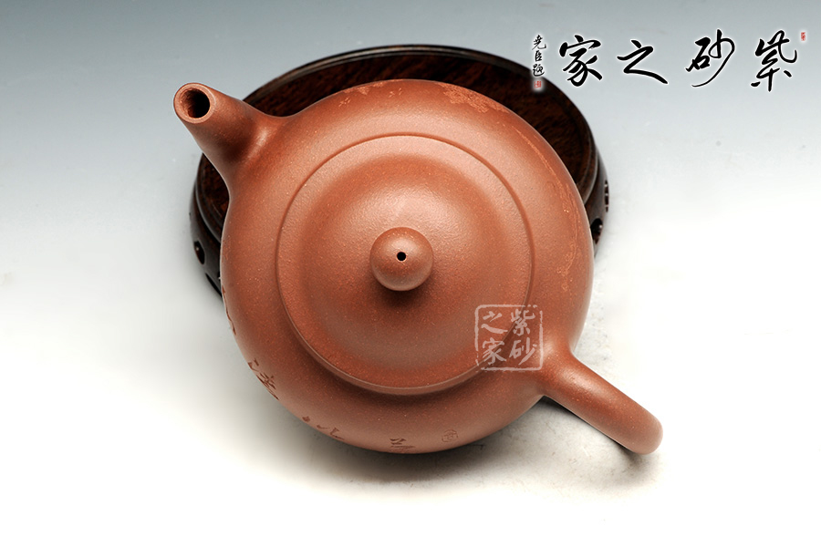 此壺有著渾圓的壺身,半圓的壺蓋,圓鈕,線條流暢,比例得當(dāng),壓蓋略微渾厚,點(diǎn)線之間見出魅力,子母線口蓋溫和嚴(yán)密,骨肉亭勻,簡(jiǎn)練大方,制作頗見功力。彎流嘴胥出,在端頭下壓,柔美之姿明顯,壺柄略微上抬之后優(yōu)雅滑落而下,形成一條圓潤(rùn)飽滿的弧線,樸雅大方。原礦紫泥的質(zhì)感輕柔雅致,清心醒神。