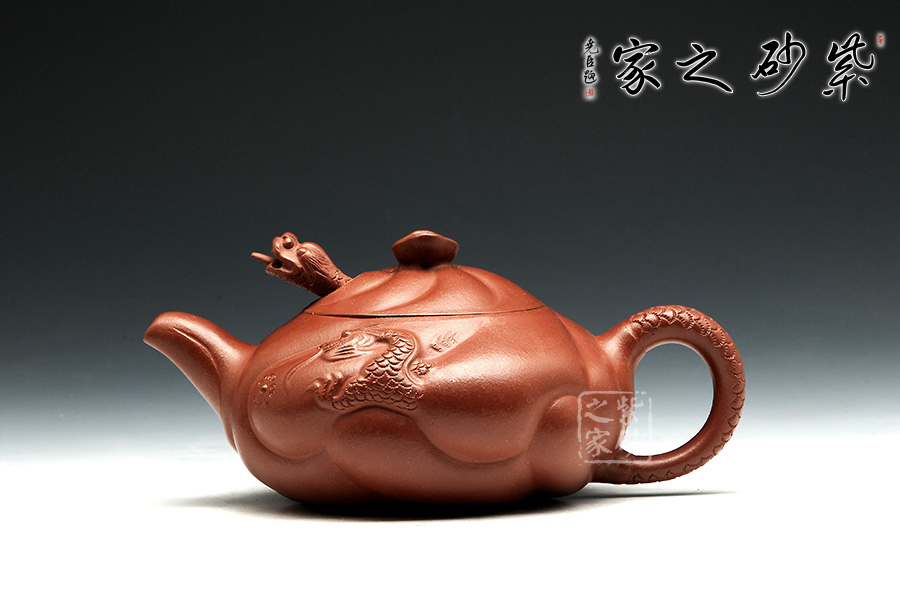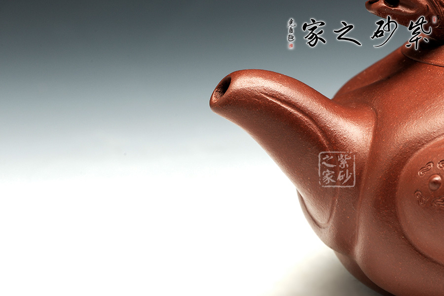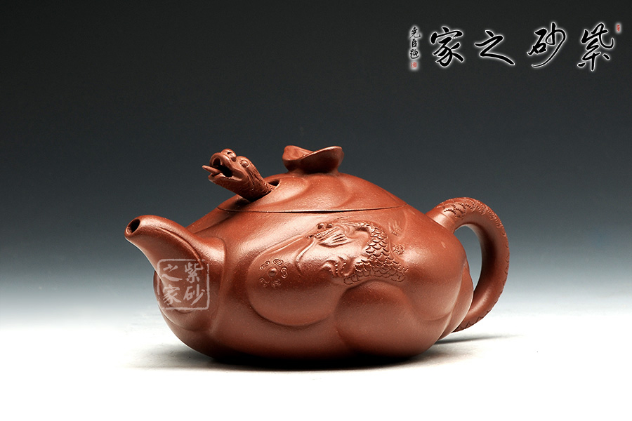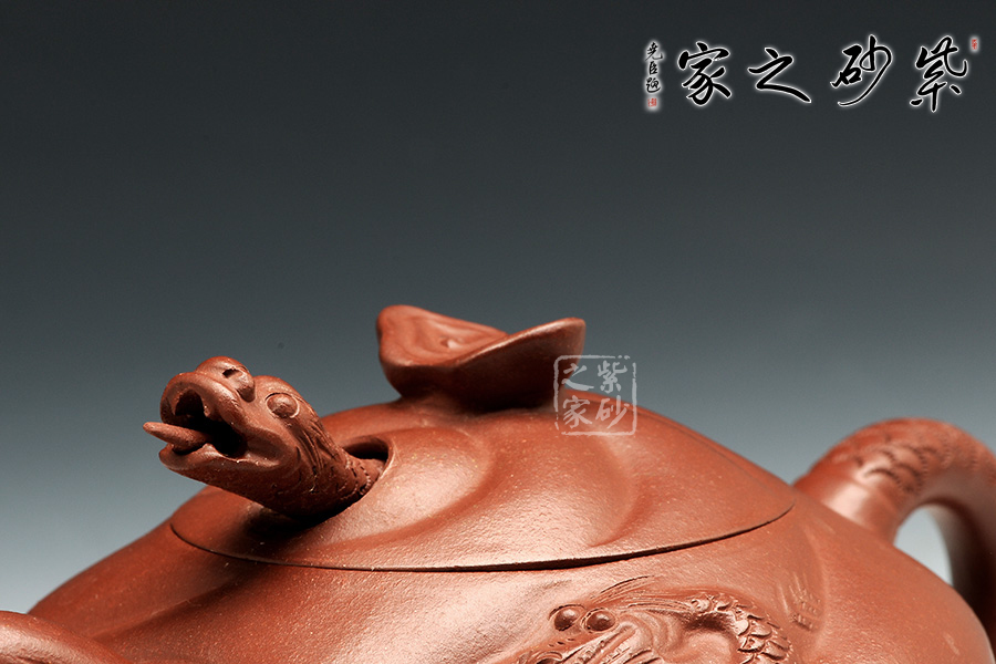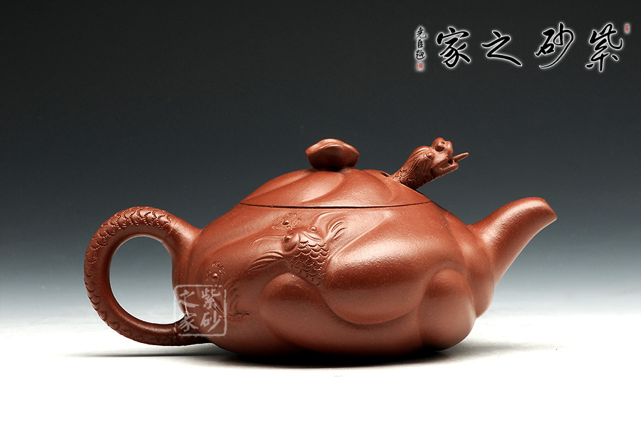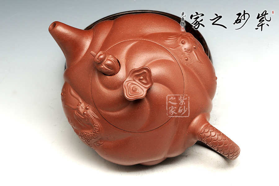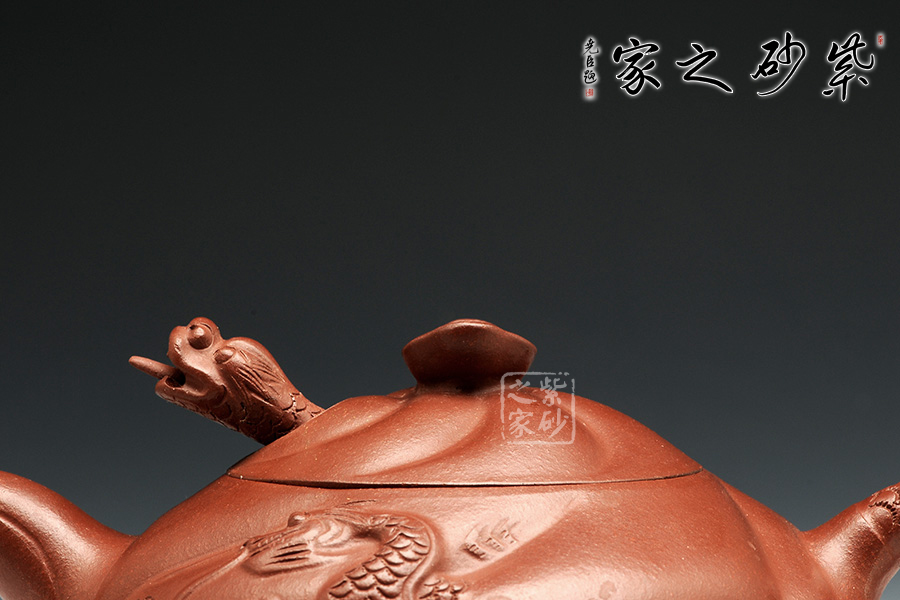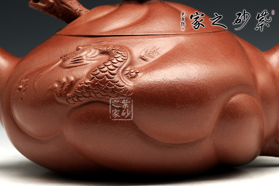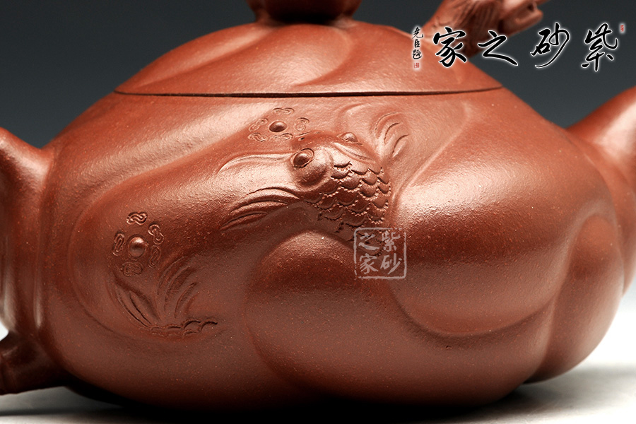 此款扁魚(yú)化龍?jiān)煨蜆?gòu)思巧妙,魚(yú)、龍、云的裝飾與壺身渾然一體。通身作海水波浪狀,線條流利,簡(jiǎn)潔明快。魚(yú)龍吐珠、神韻生動(dòng)。壺蓋安裝的龍首伸縮自如,優(yōu)美靈活。配以龍尾執(zhí)柄奇趣極生。作品用料考究、精工細(xì)制。壺身云紋間忽現(xiàn)龍騰、魚(yú)躍!壺把以龍身及尾,壺蓋鈕下,龍頭伸縮自如,活神活現(xiàn),栩栩如生,經(jīng)典之作,精工細(xì)作,完美呈現(xiàn)!