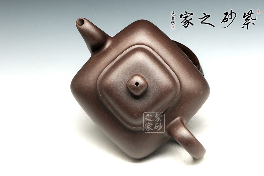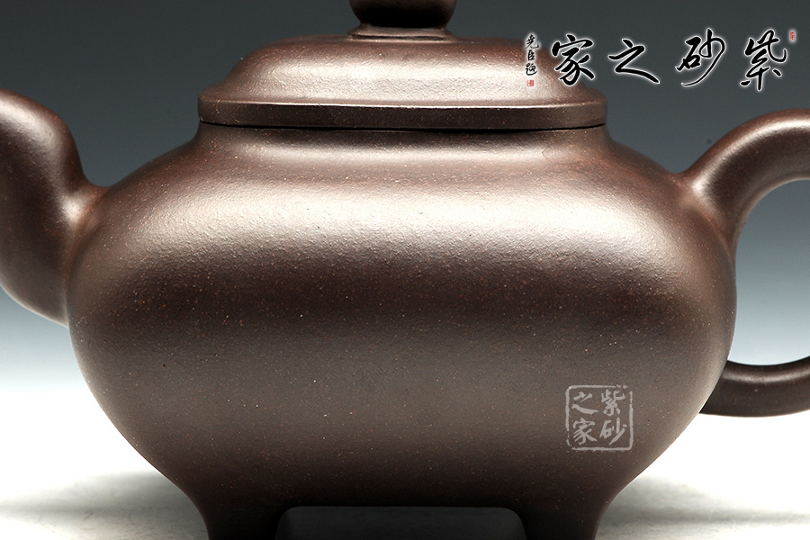 傳爐是紫砂壺的一個經典器形,其制造型取材于青銅器。器身形狀以方器為基本形,但方中寓圓,比一般方器多了一份圓潤之美。壺嘴的造型難度亦高,方中帶圓,圓里寓方,三彎流式曲折有致,出水流暢。壺蓋延續(xù)了全器造型特微,方型圓角,壓蓋形式,制作精良的壺蓋要能四面通轉無礙,且面面俱到,能接續(xù)全壺氣韻。底足皆采用四顆“釘足”形式,且多屬短柱型,精巧別致,落地穩(wěn)重。