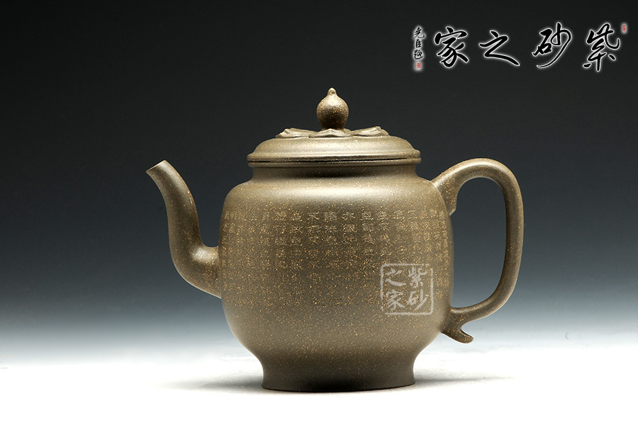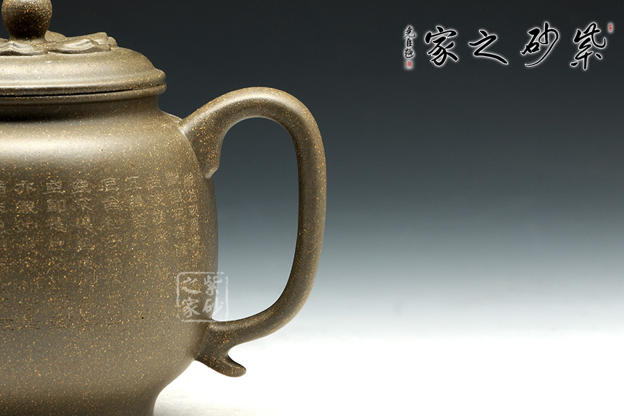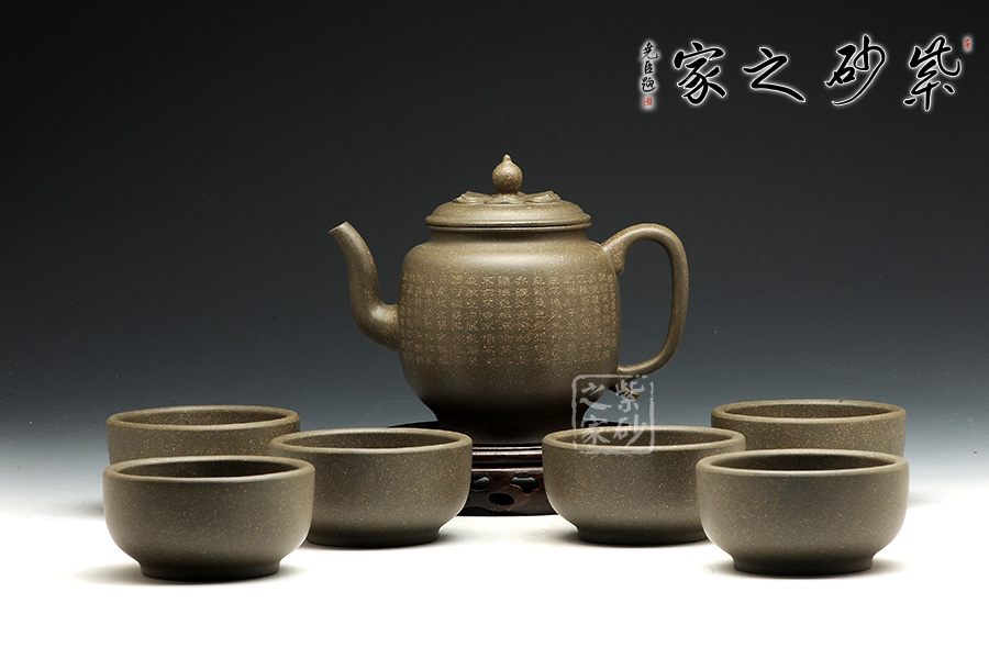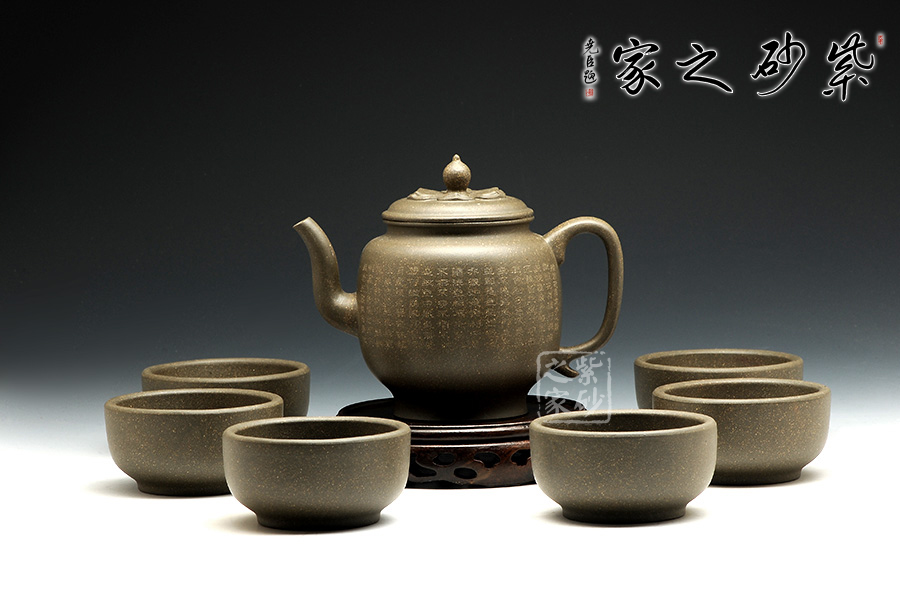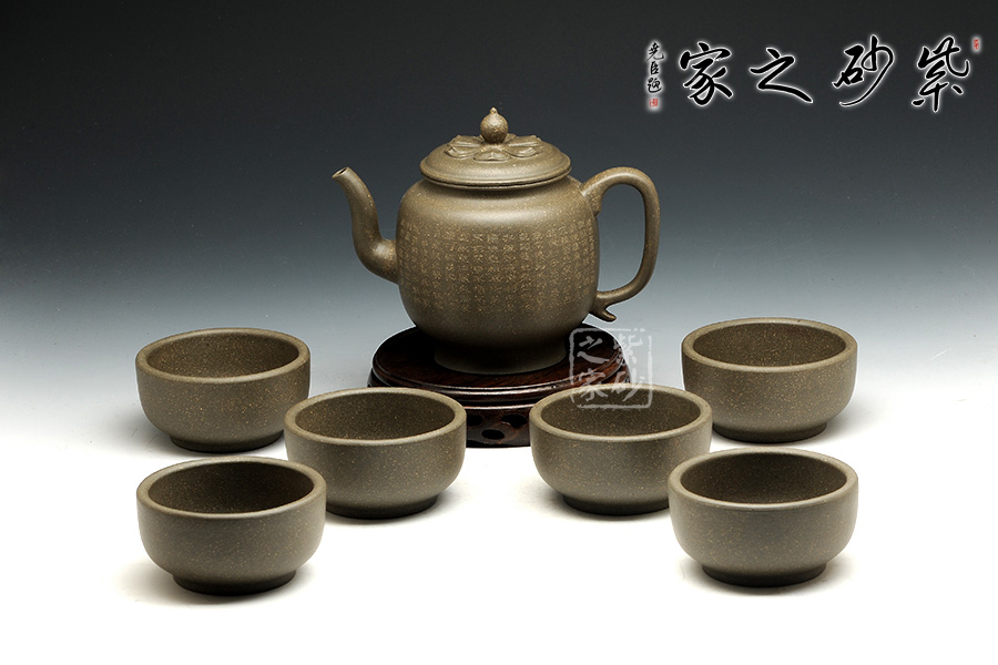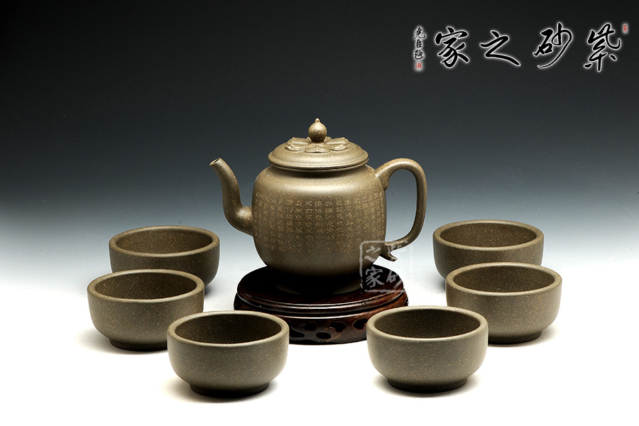 該壺形制簡(jiǎn)潔,極富韻味,壺體一身素氣,與禪意相通,精選豆青泥制作,低調(diào)內(nèi)斂。壺流線自然合度,將壺型演繹的飽滿豐腴,恰到好處。壺蓋與壺口嚴(yán)絲合縫,好似蓮臺(tái)靜心,典雅端莊,頗具禪意。蓮心形壺似那禪珠,似乎可碰撞出靜心禪音。整器精巧別致、玲瓏精細(xì),線條的轉(zhuǎn)折過(guò)度自然,宛若天成,壺身以禪意詩(shī)詞,更顯感悟。輔以六杯,古樸典雅,可用之品茗靜心。