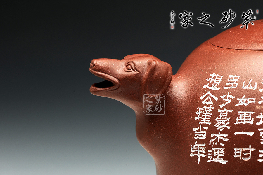 此壺設(shè)計簡練,線條飽滿周正,壺嘴與壺把以狗獸首為造型,貼切原型,值得玩味。圓鈕簡練,壺底自然,一上一下相互襯托,共筑完整。
