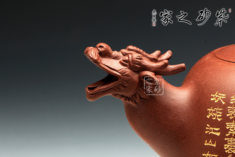 此壺設(shè)計簡練,線條飽滿周正,壺嘴與壺把以龍獸首為造型,貼切原型,頓顯霸氣。壺蓋嵌蓋,整器宛如一體,壺鈕圓粒,簡單利落。