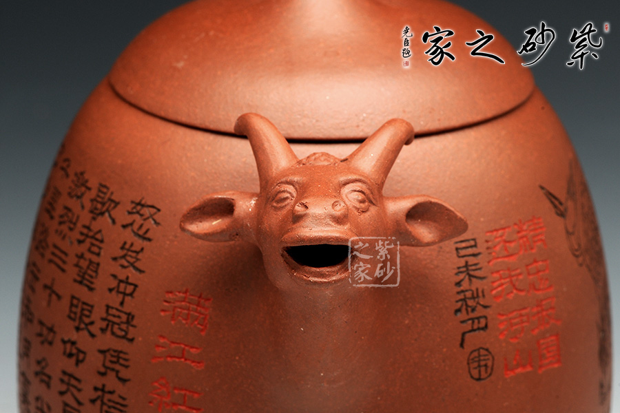 同時(shí),十二生肖中的牛象征著踏實(shí)、勤勉。這款作品古樸內(nèi)斂,且寓意深刻,壺身刻繪人物詩(shī)詞《滿江紅》。