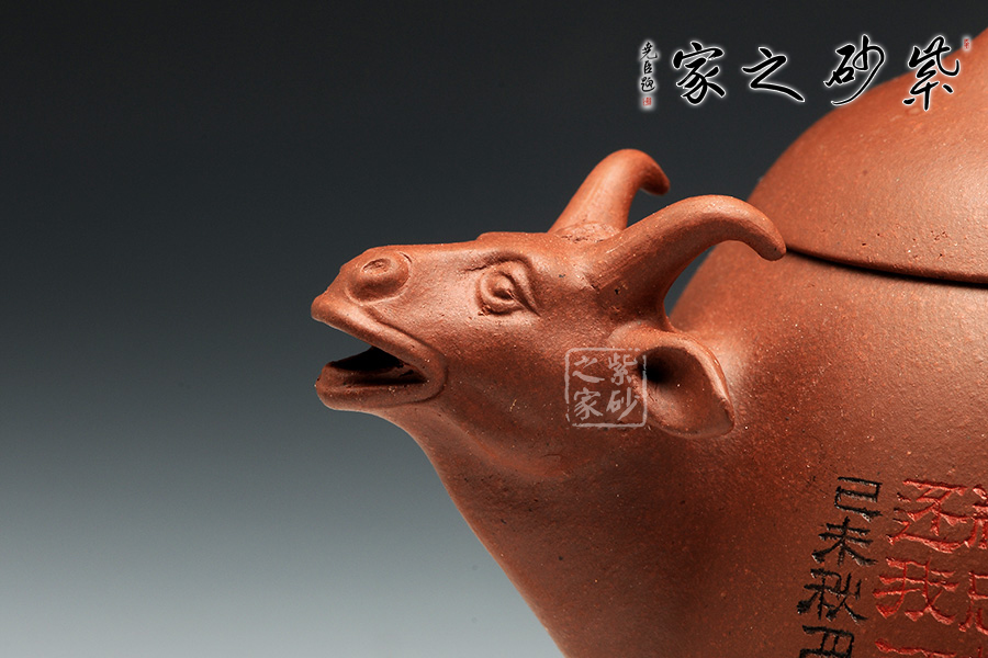 此壺設(shè)計(jì)簡(jiǎn)練,線條飽滿周正,好似秦權(quán),壺嘴與壺把以牛獸首為造型,貼切原型,實(shí)在自然。