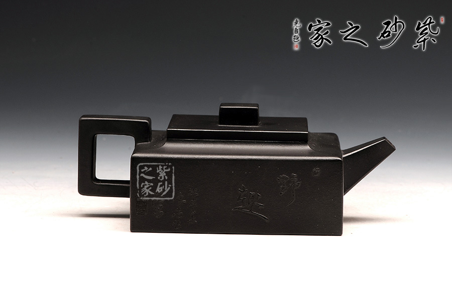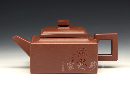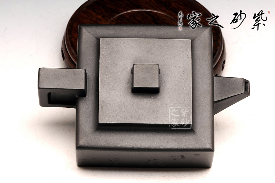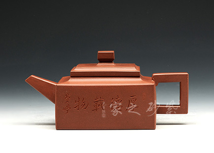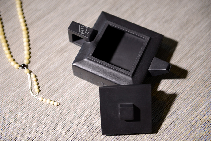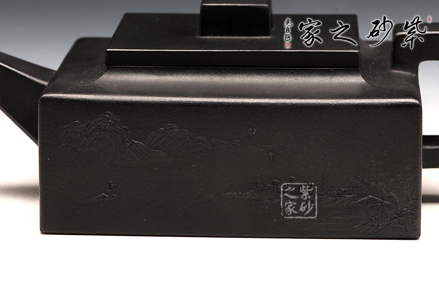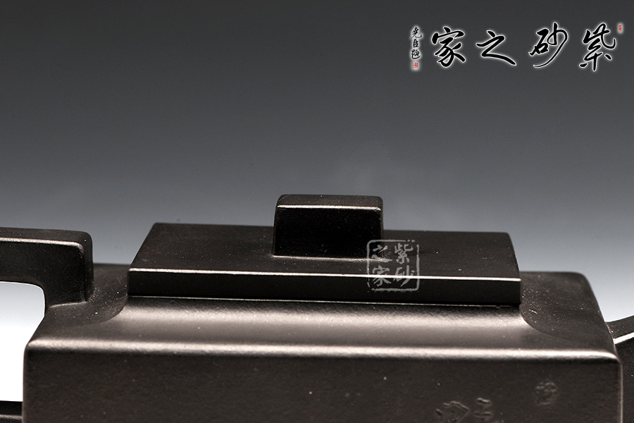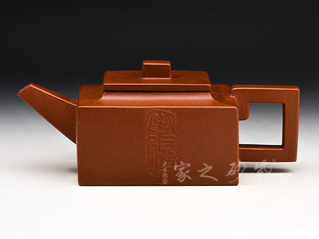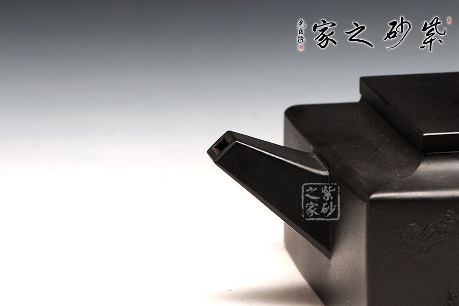 方山逸士壺有托物言志的妙用,其型其韻都是壺中代表。作品全部用方形展示,棱角分明,線條筆挺,絕對是逸士的最鮮明特色。壺身為長方形,壺蓋與此相同,肩部過渡有線條清晰展示,愈發(fā)明了大氣。壺鈕為四方橋型,工整自然。壺嘴雖然有粗細漸變,但同樣是四方外觀。與此對應,壺把的形態(tài)也是筆挺大氣。