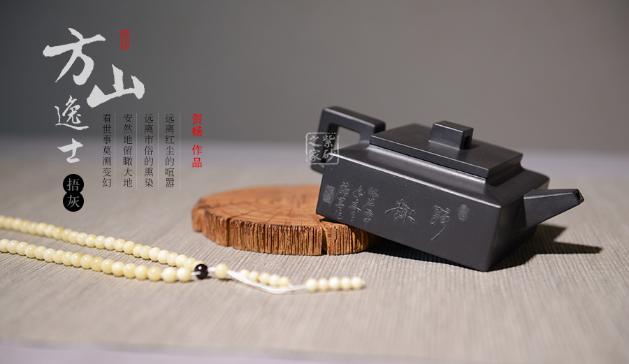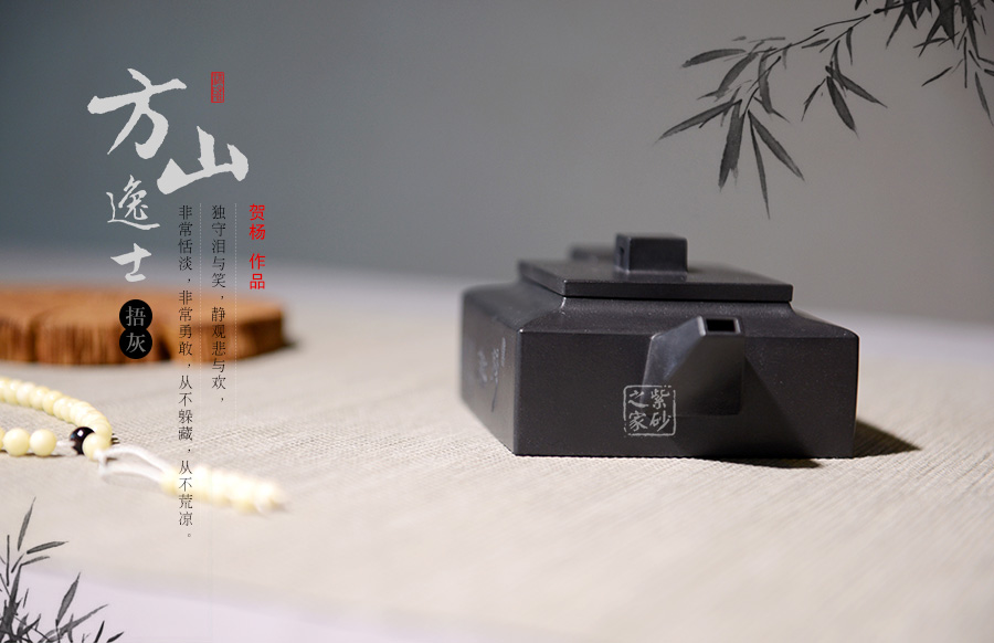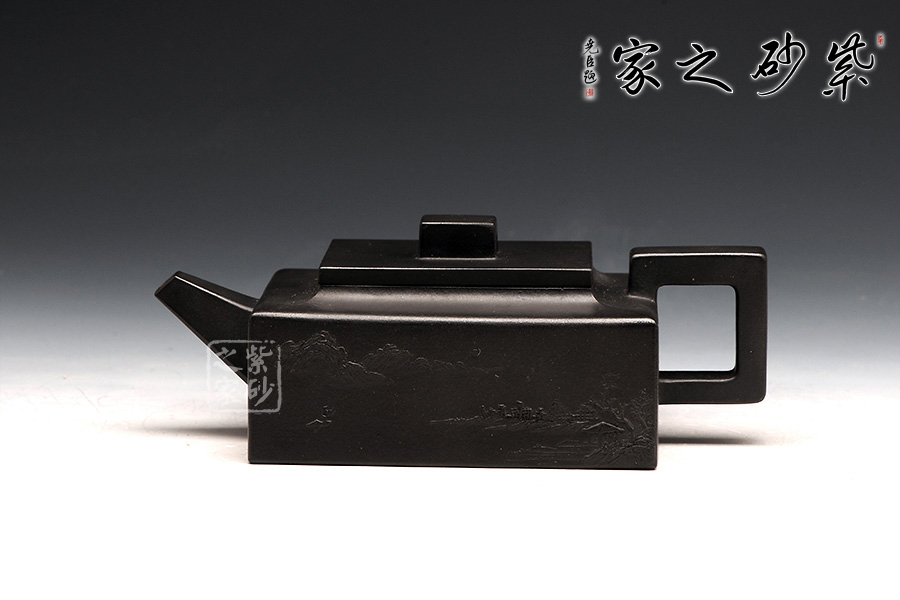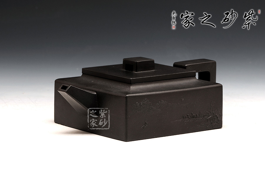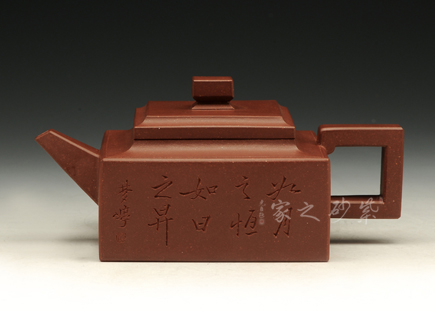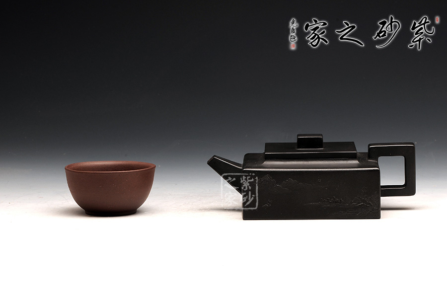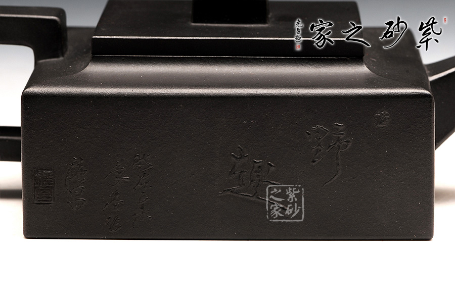 方山逸士壺有托物言志的妙用,其型其韻都是壺中代表。作品全部用方形展示,棱角分明,線條筆挺,絕對是逸士的最鮮明特色。壺身為長方形,壺蓋與此相同,肩部過渡有線條清晰展示,愈發(fā)明了大氣。壺鈕為四方橋型,工整自然。壺嘴雖然有粗細漸變,但同樣是四方外觀。與此對應,壺把的形態(tài)也是筆挺大氣。