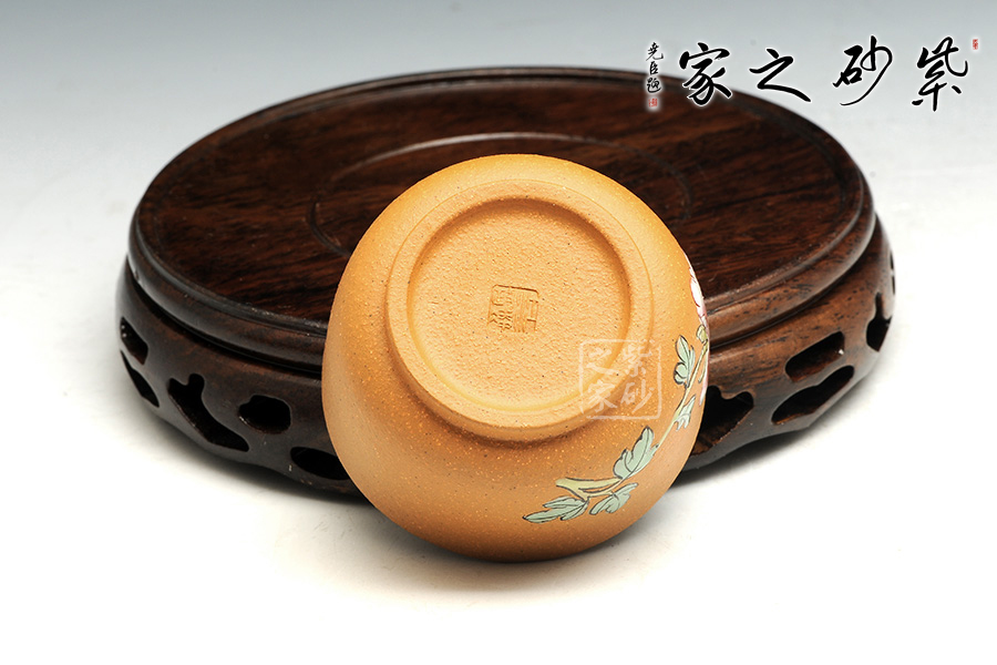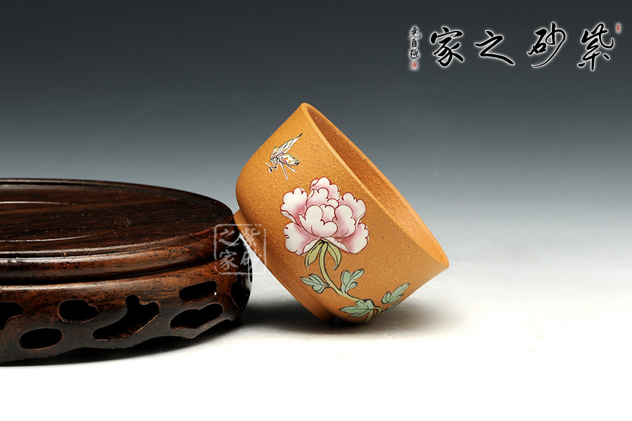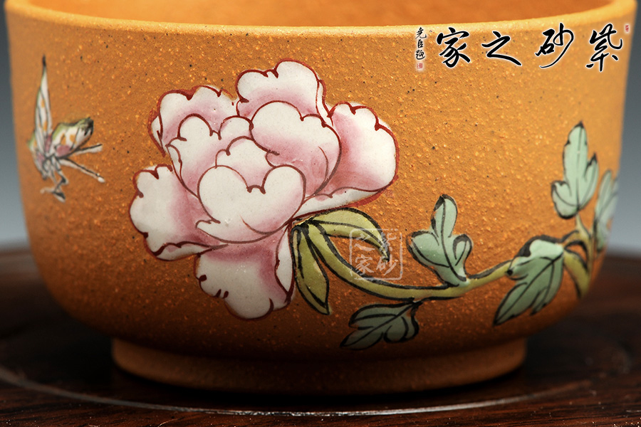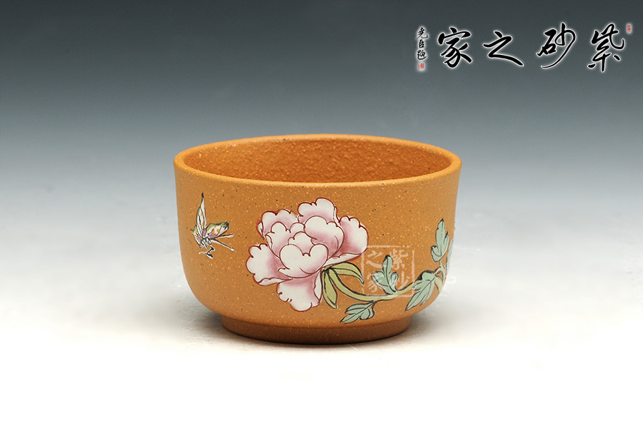 此杯精致美觀,是品茗的佳作。杯子小巧可愛(ài),寓方于圓??诖蠖懵哉舷聢A筒型線條變化均勻和緩,至底部收尾利落自然。以紫砂泥精制,加之釉水點(diǎn)彩牡丹,顯得古樸典雅,值得玩味。