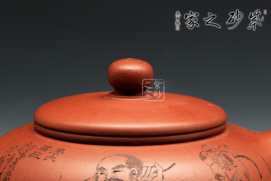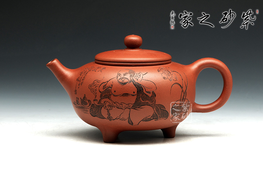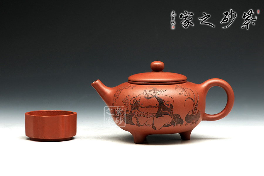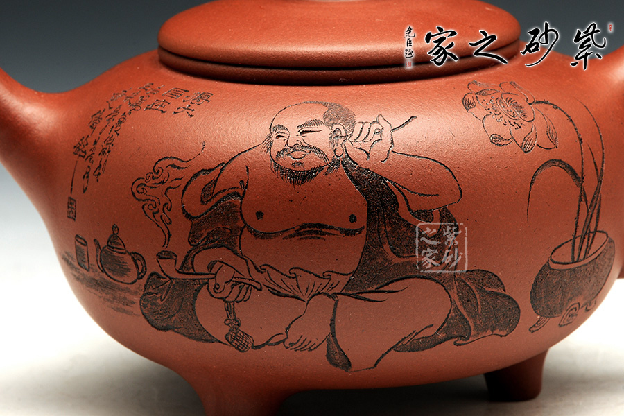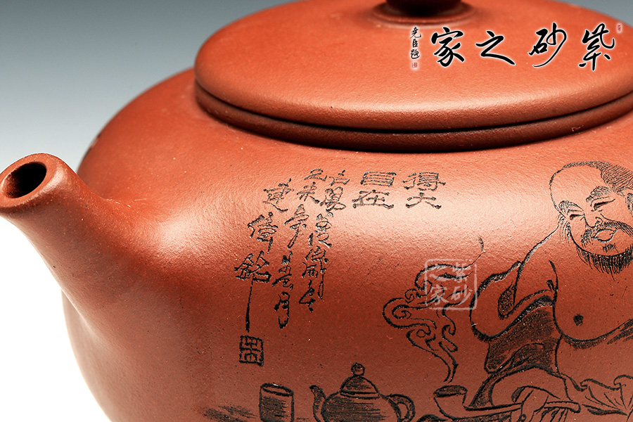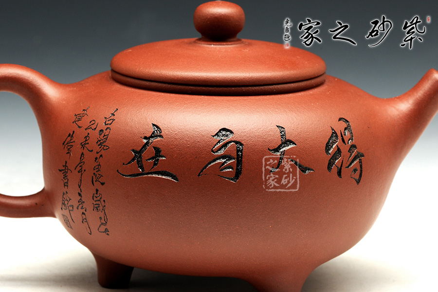壺型皆用圓弧來展示,圓珠鈕、子母線、飽滿的壺身,平整的壺蓋,三足小巧平穩(wěn),耳形把渾圓均勻。壺嘴為直流,上翹的形狀可愛有趣。刻繪為朱建偉大師手筆,正面是老翁自然自在,挖耳撓腮,背面是“得大自在”四個(gè)字,刻繪的筆畫生動(dòng)有力,非常增色。