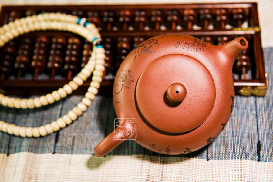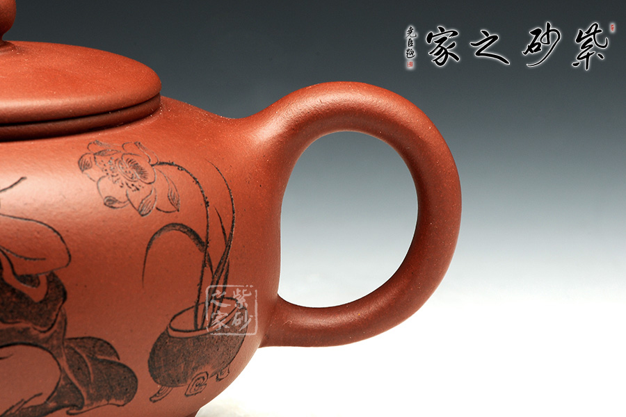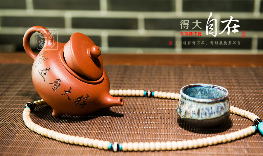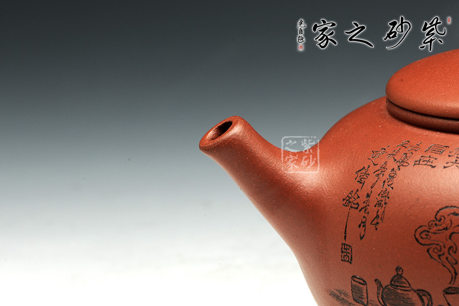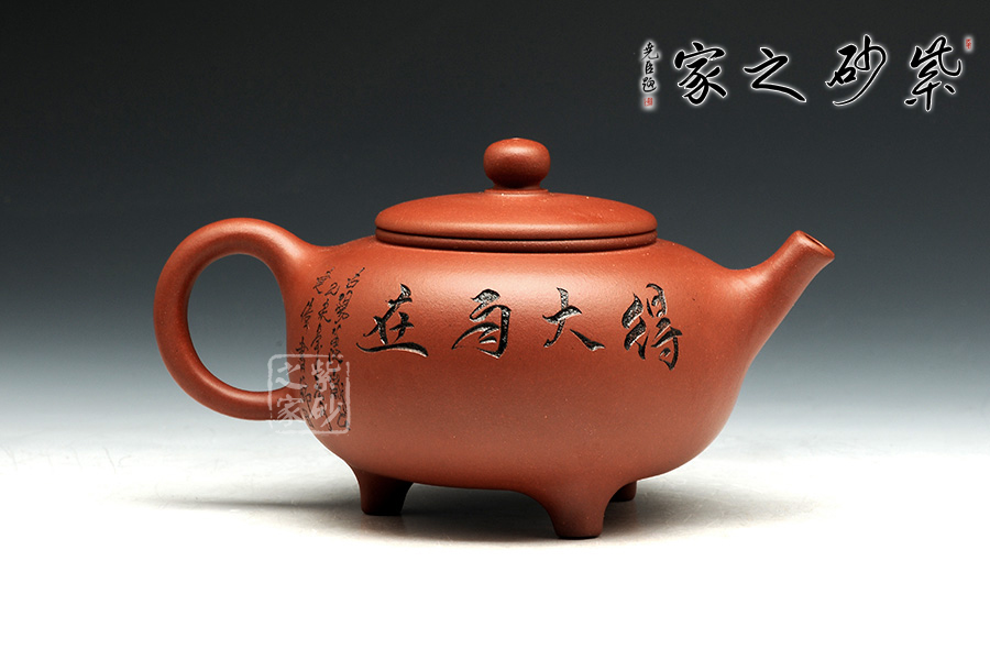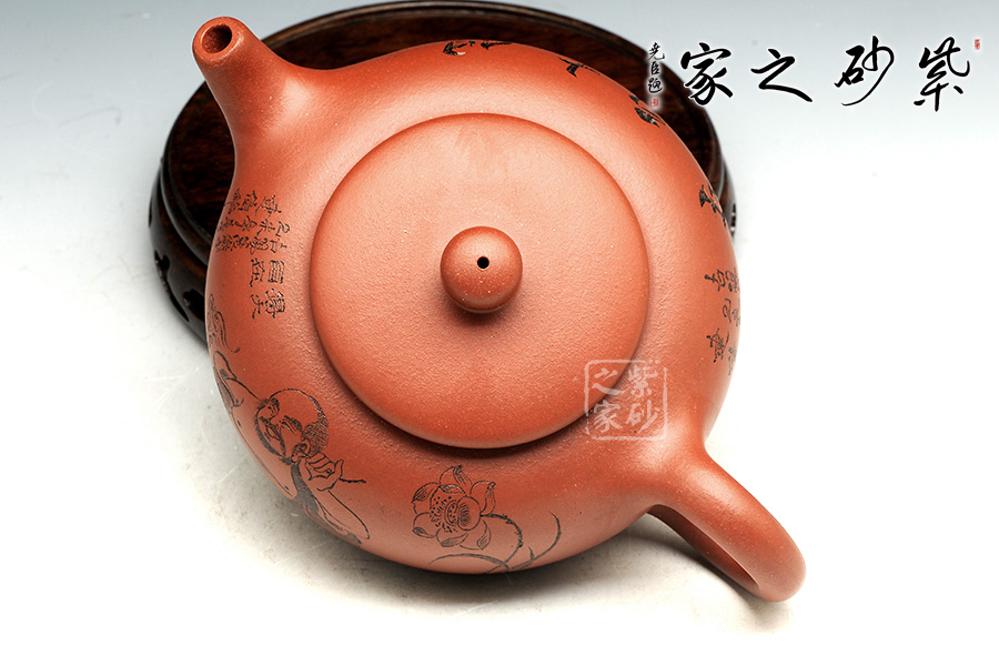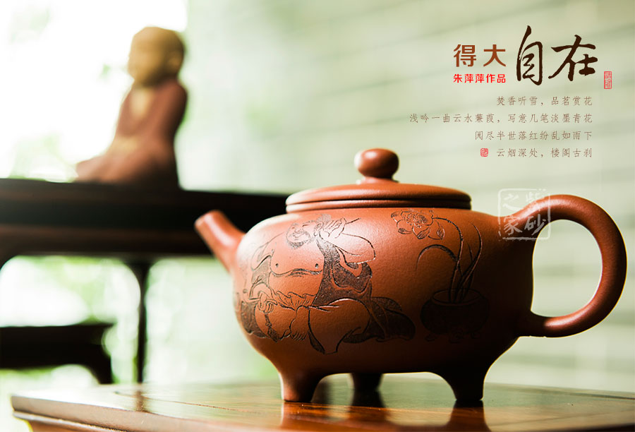 壺型皆用圓弧來展示,圓珠鈕、子母線、飽滿的壺身,平整的壺蓋,三足小巧平穩(wěn),耳形把渾圓均勻。壺嘴為直流,上翹的形狀可愛有趣。刻繪為朱建偉大師手筆,正面是老翁自然自在,挖耳撓腮,背面是“得大自在”四個(gè)字,刻繪的筆畫生動(dòng)有力,非常增色。