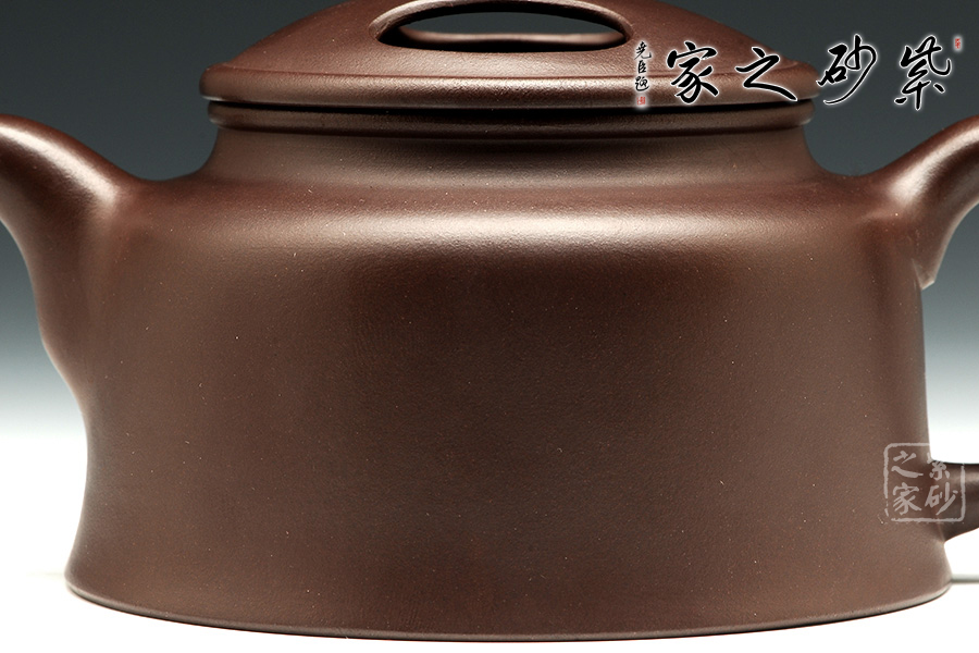 此壺壺身呈圓柱筒狀,其將生硬加工的線條感覺演變?yōu)榍€。短頸,寬口。肩部收斂成口,外包口沿。短嘴,彎流,出水流暢。壺柄耳大圓潤,略呈方形。壺蓋做的很精致,壓蓋,與壺口緊密結(jié)合,口蓋整體平整光滑,外形流暢。壺鈕制作別出心裁,采用了牛鼻孔式的鏤空結(jié)構(gòu),生動與趣味完美結(jié)合。蓋沿,口沿為母子線。