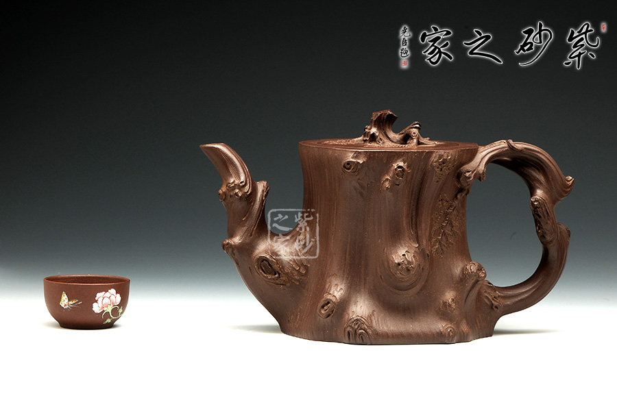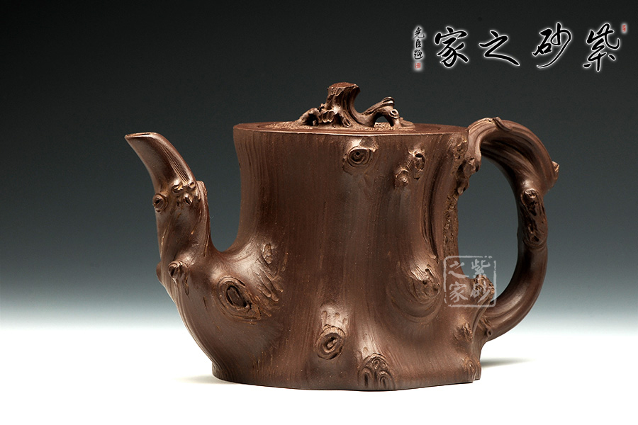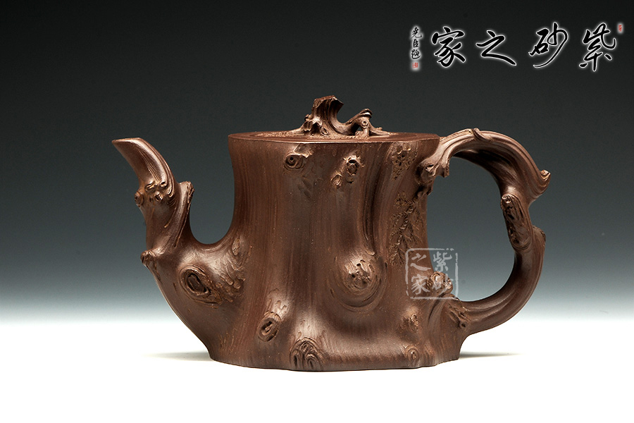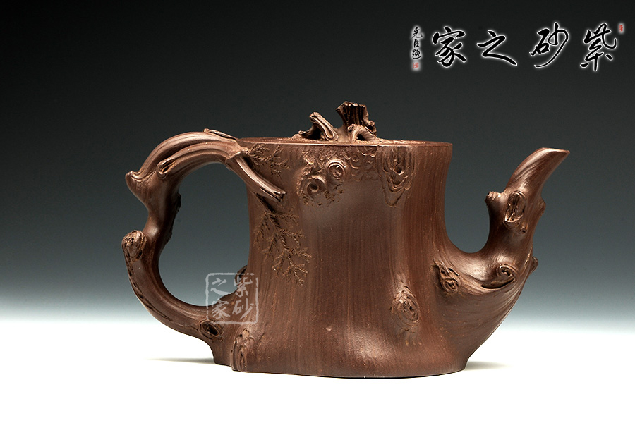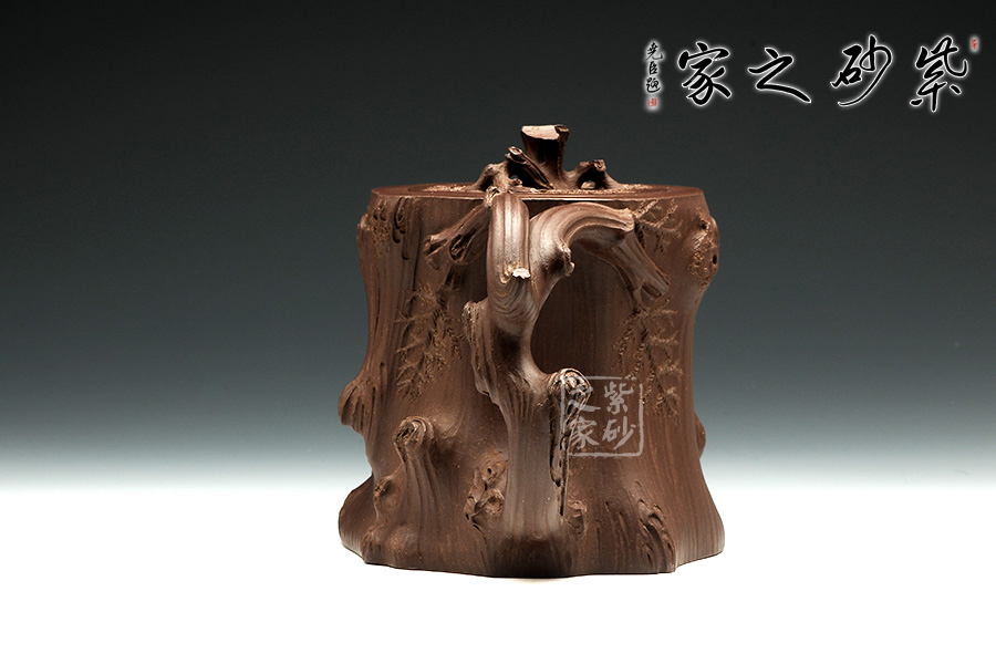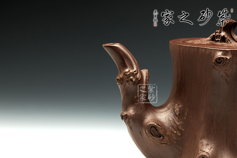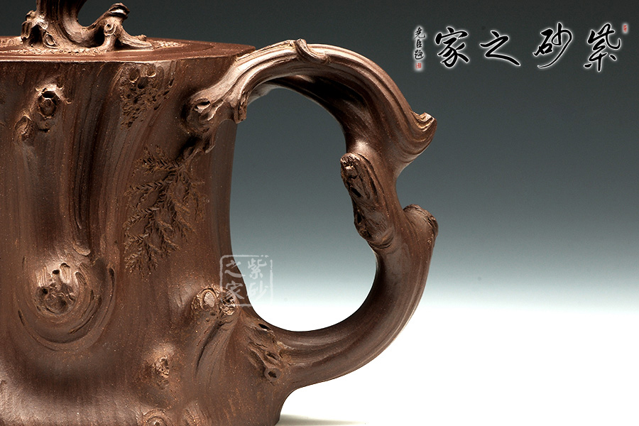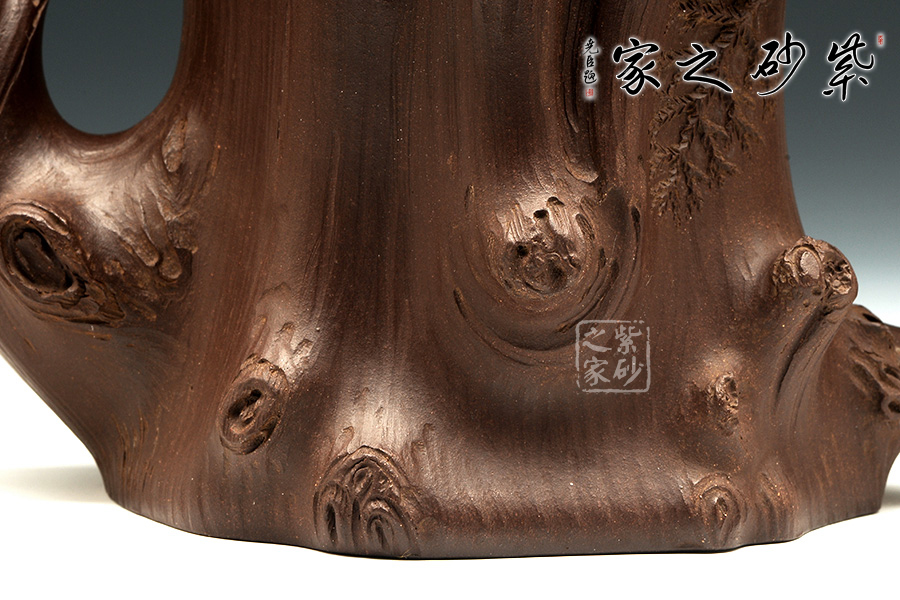 寶器以千年柏樹樁為型,不規(guī)則的造型使其創(chuàng)作難度更大,選用上乘的紫泥,洗練的雕琢出柏出獨(dú)有肌理紋路;經(jīng)過歲月洗禮的結(jié)疤自然排布,壺把為柏枝彎曲成形,上部化為兩支彎曲后合于壺體,枝頭生有柏葉,葉脈清晰精當(dāng)。嘴把與壺身處由粗到細(xì)的藝術(shù)處理,表現(xiàn)出張力十足;壺鈕為一段頗似假山造型的柏枝段伏于平蓋之上。整器詮釋了圣柏蒼勁老練、氣勢橫生、蒼翠而富有生命的魄力。