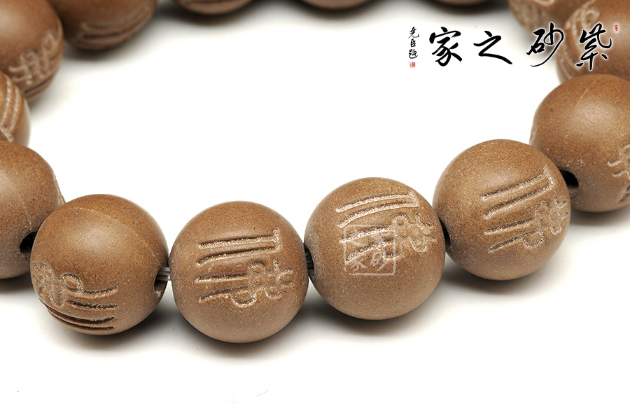 此手串用紫砂泥制作,色澤暗中流光,深沉內(nèi)斂。每個(gè)圓珠都大小一致,內(nèi)刻佛字,禪意盡顯,外觀渾圓且泛著光澤。這手串可與其他的擺件搭配,讓人安神。