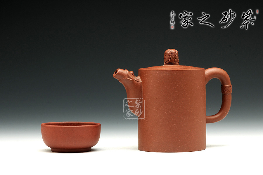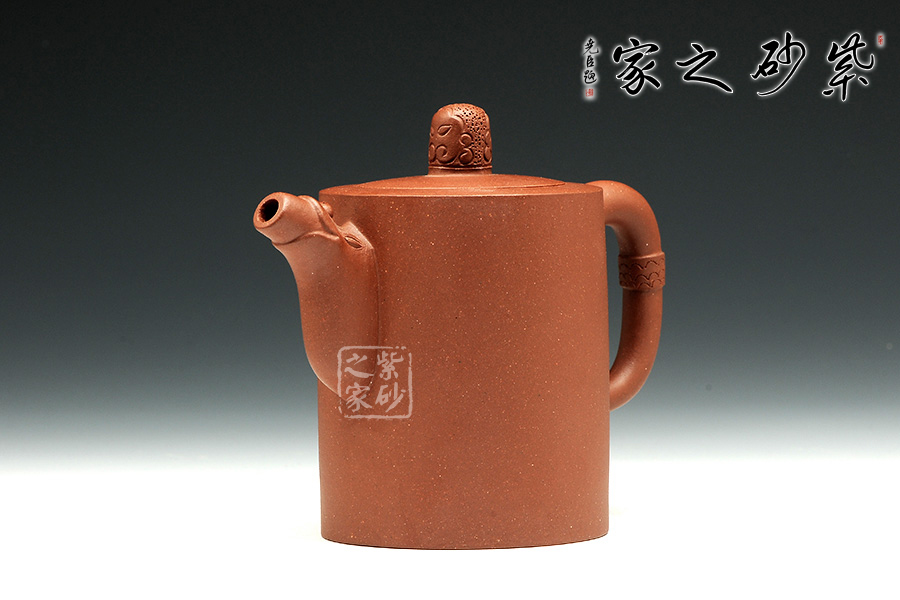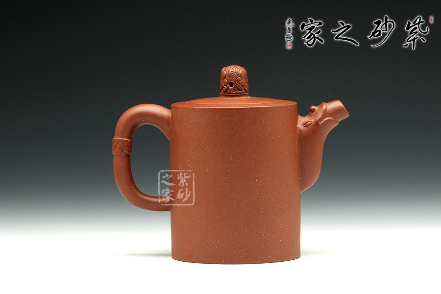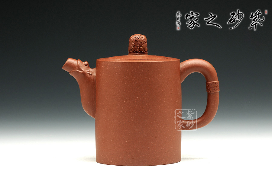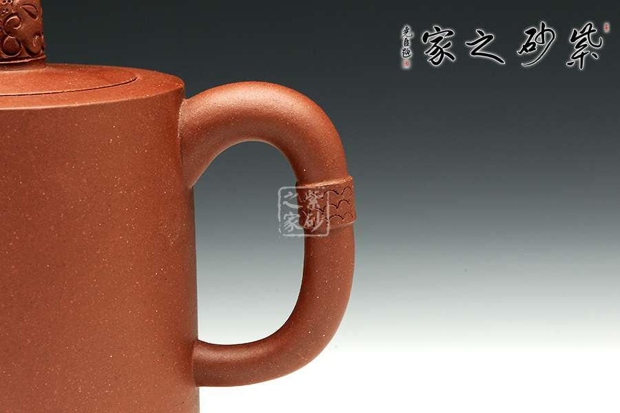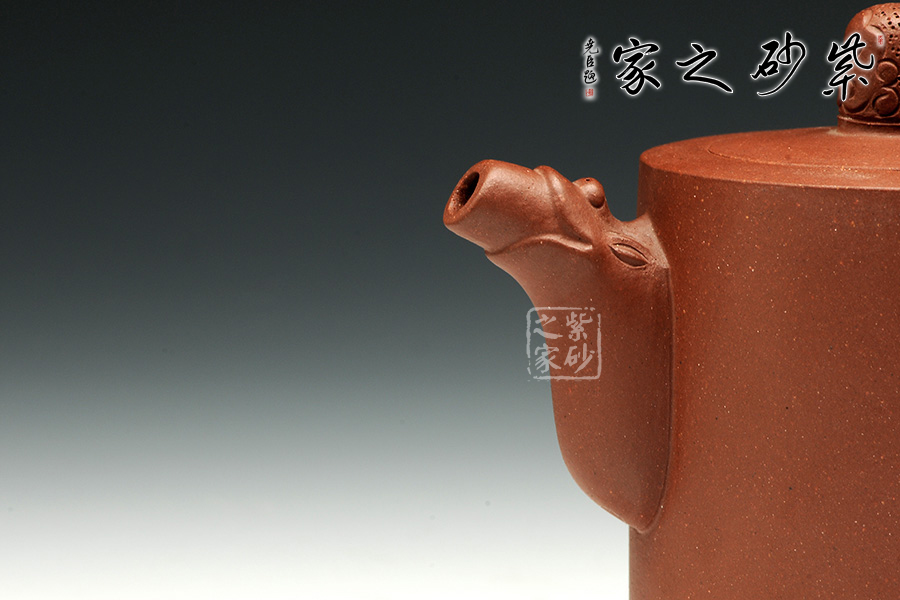 壺身筒圓,圓底設計,讓此壺顯得古雅端莊。壺口與肩頸呈同一平面,簡潔自然,嵌蓋一體。蓋上的壺鈕古樸而生動,似遠古的圖騰。壺嘴和壺把設計非常簡單,但絕對是非常精妙。壺嘴上斂下豐,口部平整,似潛龍出水,樸實巧妙。壺把呈圓環(huán),古樸似玉玦,以紋飾妝點,與壺鈕呼應。