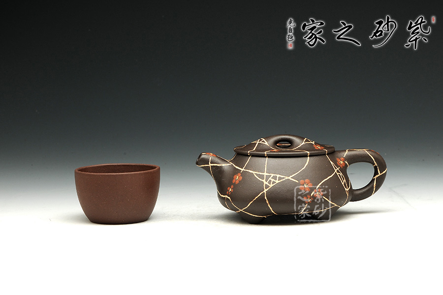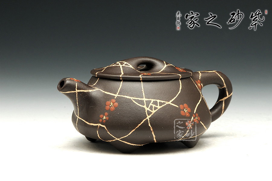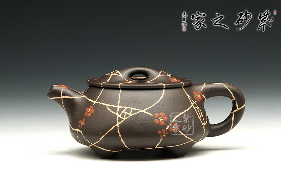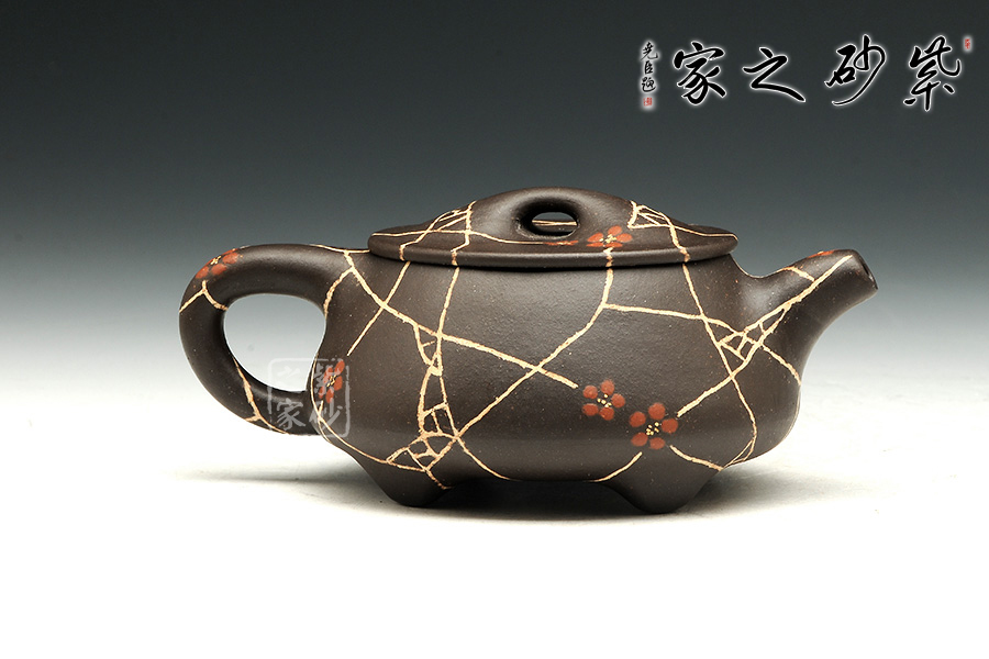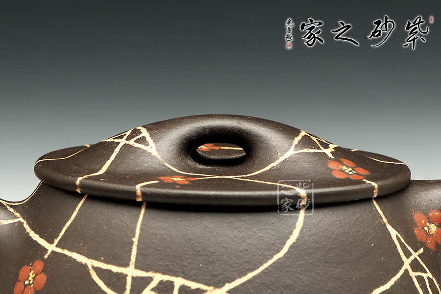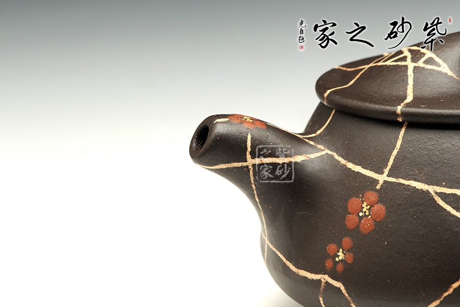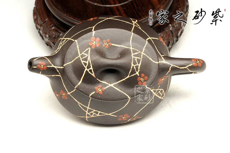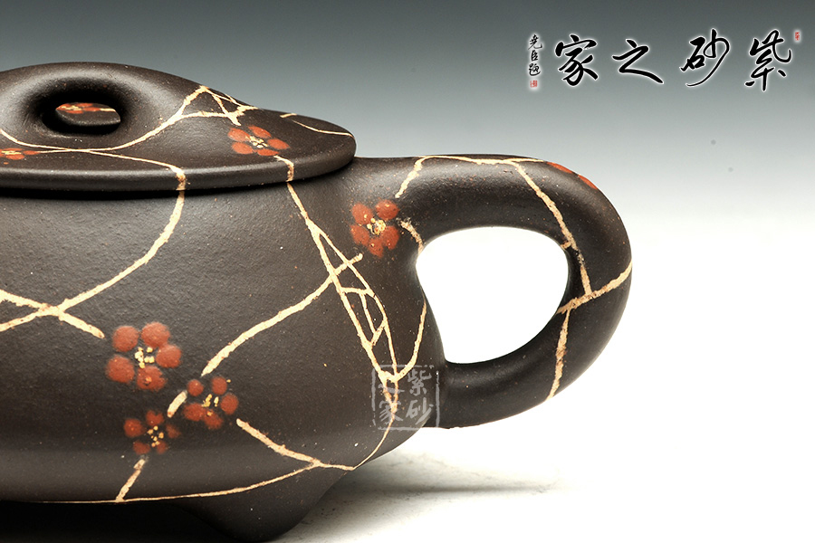 此款壺以石瓢為造型,簡(jiǎn)練凝實(shí),敦實(shí)調(diào)和。壺的體形是以兩條拋物線結(jié)合而成,一條是從口到底的轉(zhuǎn)角處,一條是底中心至底的轉(zhuǎn)角處。兩條拋物線略有不同,壺把剛中有柔,和順有勁。壺嘴直流有力,保證了通暢的出水效果。壺身開(kāi)片裝飾非常獨(dú)特,紋理清晰,色彩分明,有一種古拙的意味,通身梅花妝點(diǎn),則讓人倍感內(nèi)斂不同。