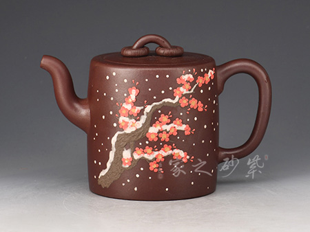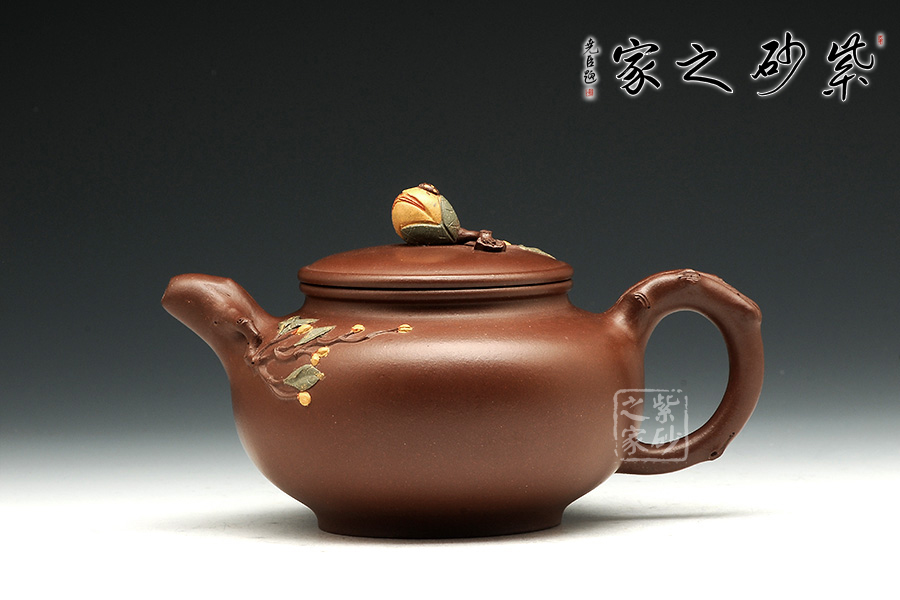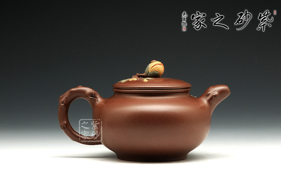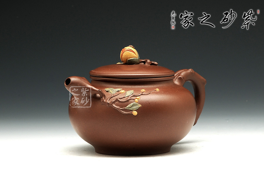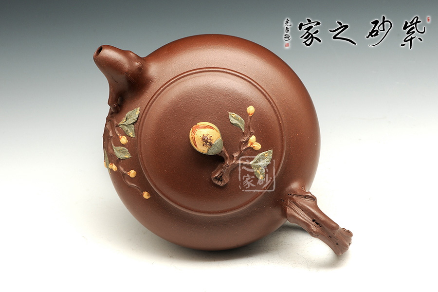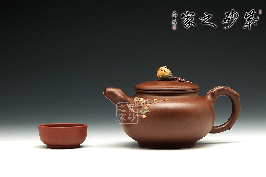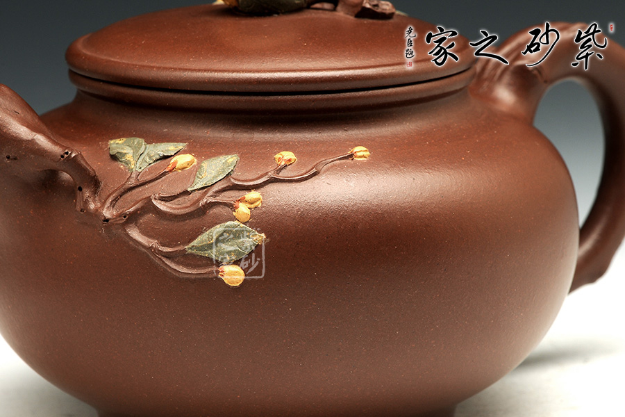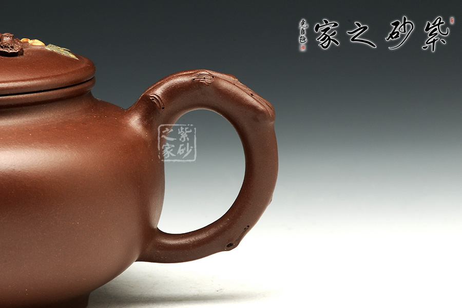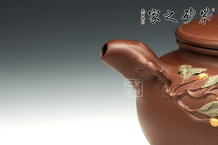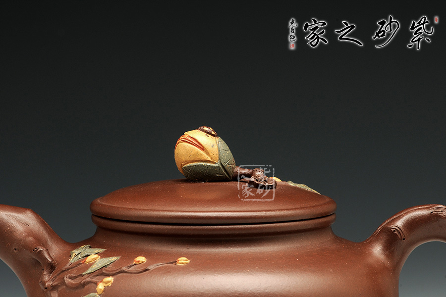 此款報春壺精選原礦紫泥泥料制作而成,色澤細膩,器型飽滿,整個造形都非常簡潔、大方,比例協(xié)調。此款作品,壓蓋與口沿子母線吻合嚴密,合成圓線飽滿,彎嘴,壺身點、線、面和諧統(tǒng)一,做工精湛,實用性佳。壺鈕為亮點,嫩黃的花苞含羞待放,做工精致,玩味盡顯!